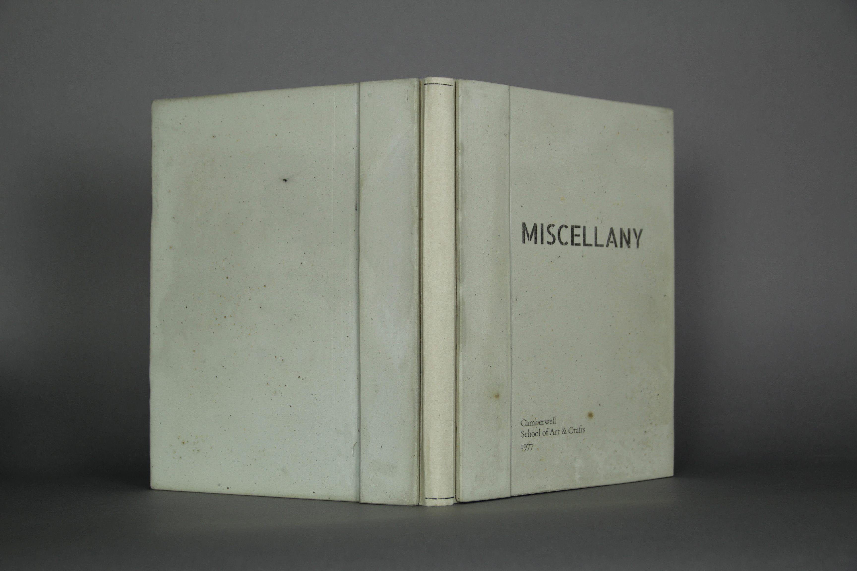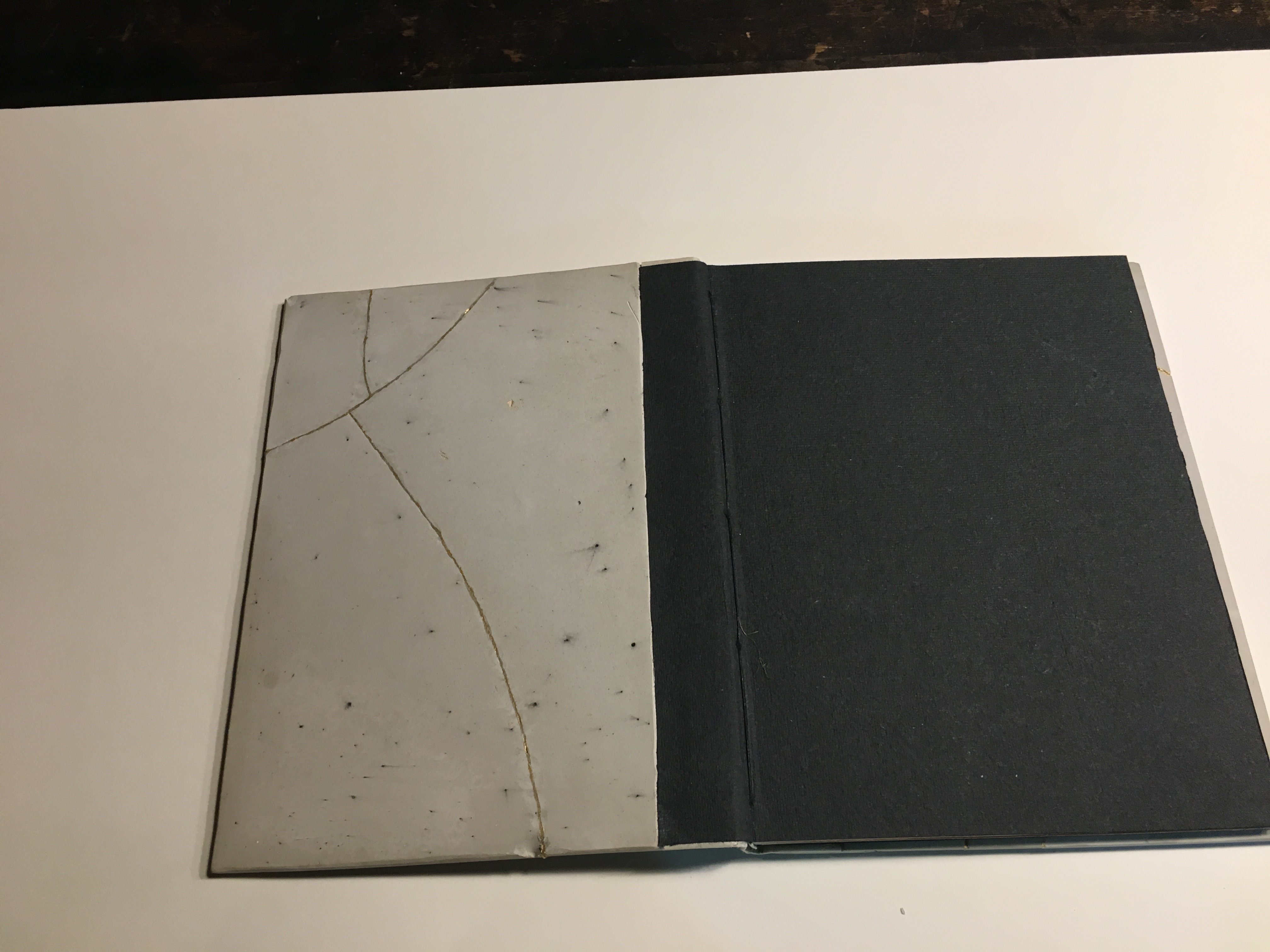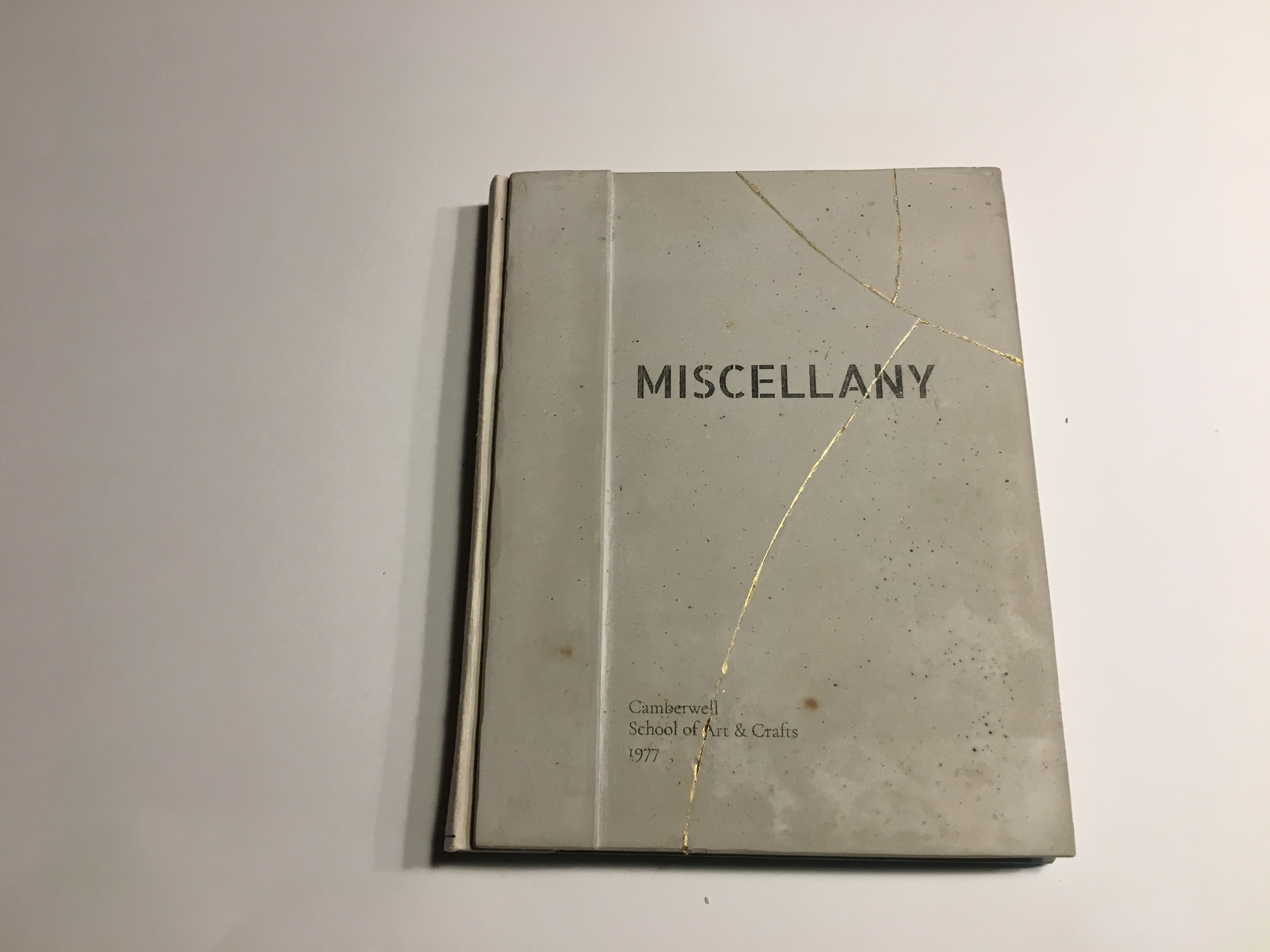 Another work of kintsugi-by-accident is Michele Emerick Brown‘s Miscellany, which began as an entry to the 2016 Guild of Book Workers’ binding exhibition. Sewn with a link stitch and of German paper case construction, it consists of printing examples from the bookbinding and restoration program at the Camberwell School of Art and Crafts, as it was known back in the 70s. Of more interest, its boards are made of Rockite (a concrete mix) and marble dust.