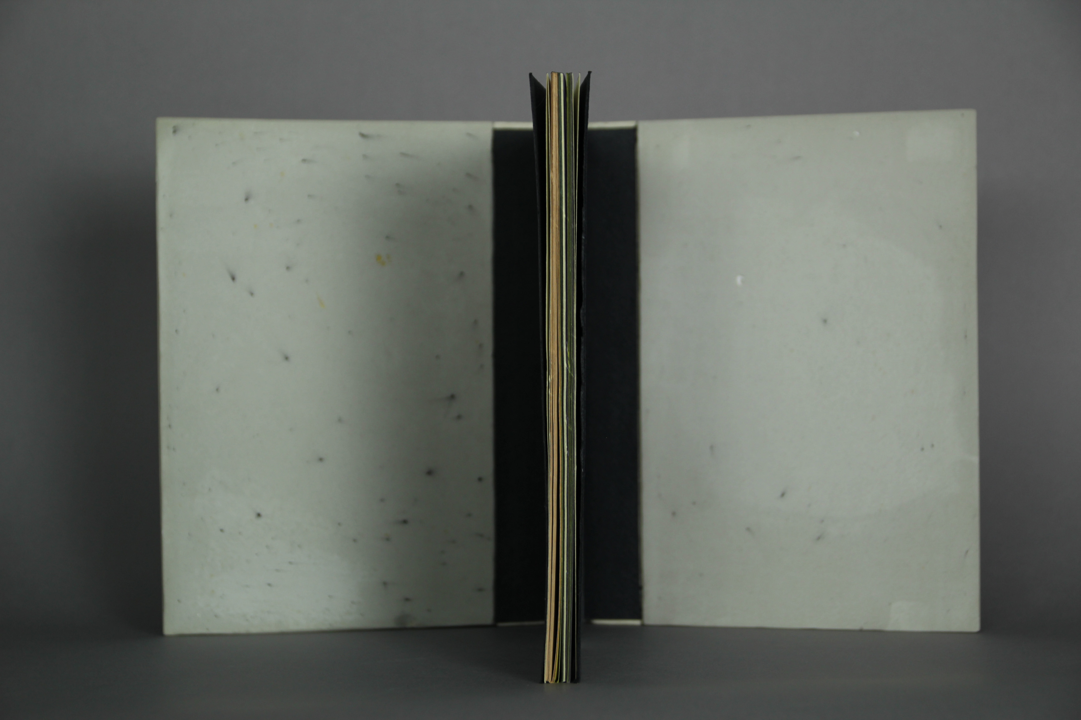 With the binding and her photography in Ebb and Flow, Jane Cradock-Watson has sculpted and painted the sea’s edge. Four digital photographs printed on Zerkal paper have been spliced together between two cloth-covered boards. The flexibility and extent of the concertinaed paper create an undulating structure that turns seascape stills into mesmerising cinema.