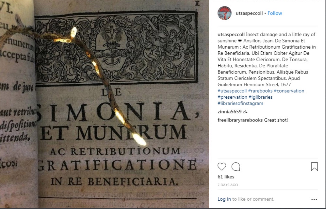Staff in Special Collections at the University of San Antonio libraries caught this sudden slant of sunlight on insect-damaged pages. It makes a good start for a serendipitous trek across conservation, book history and book art.