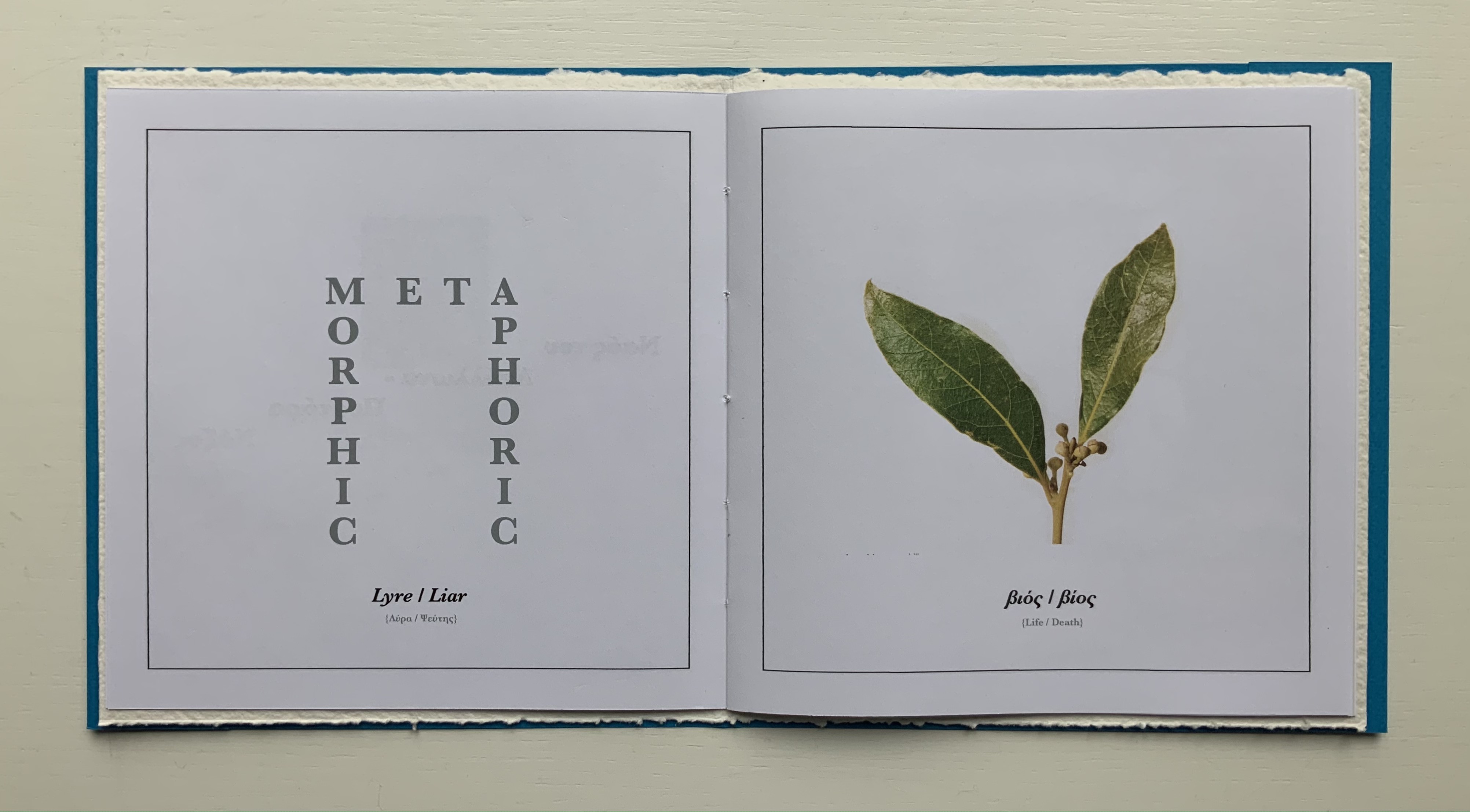Noble has expanded and intensified his small garden homage into a slender and rich work of book art. The sculpted structure of it — how the cover, pages, images and text work with each other — rhymes with Finlay’s art, Greek mythology and Nature. Noble’s choice of the portal to Apollo’s Temple to link the found brick and arch of marble fragments to Little Sparta and Finlay’s art finds one of its echoes in the cover’s cutout and the marble-white textured board behind it. Another echo lies in the words “metamorphosis” and “metaphoric” laid out to form an arch on the page below. And just as sonic echoes overlap one another, the words and image themselves echo across the double-page spread with the laurel leaf emblem of Daphne’s transformation to escape the pursuit of the lyre-bearing sun god and mythic patron of poets laureate.