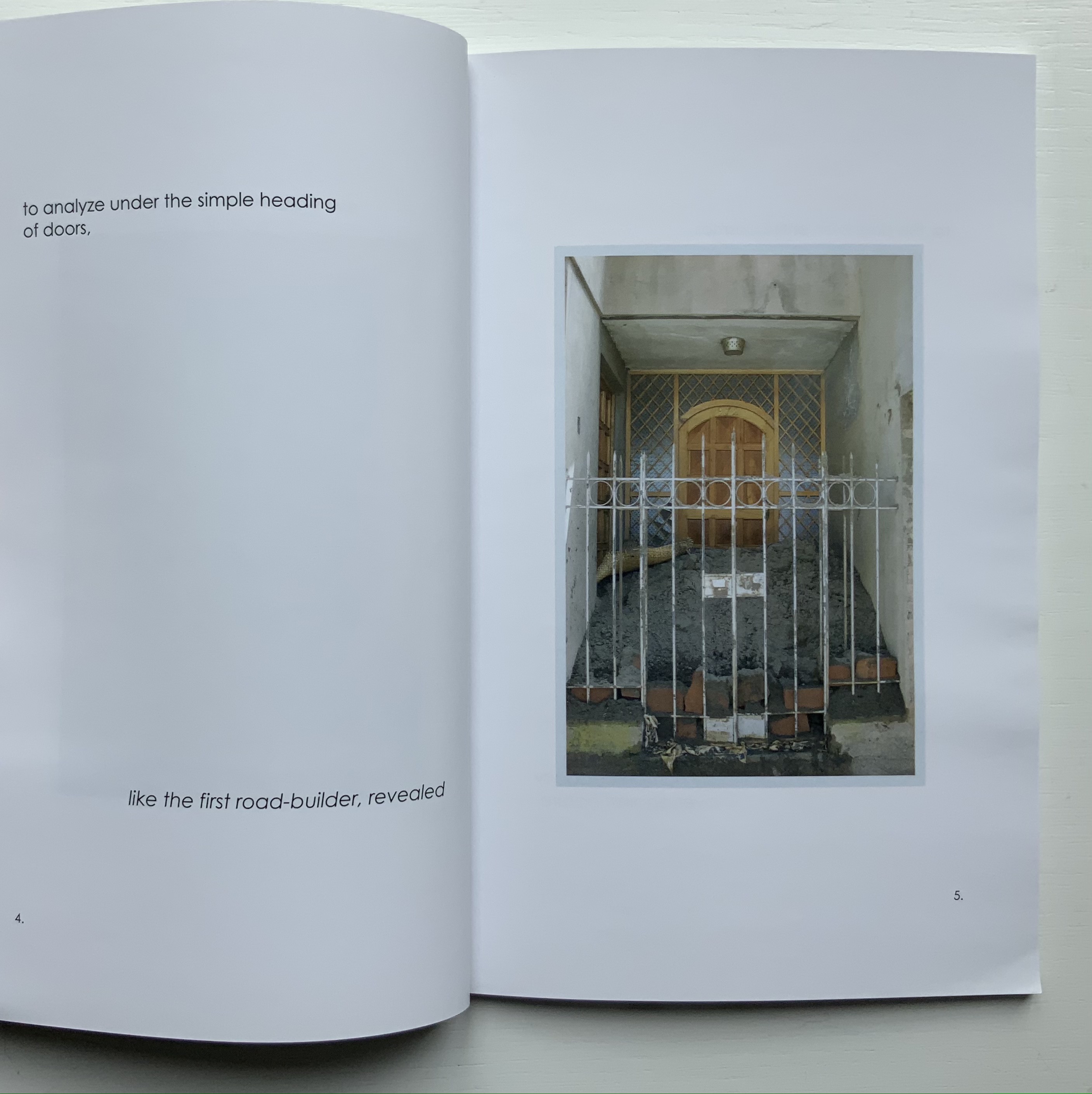 Like In Memoriam+, this work has its roots in location and a portal metaphor. While also employing juxtaposition of text and images as a structural device, it relies on images of a category of sought readymades (doors, gates and barriers) rather than a found object (like the garden brick on which the artist builds his arch) for a structuring device that is simultaneously material and metaphor.
