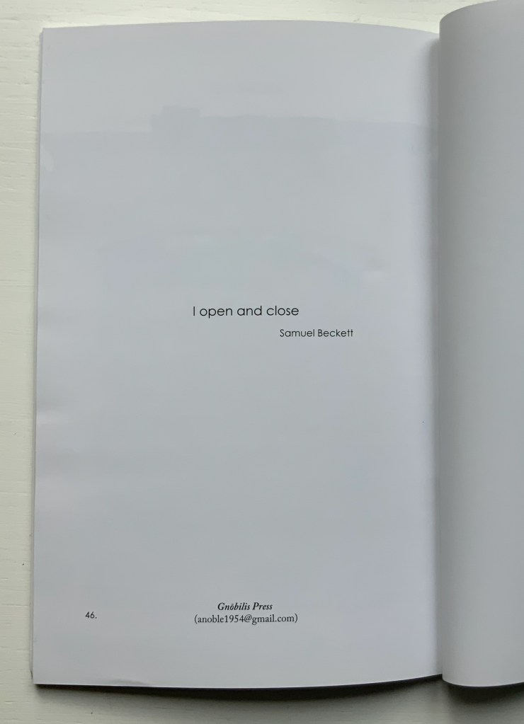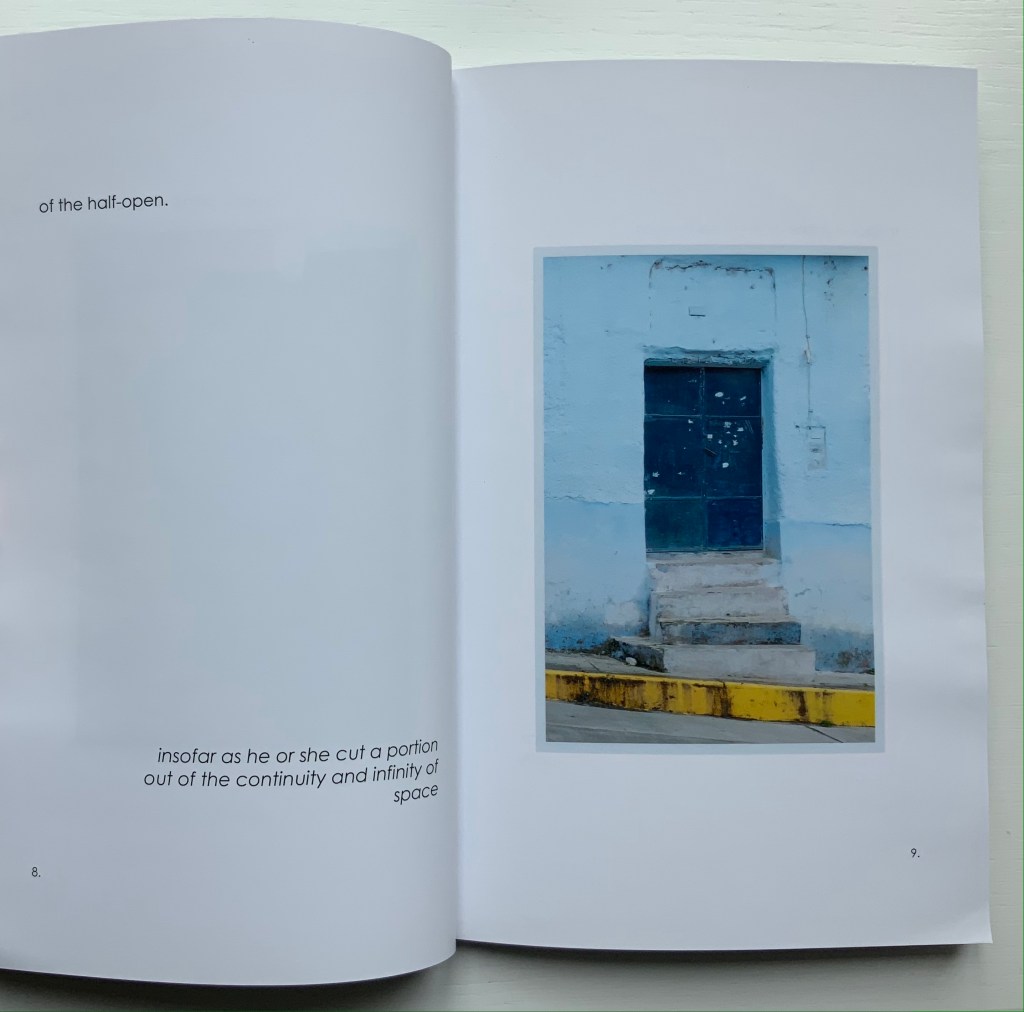 The way Noble uses his sources of text (Gaston Bachelard’s The Poetics of Space, Martin Heidegger’s “Building Dwelling Thinking” and Georg Simmel’s Bridge and Door) causes the reader/viewer to contribute to structure and metaphor. The first sentence of Bachelard’s excerpt begins “How many daydreams” and starts at the top of page 2; Heidegger’s beginning “The threshold” starts in the middle of page 26; and Simmel’s beginning “The human being” starts at the bottom of the page 2. Bachelard’s first sentence ends on page 8, Heidegger’s on page 28, and Simmel’s on page 12. Unless one has the mind of a symphonic composer or connoisseur, it is impossible to attend to all three excerpts simultaneously and turn the pages in one sequence. Instead, it is necessary to turn the pages back and forth along three tracks to absorb the excerpts, and the metaphoric effect is to open and close those doors, gates and barriers repeatedly, which is …