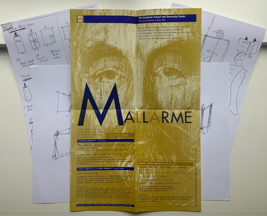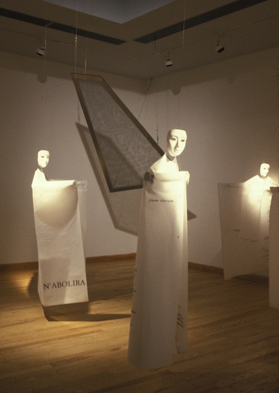 With Foldings, Noble joined forces with Kathy Bruce, his wife. Six masked dancers wear costumes that are in effect human-size folios across which the pages of Un Coup de Dés have been printed front and back in French. As a prerecorded English translation is read by numerous voices corresponding to the changing fonts, the dancers rotate and display the lines being read. A performance was given as part of the exhibition A Painter’s Poet, held at the Leubsborf Art Gallery (Hunter College). This fell under the aegis of the Millennium Mallarmé celebrations in New York, the poster for which can be seen above overlaying the staging sketches for the performance. Later, as part of an installation under the title Navigating the Abyss (Brookdale Community College, Lincroft, New Jersey), the costumes were suspended from the ceiling along with a framed screen mesh reminiscent of Noble’s As if / As If (see above).
