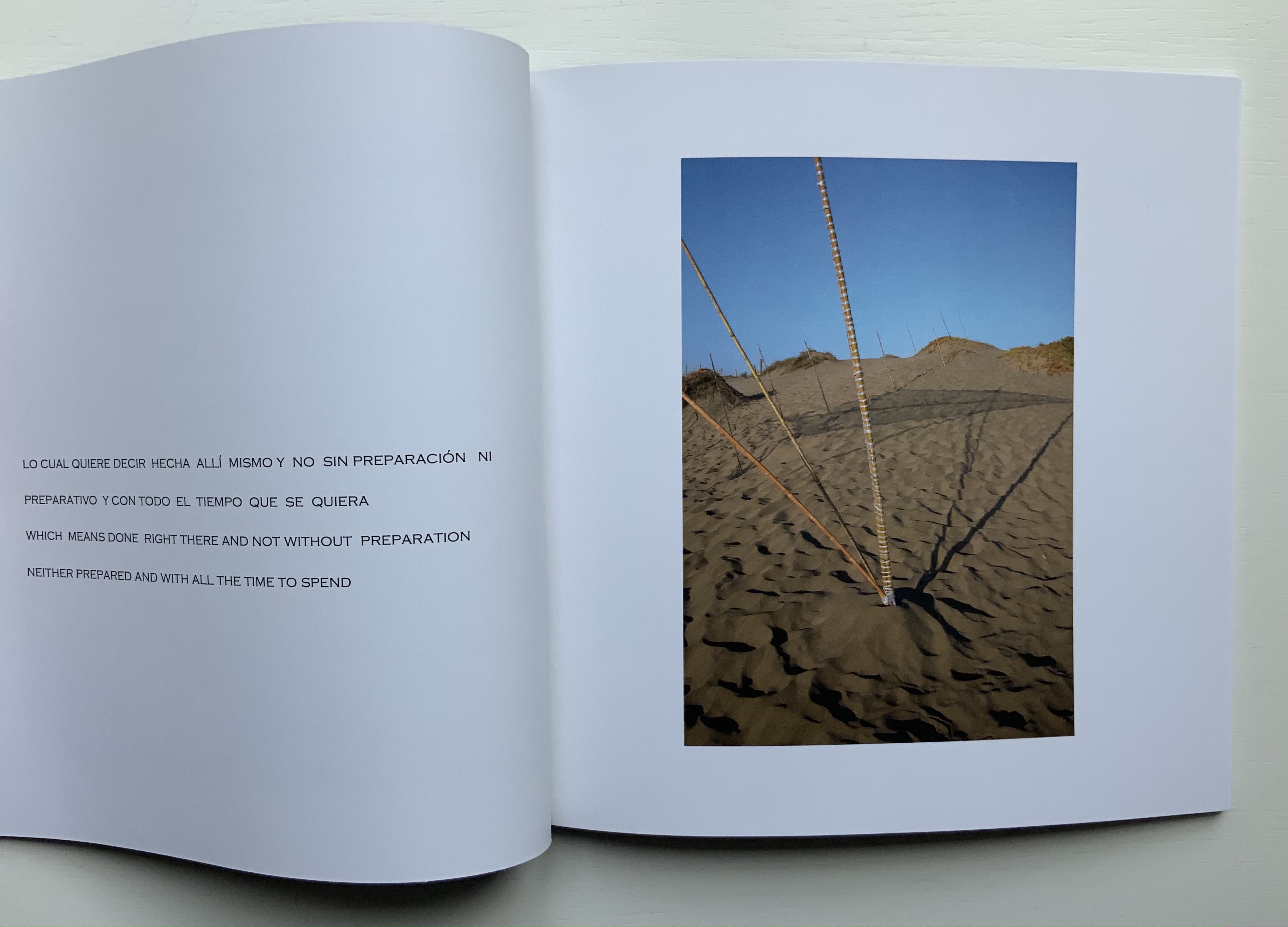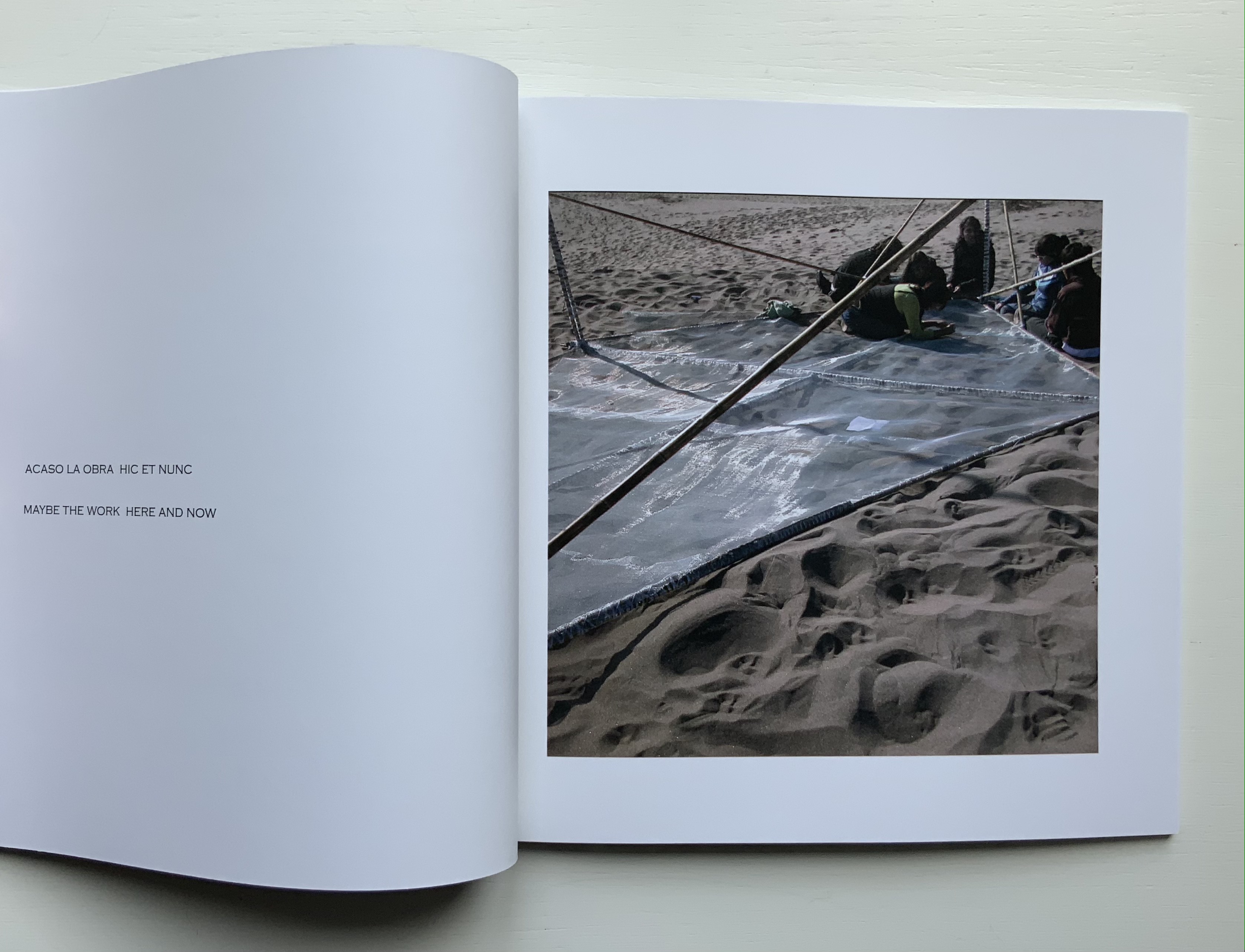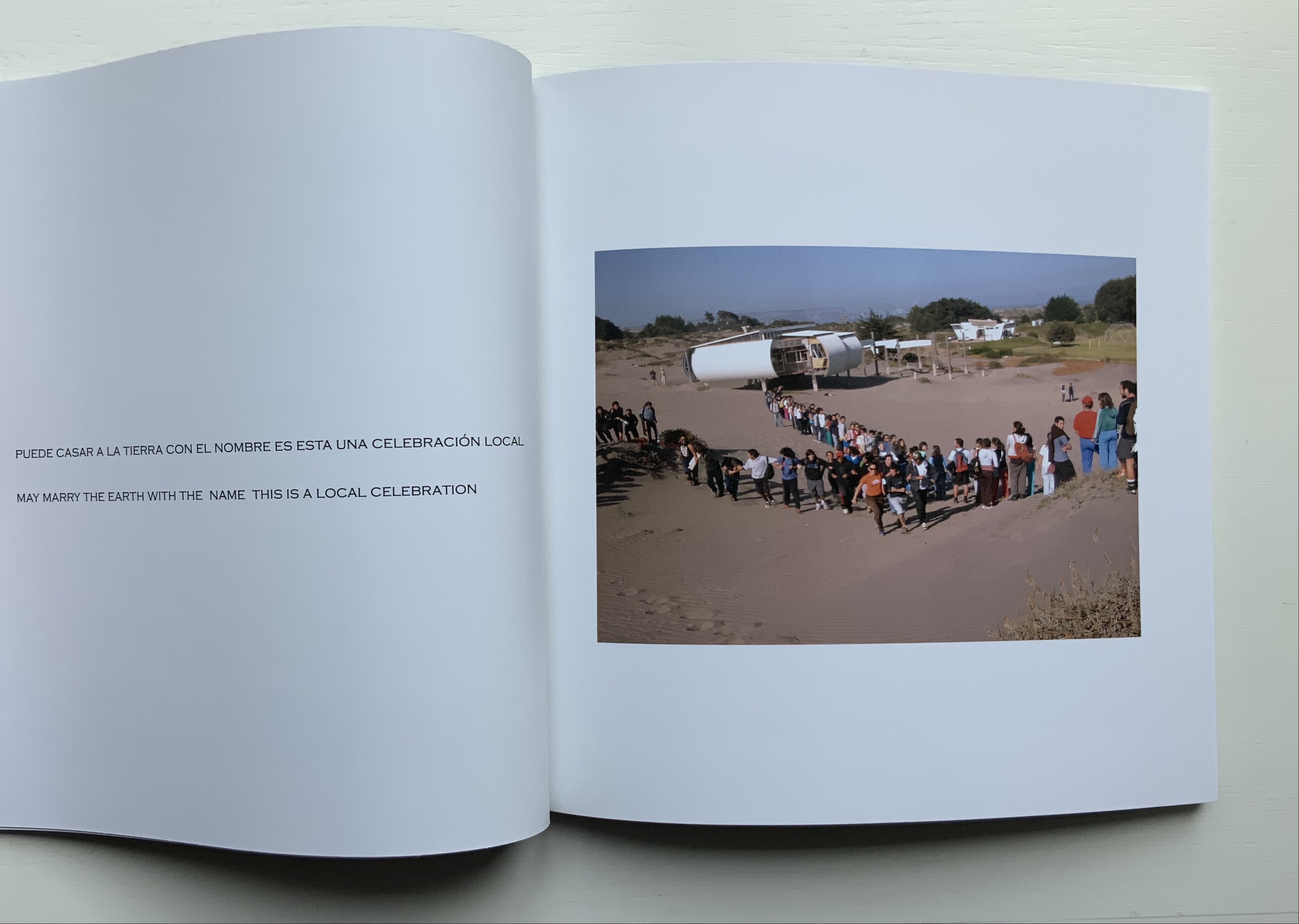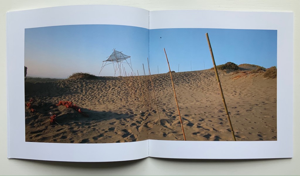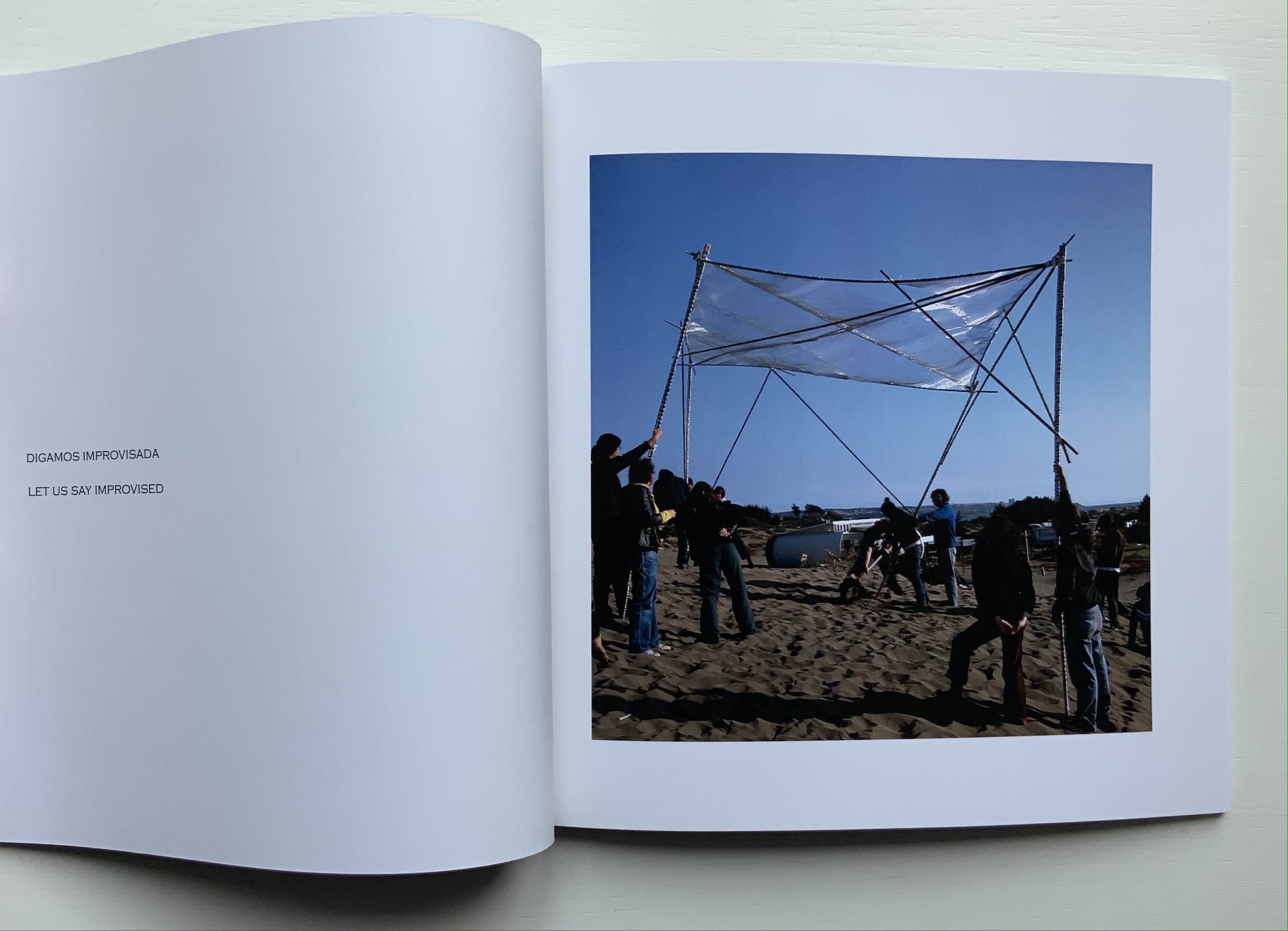 The actual sculpture is but a piece of a larger collective artwork consisting of Manuel F. Sanfuentes Vio’s reading from the Amereida, the students’ procession in the shape of the Southern Cross to the site selected by Noble, the collective construction of the kite, the planting of poles and the placement of the kite on them — and of course this book that photographically documents the performance of the installation and textually presents the read passages of the Amereida.