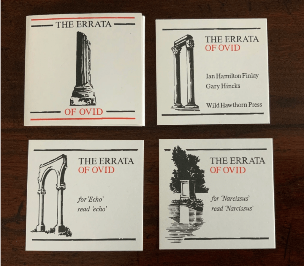 The Errata of Ovid (1983/4) Ian Hamilton Finlay, Gary Hincks Miniature portfolio. H76 x W80 mm. Offset printed in red and black, eight loose cards enclosed in a flap folder. Typeset in Bruce Old Style(?); illustrations by Gary Hincks; card stock unknown. Acquired from Woburn Books, 31 October 2019. Photos: Books On Books Collection