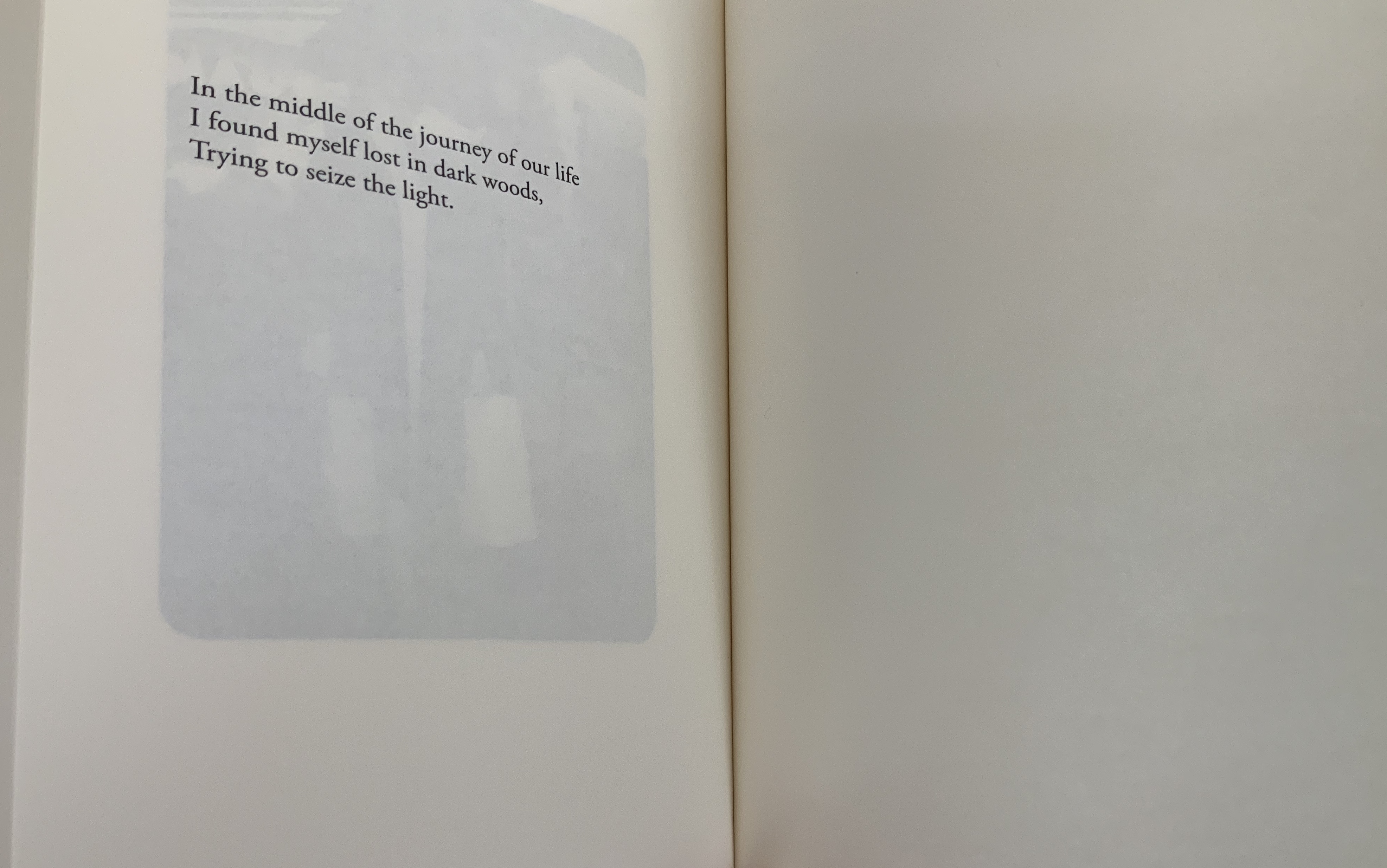 Tonnard pairs images of 90 solitary people walking alone in nighttime city streets with 90 different English translations of the first lines of Dante’s Inferno. The images come from the Joseph Selle collection at the Visual Studies Workshop, which contains over a million negatives from a company of street photographers working in San Francisco from the 40’s to the 70’s. Male or female, Caucasian or Asian or African-American or Latino, the images are, as she puts it, “re-expressions of each other”. Likewise, the various translations are re-expressions of “Nel mezzo del cammin di nostra vita mi ritrovai per una selva oscura ché la diritta via era smarrita.”
