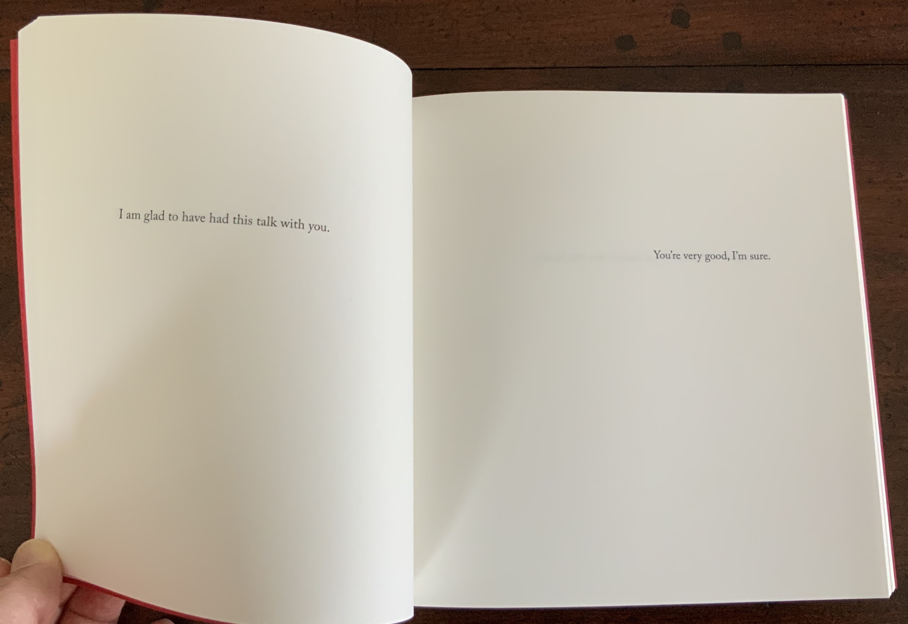 By title and comment, Tonnard emphasizes that we are following “a” dialogue, not a series of dialogues: “A dialogue is formed from the random meetings of these phrases. It is a dialogue in the purest sense, a dialogue that expresses nothing other than itself.” Likewise, with a prefatory quotation from Malone Dies and the book’s “empty-room” square format, Tonnard pointedly places “I” and “You” in the tradition of Samuel Beckett’s dramatic dialogues. Going a step further in that direction, she has put together Project Gutenberg’s anonymous volunteers’ recordings of Kleiser’s book and staged audio installations in venues such as the Meermanno Museum in The Hague and the Sheffield International Artist’s Book Fair 2011. In this video, she speaks of the work at the 9’10” mark.