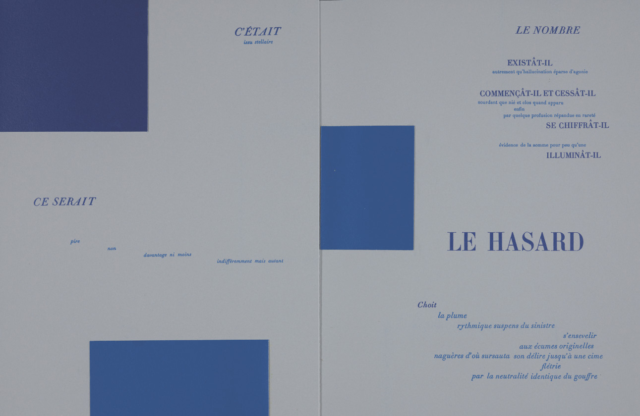 Since the 1960s when Ernest Fraenkel, Mario Diacono and Marcel Broodthaers blotted out the text of Mallarmé’s poem Un Coup de Dés Jamais N’Abolira le Hasard (1897) to create their works of homage, numerous others have expanded on the technique: substituting images of sonograms (Sammy Engramer, 2009) or algorithmically generated abstractions (Eric Zboya, 2018, and Benjamin Lord, 2019), or excising the text (Michalis Pichler, 2008, and Cerith Wyn Evans, 2008) or algorithmically erasing it (Jérémie Bennequin, 2009) — just to name a few.