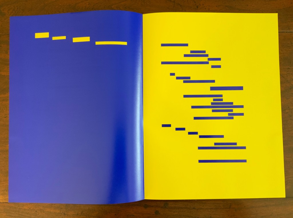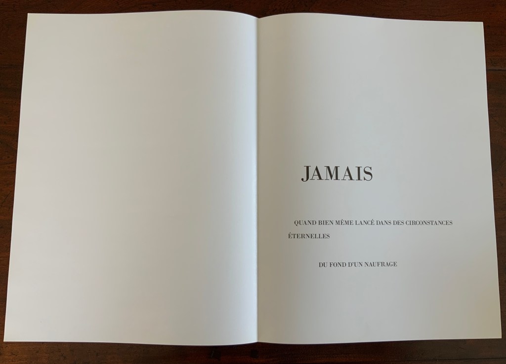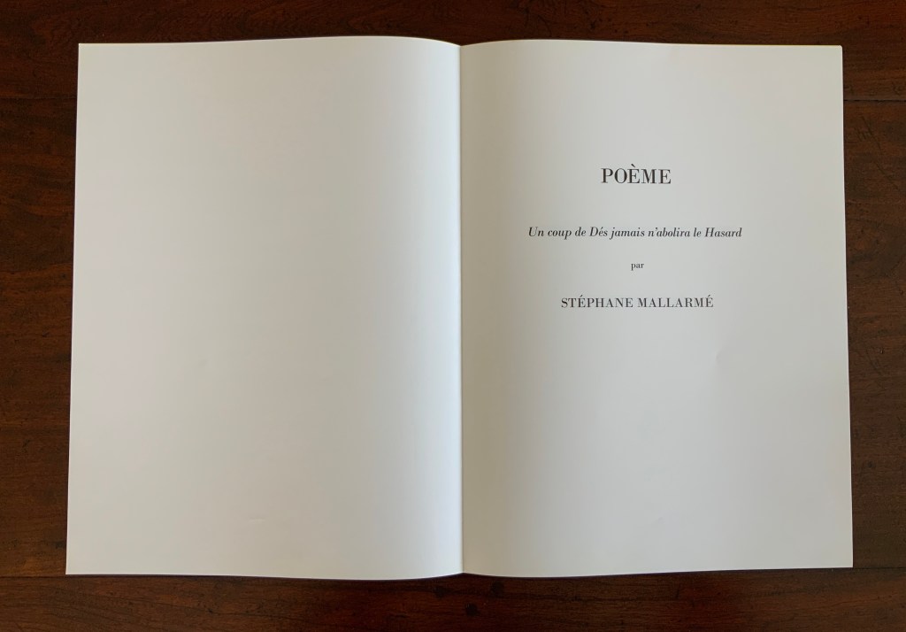 In the 2018 display of Après Un Coup de Dés, the previously gathered but now unfolded sheets and cover lie side by side under glass. Often this is cause for complaint about the distanced display of artist books. In the case of Après Un Coup de Dés, the distance effectively draws point-blank attention to what the privileged reader gradually discovers in handling the work. The unprivileged reader may have to imagine the making, unmaking and remaking of the book but, confronted with the gestalt of the undone gatherings and their registration marks, that reader immediately sees/witnesses the void defined by a void.