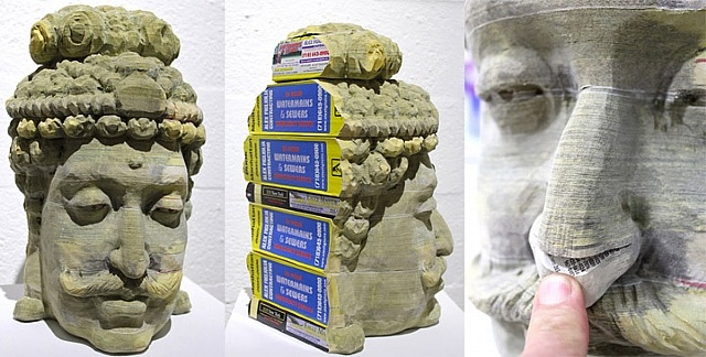 This video accompanies the exhibition entitled Rebound: Dissections and Excavations in Book Art. Curated by Karen Ann Myers, Assistant Director of the Halsey Institute, Rebound brings together the work of Doug Beube, Long-Bin Chen, Brian Dettmer, Guy Laramée, and Francesca Pastine. Of the five, Chen and Laramée’s pieces have the greatest superficial resemblance to one another, and while it seems that their difference in import could not be greater, perhaps they come to same point. The apparently stone heads of the Buddha come from the East “to care for” the millions of individuals in the West whose names and addresses appear in the telephone books from which the heads are sculpted. Laramée’s mountains are “erosions of disused knowledge,” returning “to that which does not need to say anything, that which simply IS.”