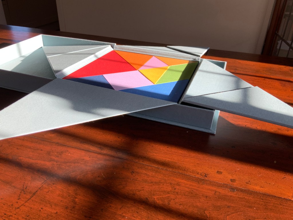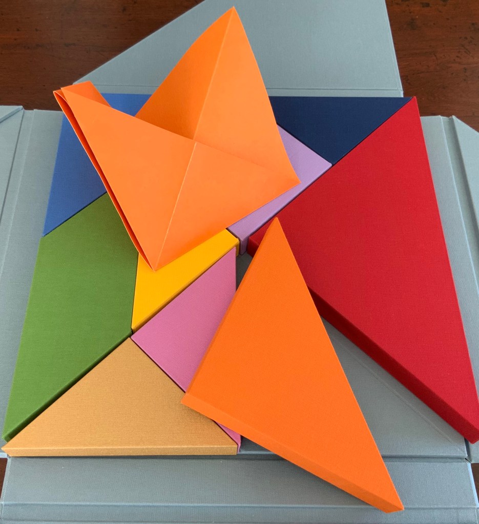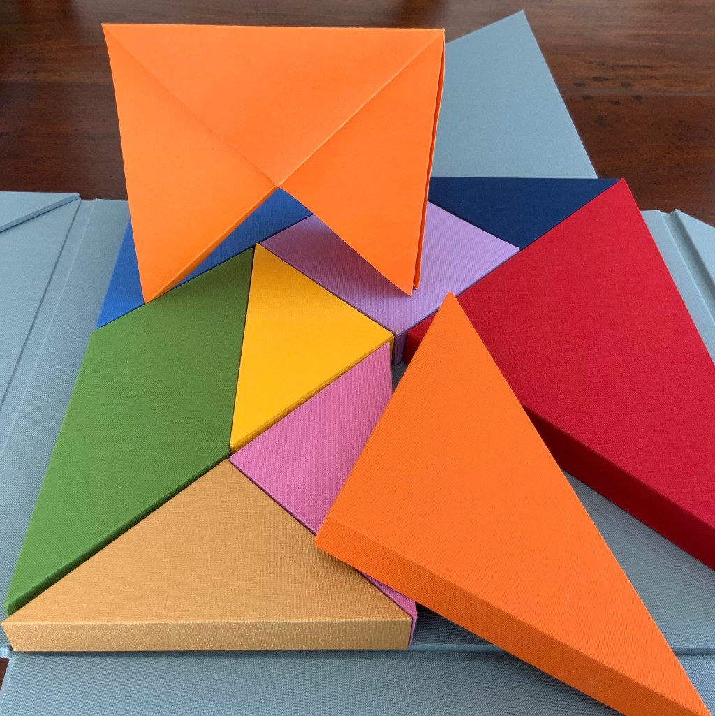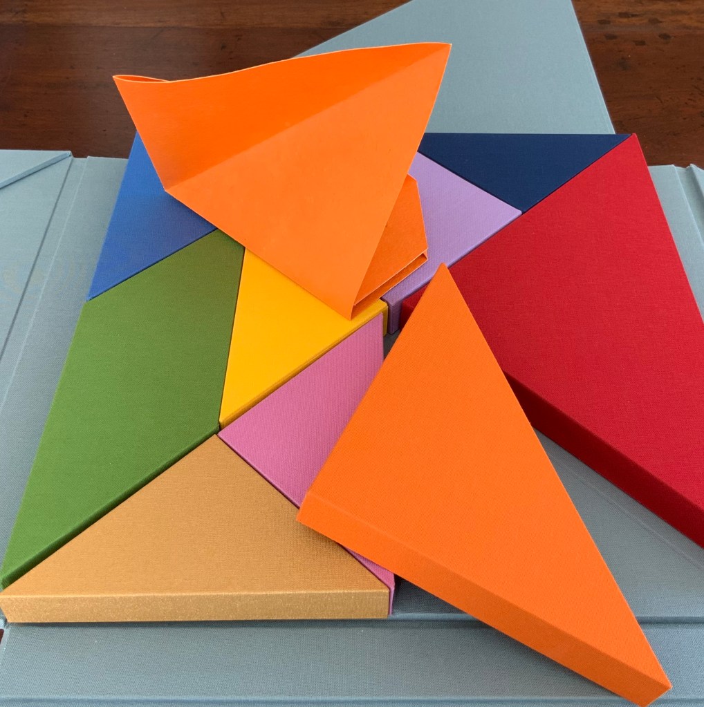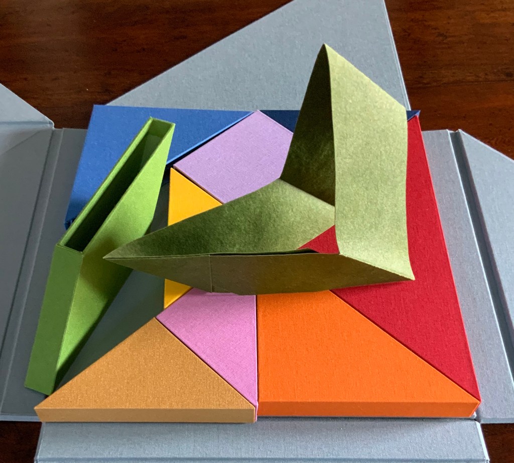 But where is the human soul manifest among these colors and forms?According to Neo-Pythagorean philosophers numbers, string vibrations, musical notes, colours and form have fundamental, metaphysical relationships. Pythagoras himself is thought to have said “colour is form, and form is colour”. Then there is Pythagorean Numerology that holds that a person’s date of birth can be distilled into one number (a root number) between 1-9, that each number is associated to a colour, and that each colour aligns with certain inner traits and life purposes. So within a box of grey (the color of universality), there are the nine colours of humanity: We are, making Nous Sommes a startling integration of book art, Pythagoras, numerology, tangrams, origami, papermaking, boxmaking, binding and printing.