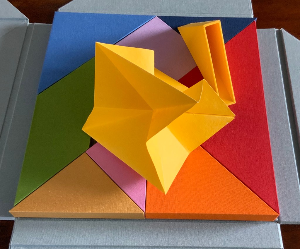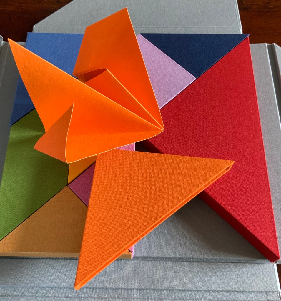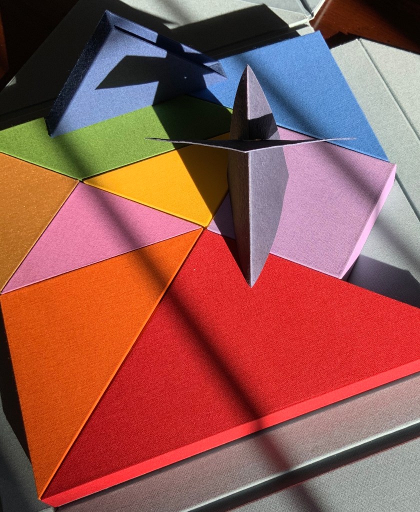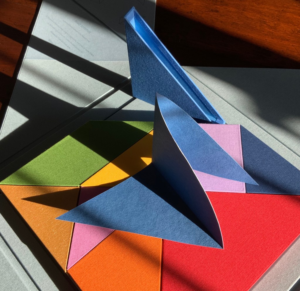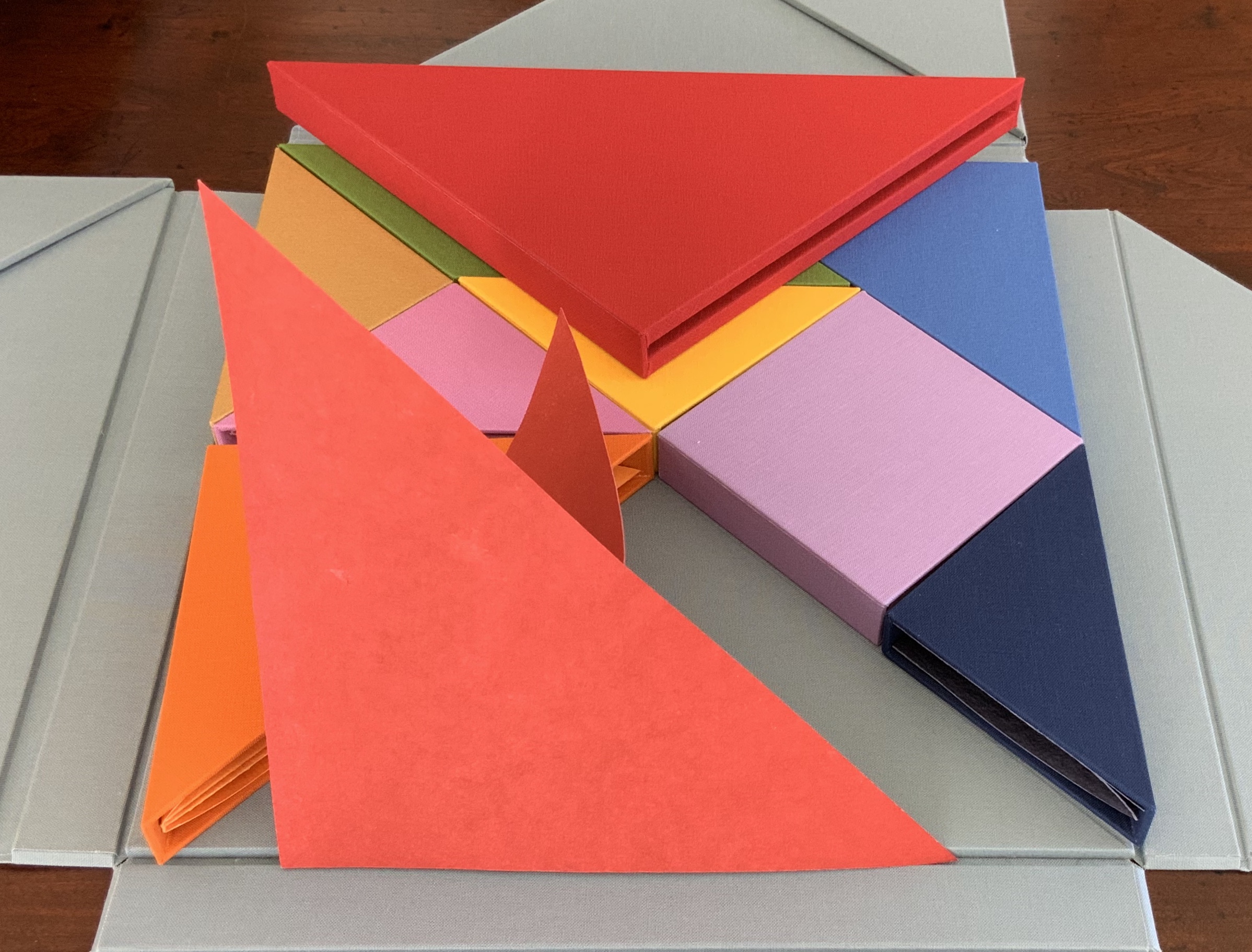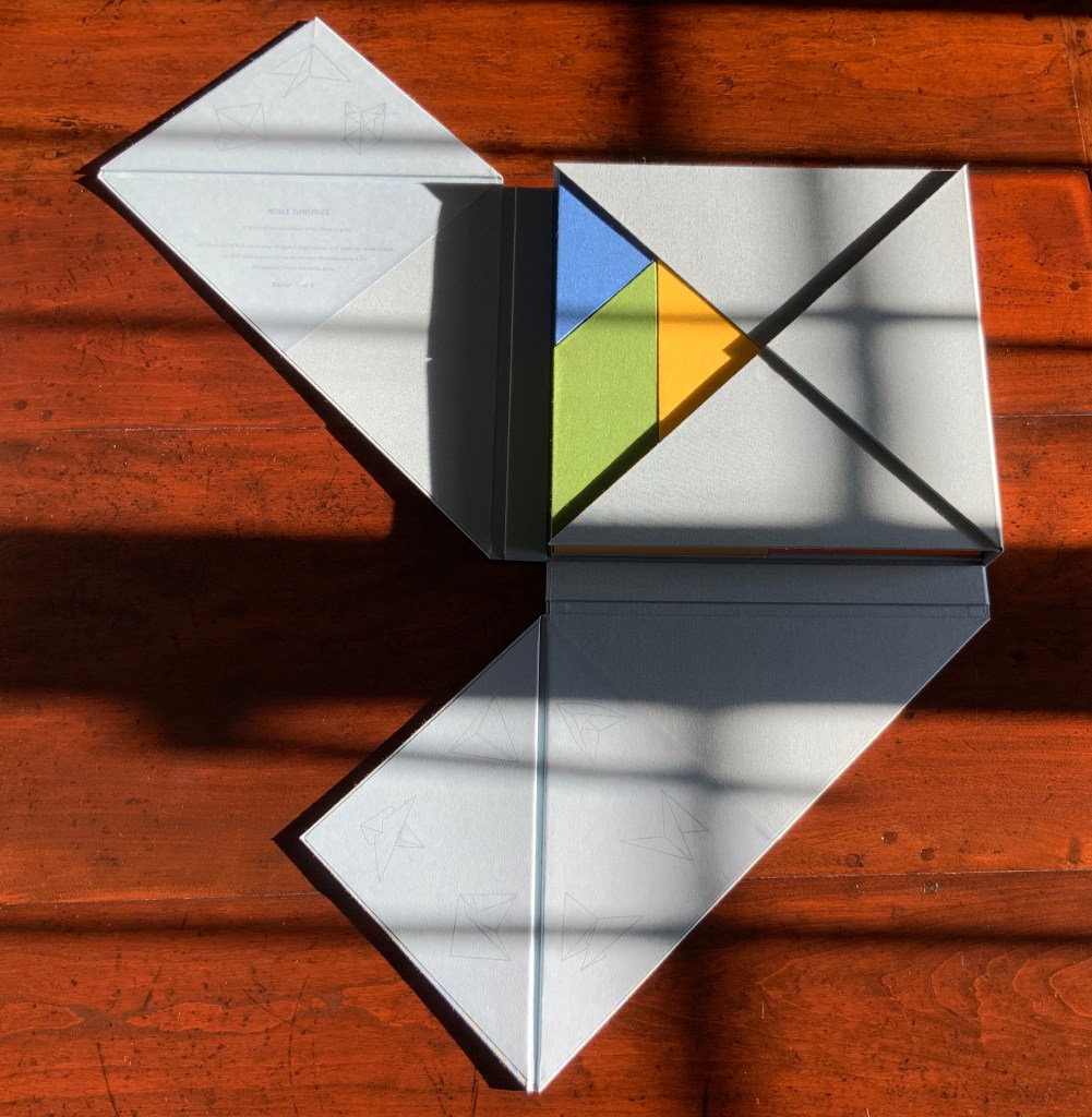 But where is the human soul manifest among these colors and forms?According to Neo-Pythagorean philosophers numbers, string vibrations, musical notes, colours and form have fundamental, metaphysical relationships. Pythagoras himself is thought to have said “colour is form, and form is colour”. Then there is Pythagorean Numerology that holds that a person’s date of birth can be distilled into one number (a root number) between 1-9, that each number is associated to a colour, and that each colour aligns with certain inner traits and life purposes. So within a box of grey (the color of universality), there are the nine colours of humanity: We are, making Nous Sommes a startling integration of book art, Pythagoras, numerology, tangrams, origami, papermaking, boxmaking, binding and printing.