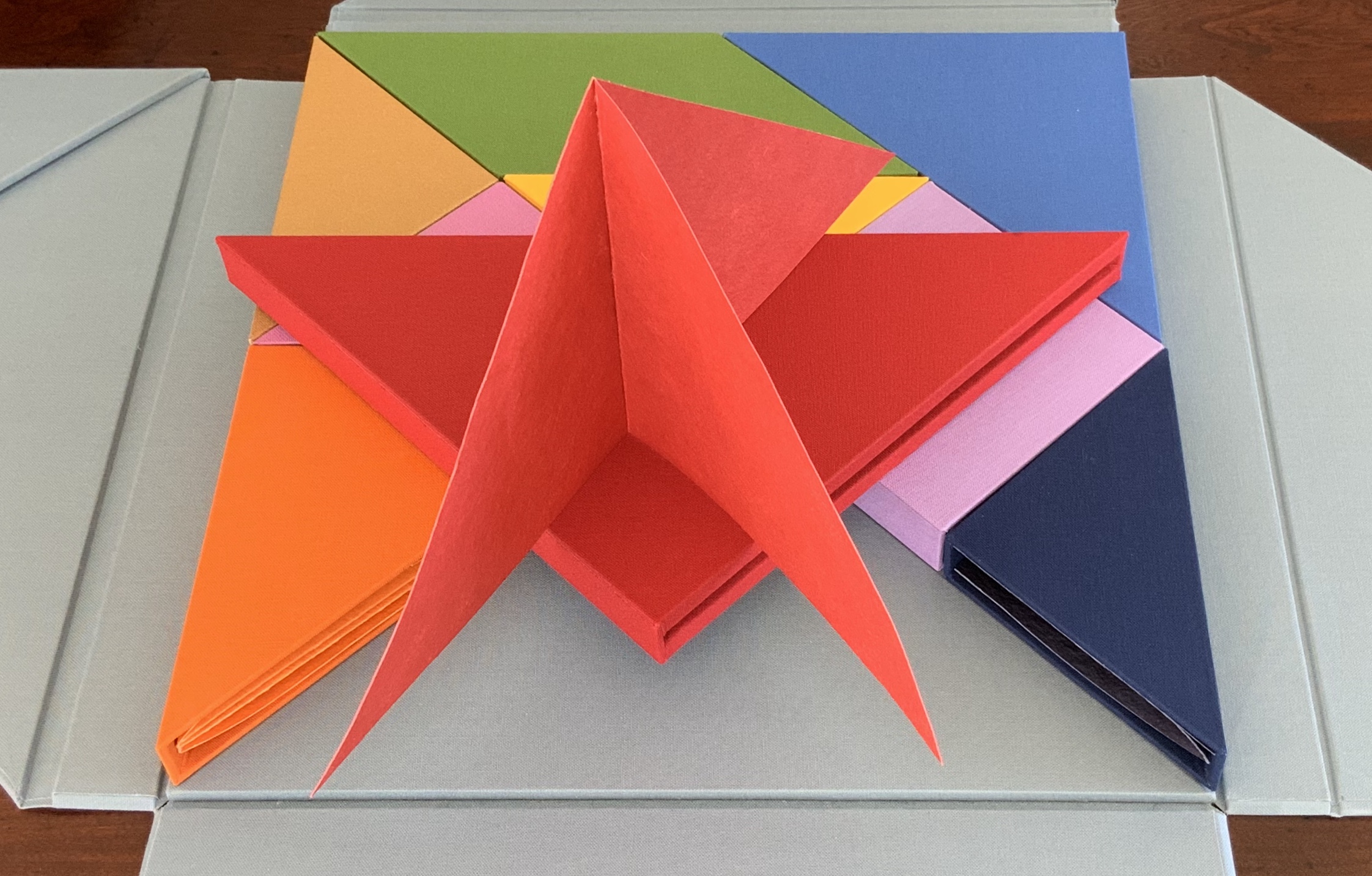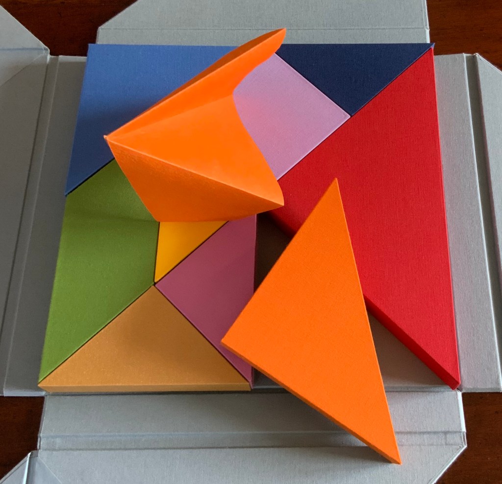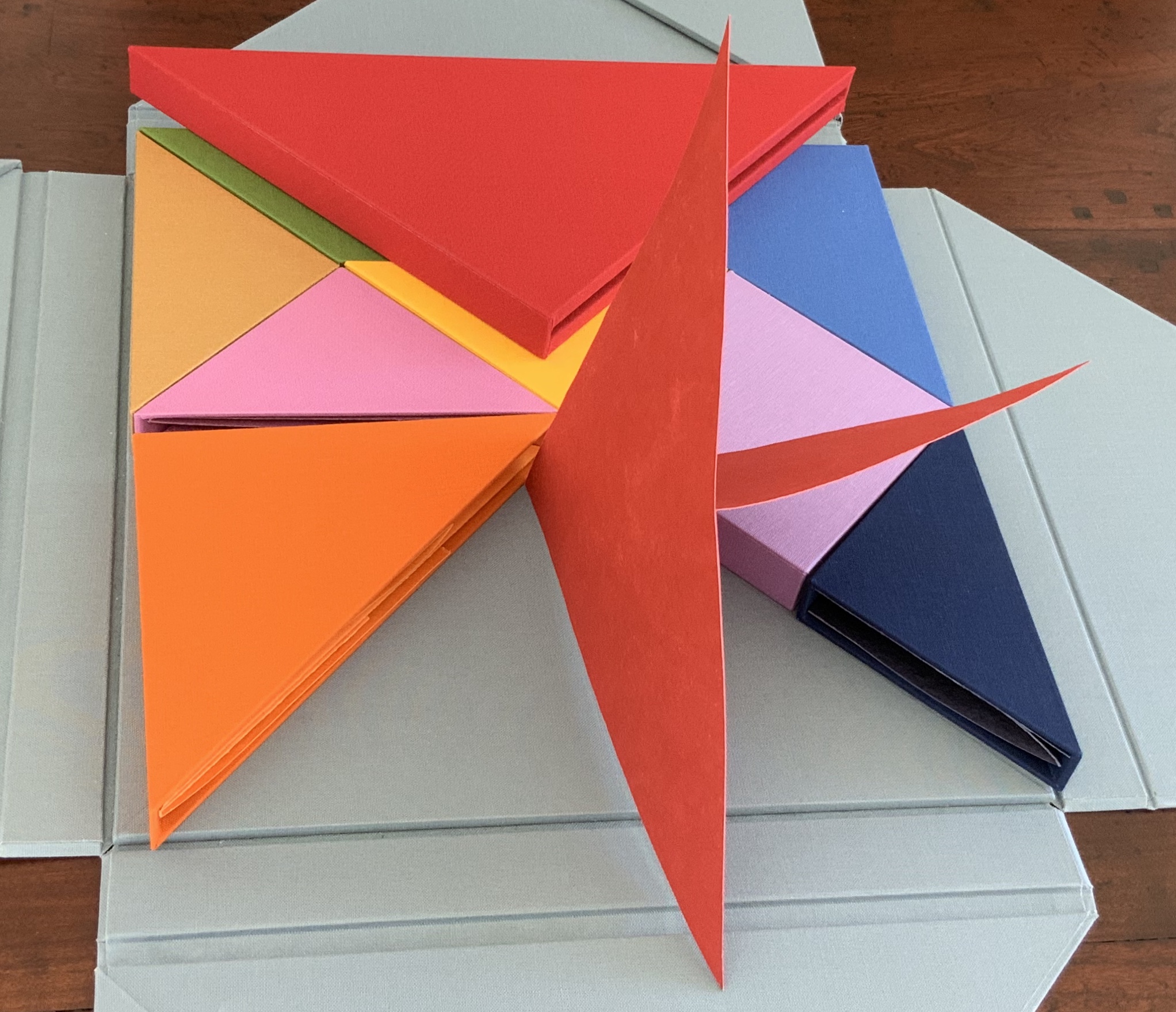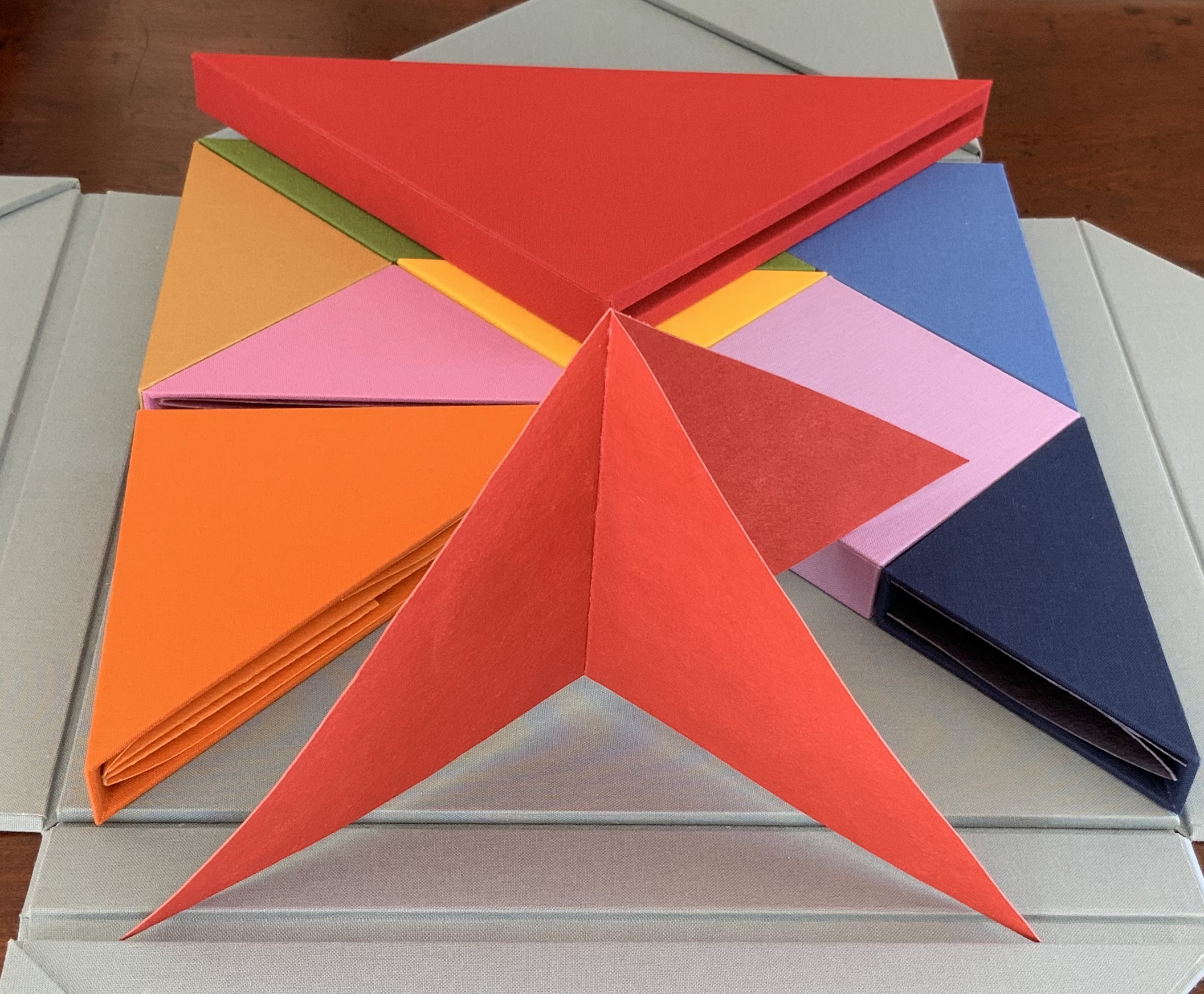 But where is the human soul manifest among these colors and forms?According to Neo-Pythagorean philosophers numbers, string vibrations, musical notes, colours and form have fundamental, metaphysical relationships. Pythagoras himself is thought to have said “colour is form, and form is colour”. Then there is Pythagorean Numerology that holds that a person’s date of birth can be distilled into one number (a root number) between 1-9, that each number is associated to a colour, and that each colour aligns with certain inner traits and life purposes. So within a box of grey (the color of universality), there are the nine colours of humanity: We are, making Nous Sommes a startling integration of book art, Pythagoras, numerology, tangrams, origami, papermaking, boxmaking, binding and printing.