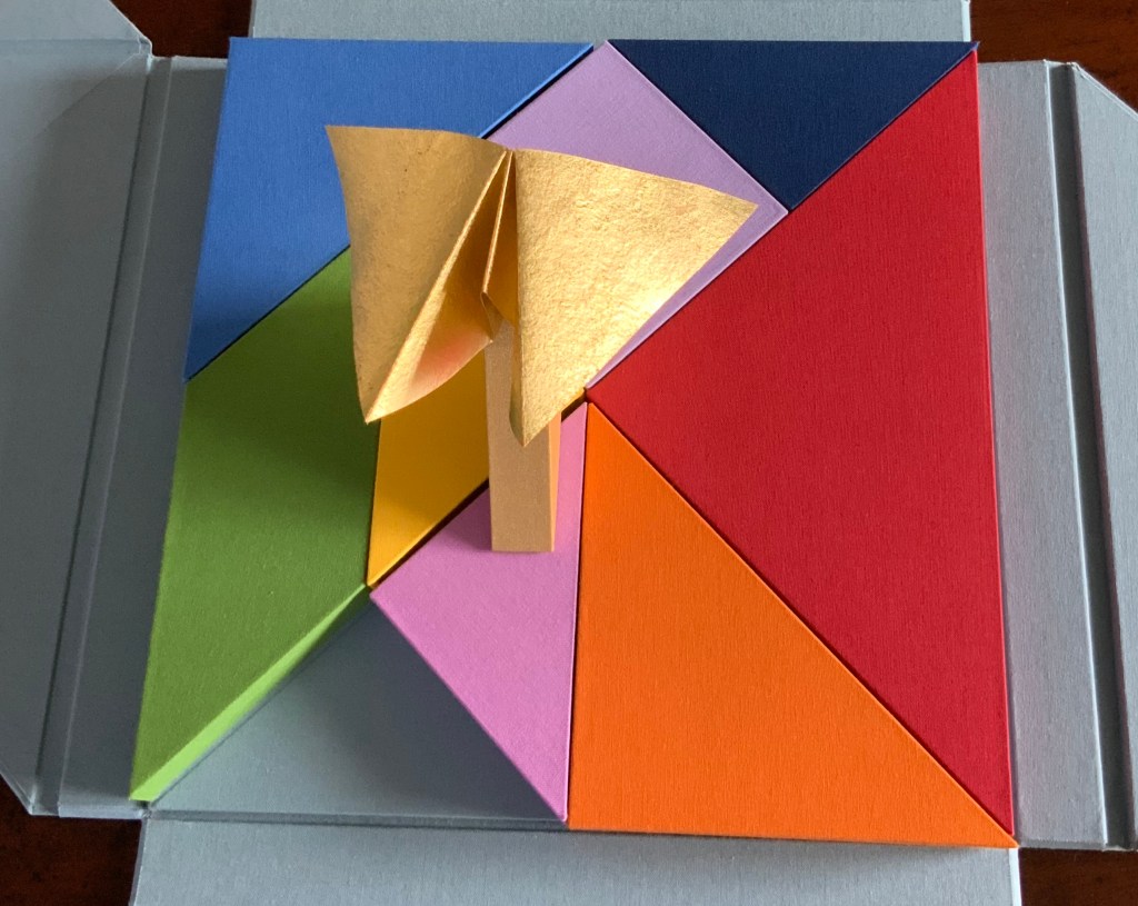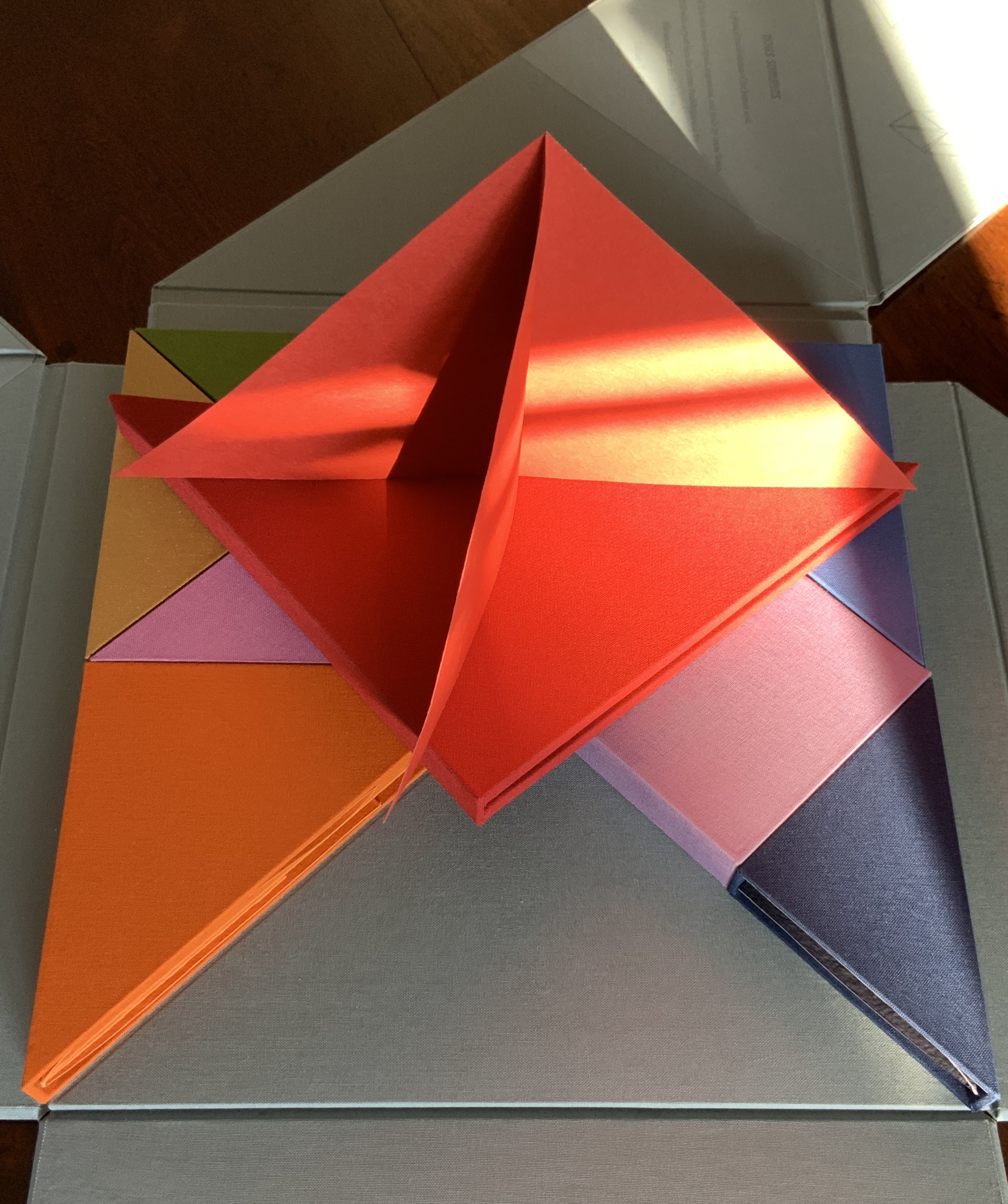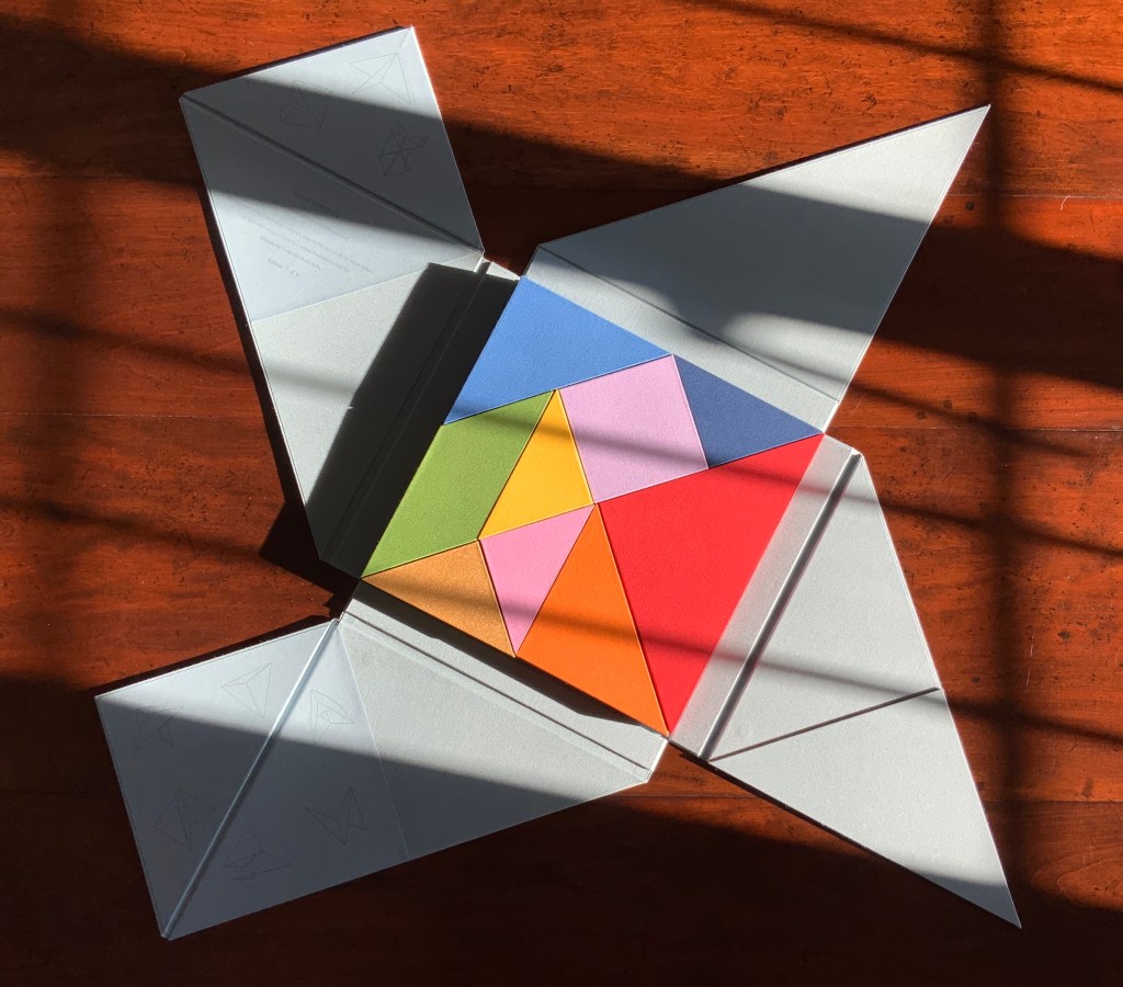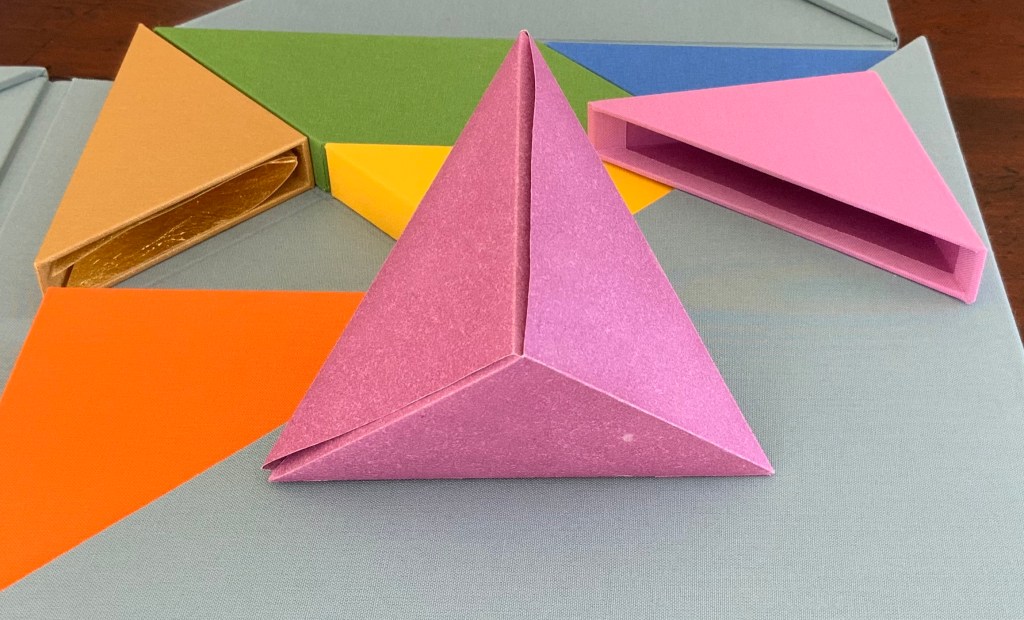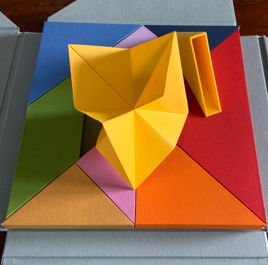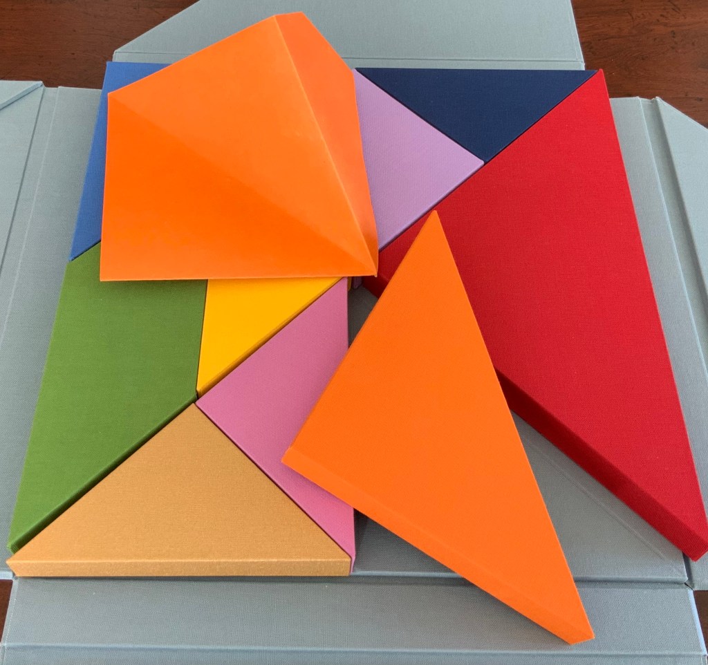 But where is the human soul manifest among these colors and forms?According to Neo-Pythagorean philosophers numbers, string vibrations, musical notes, colours and form have fundamental, metaphysical relationships. Pythagoras himself is thought to have said “colour is form, and form is colour”. Then there is Pythagorean Numerology that holds that a person’s date of birth can be distilled into one number (a root number) between 1-9, that each number is associated to a colour, and that each colour aligns with certain inner traits and life purposes. So within a box of grey (the color of universality), there are the nine colours of humanity: We are, making Nous Sommes a startling integration of book art, Pythagoras, numerology, tangrams, origami, papermaking, boxmaking, binding and printing.