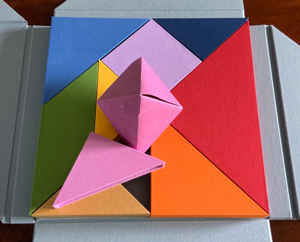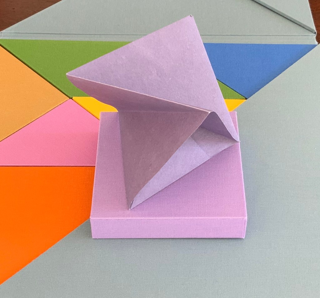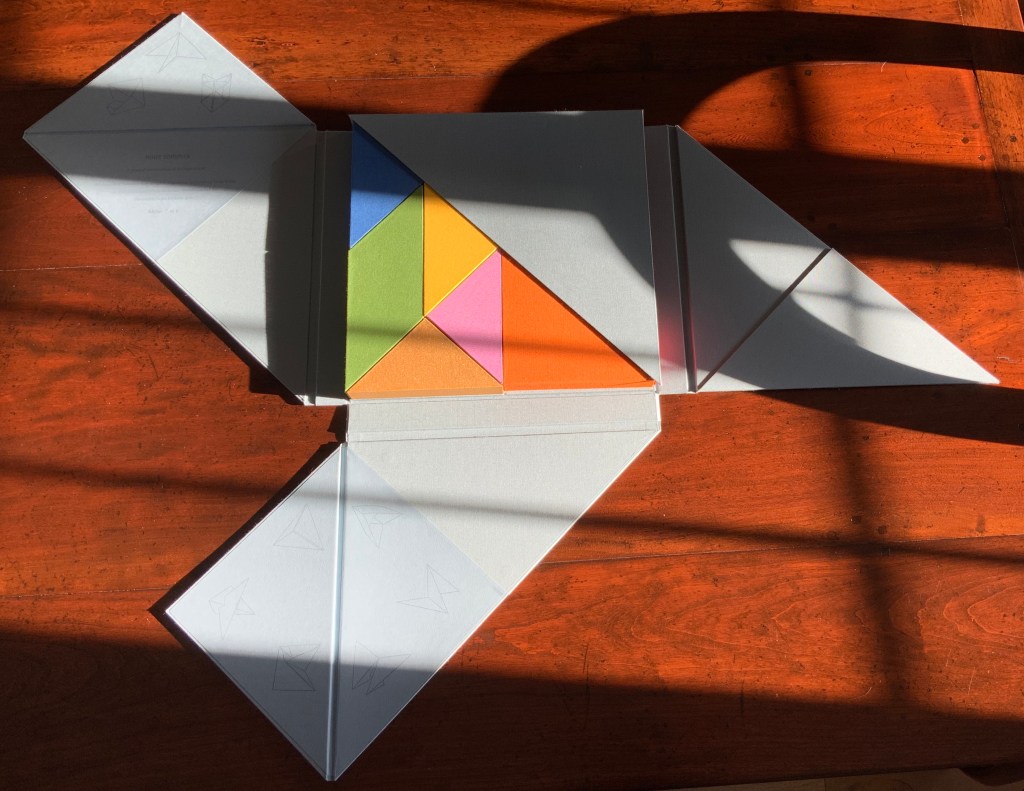 The next flap up gives another three boxes, all triangular and each a different color; and under the final flap, three more boxes, three more colors and a square among the triangles. Nine boxes making a tightly fitted square; six of them easily grasped because each has an edge at the perimeter.