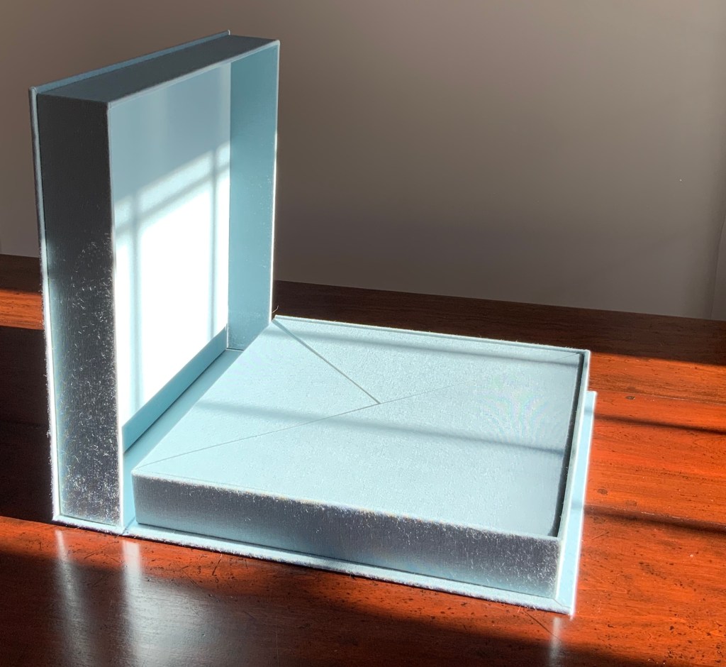 Box with embossed cover holding folios wrapped in chemise. H35o x W250 mm. 18 folios. Edition of 25, of which this is #6. Acquired from the artist, 20 December 2024.
