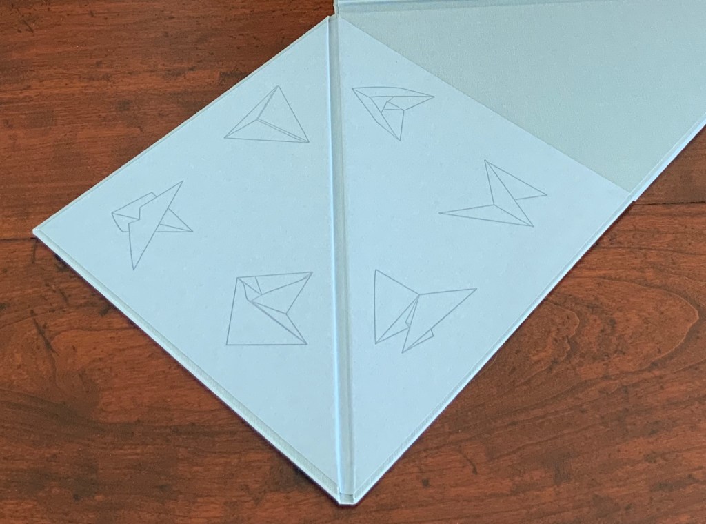 So I begin with the larger, lighter blue box. A sharp tap on the box, and a stiff, folded paper the same color as the box emerges. No words, no glyphs, but this is one of the shapes printed on the “table of contents”. It invites manipulation: stand me this way, now that, now this. With each turn, the light brings out different shades from the form’s valleys and mountains, and the form throws different shadows. Next the smaller, darker blue box houses a two-piece “chapter”, one piece to slot into the other. Again, different shades, different shadows.