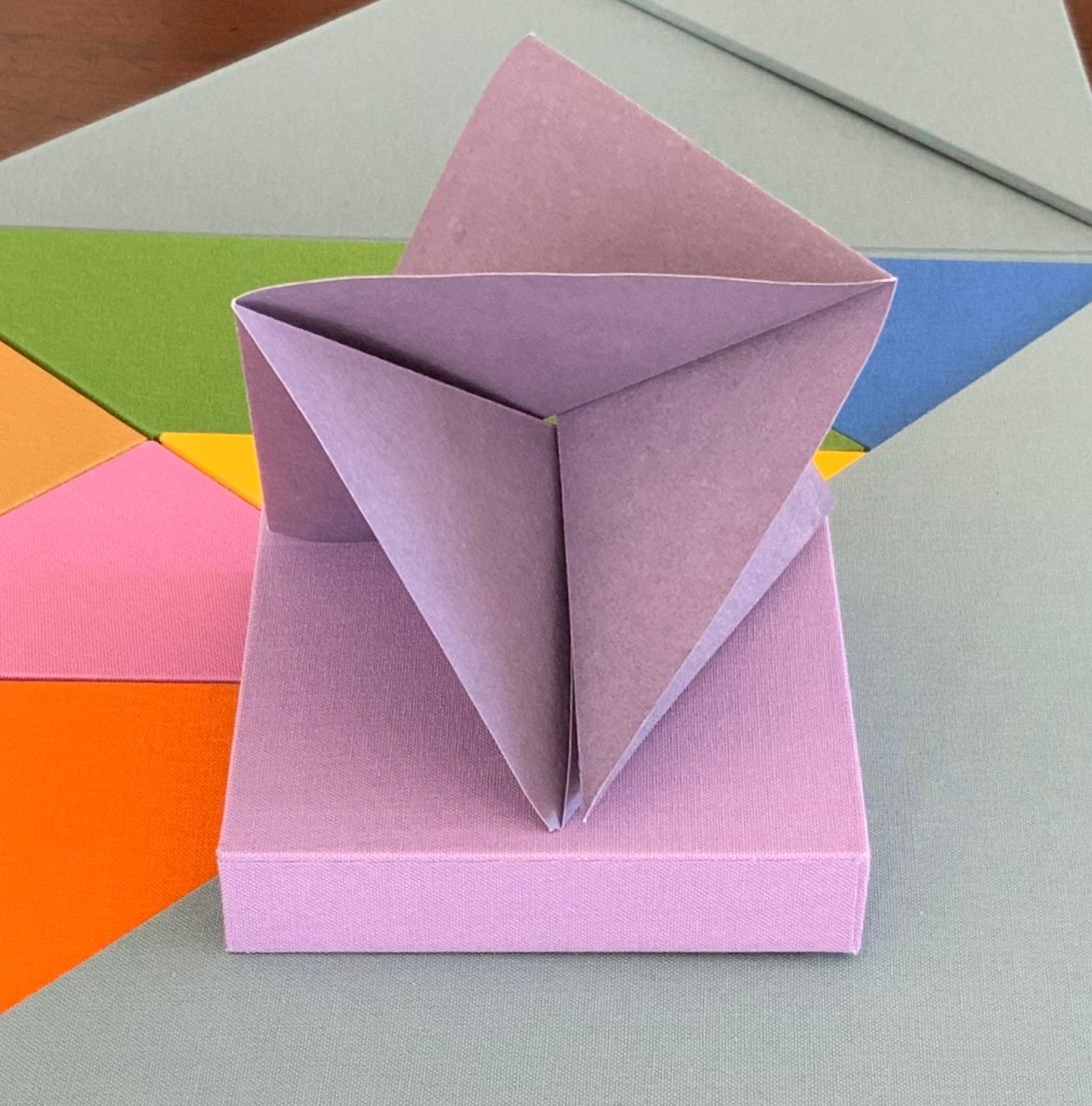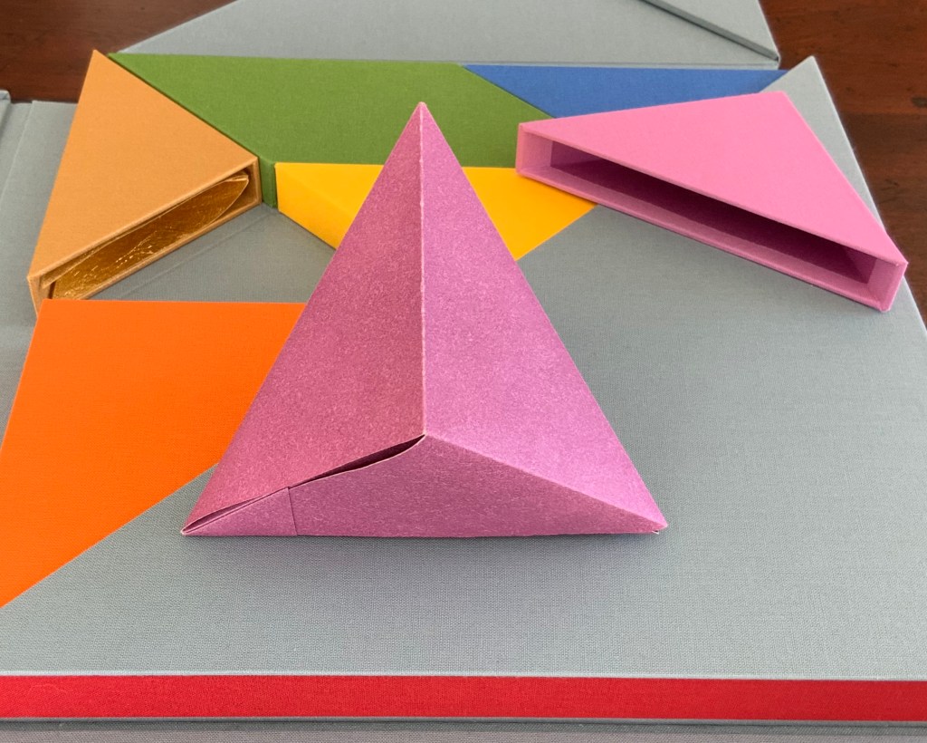 Inside the inner pink triangular box is the only solid — an irregular hexahedron. The contents of the violet square box unfolds and slots into itself to form a flower, the head of a mace?