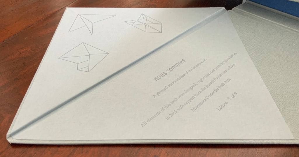 “Nous sommes”, the French for “we are”. But who is “we” here? Opening the first two flaps inside the blue-grey Solander box, I see that my first question should have been: What is Nous Sommes? The answer on the title page: “A physical manifestation of the human soul”. So, a book or sculpture then.