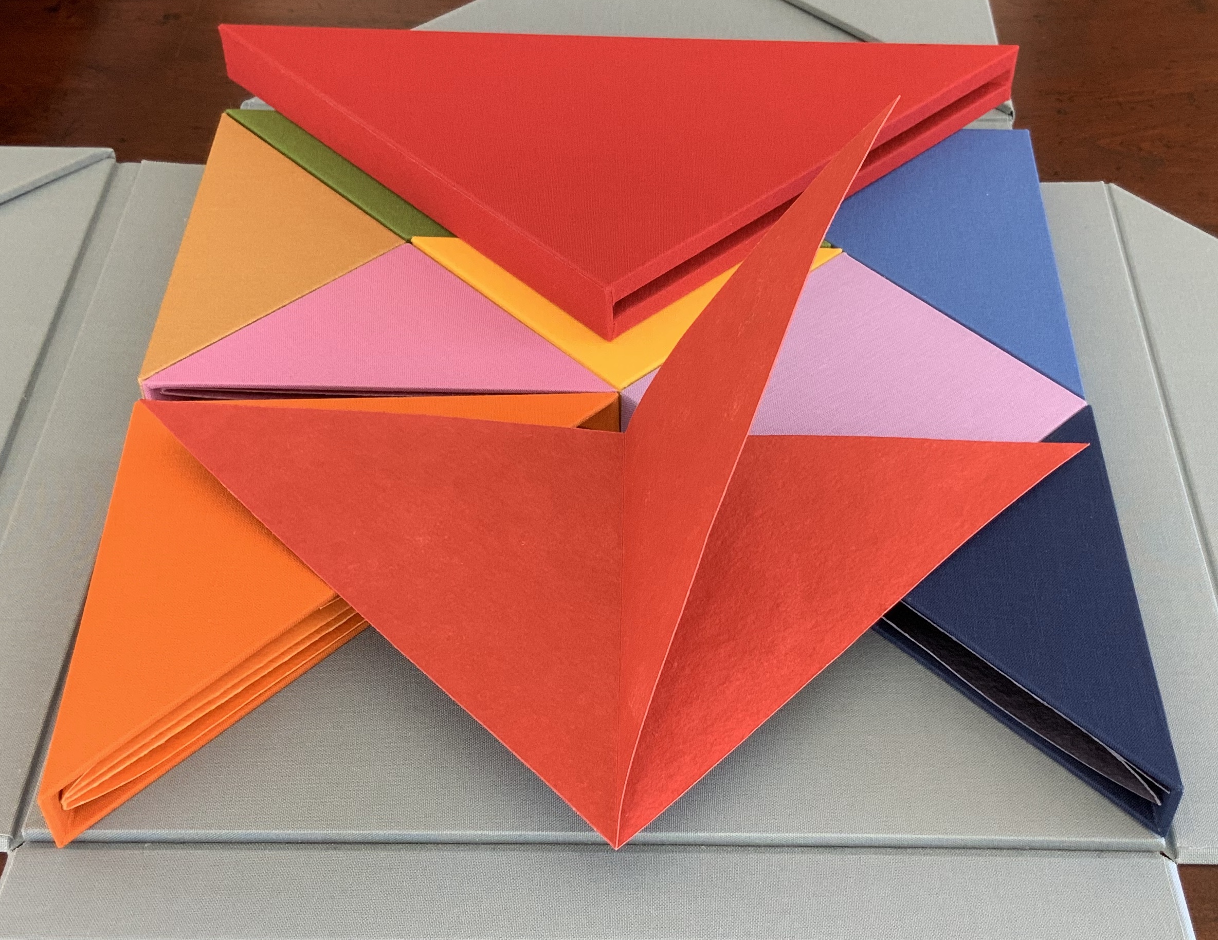 Nine handmade-paper forms in handmade cloth-covered boxes, fitted to flapped container with magnetic seals, enclosed in cloth-covered Solander box. H310 x W305 x D54 mm. Acquired from the artist, 4 July 2017. Photos: Books On Books.