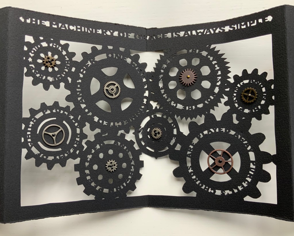 Leporello pop-up, enclosed in box with closure of small gear and black thread. Box: H205 x W162 x D27 mm. Leporello: H195 x W143 mm (closed), W1125 (open). Edition of 3, of which this is #1. Acquired from the artist, 31 July 2017. Photos: Books On Books Collection. With permission of the artist. “Machines” © Michael Donaghy Estate.