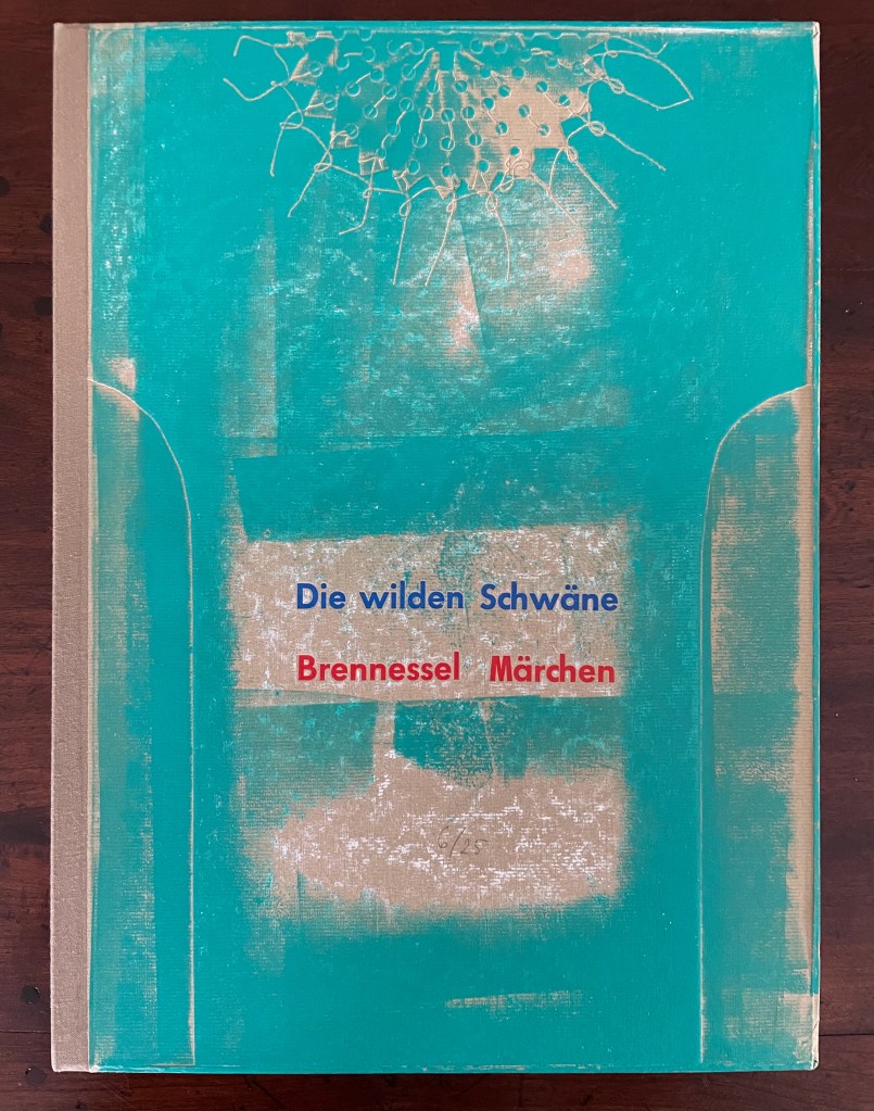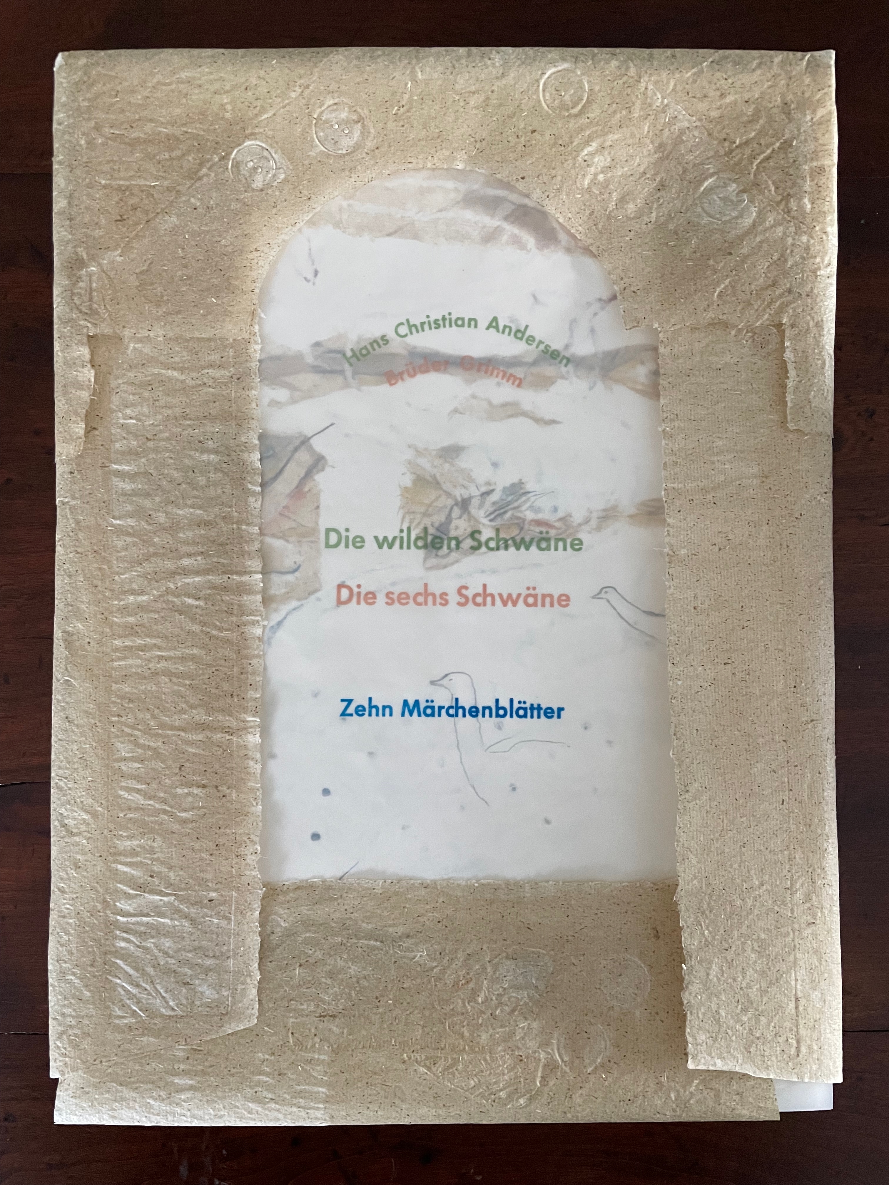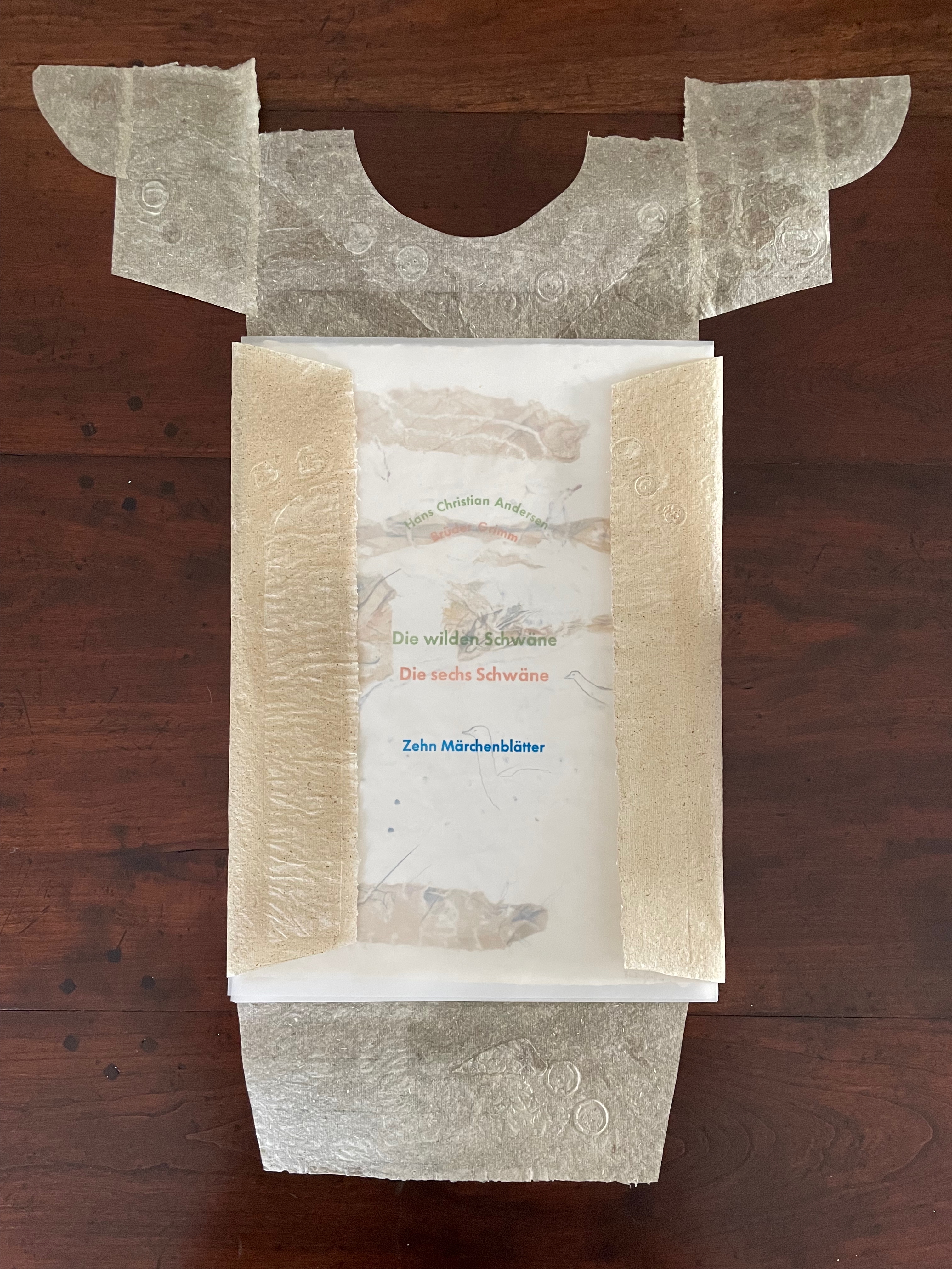 Barbara Beisinghoff’s Die wilden Schwäne is an exemplar of collaboration and craft. In it, she even requires collaboration between Hans Christian Andersen and the Brothers Grimm. Andersen’s Die wilden Schwäne and the Grimms’ Die sechs Schwäne are based on the same tale of brothers turned into swans who are saved by their sister Elisa’s diligent and mute harvesting, pulping, spinning and sewing of stinging nettles into shirts that break the spell when donned. H.C. Andersen, however, is verbose and elaborate in his telling (even including vampires!), and Beisinghoff has done a bit of nipping and tucking with the more succinct Brothers Grimm to create a version more suited to the artist’s book she creates.