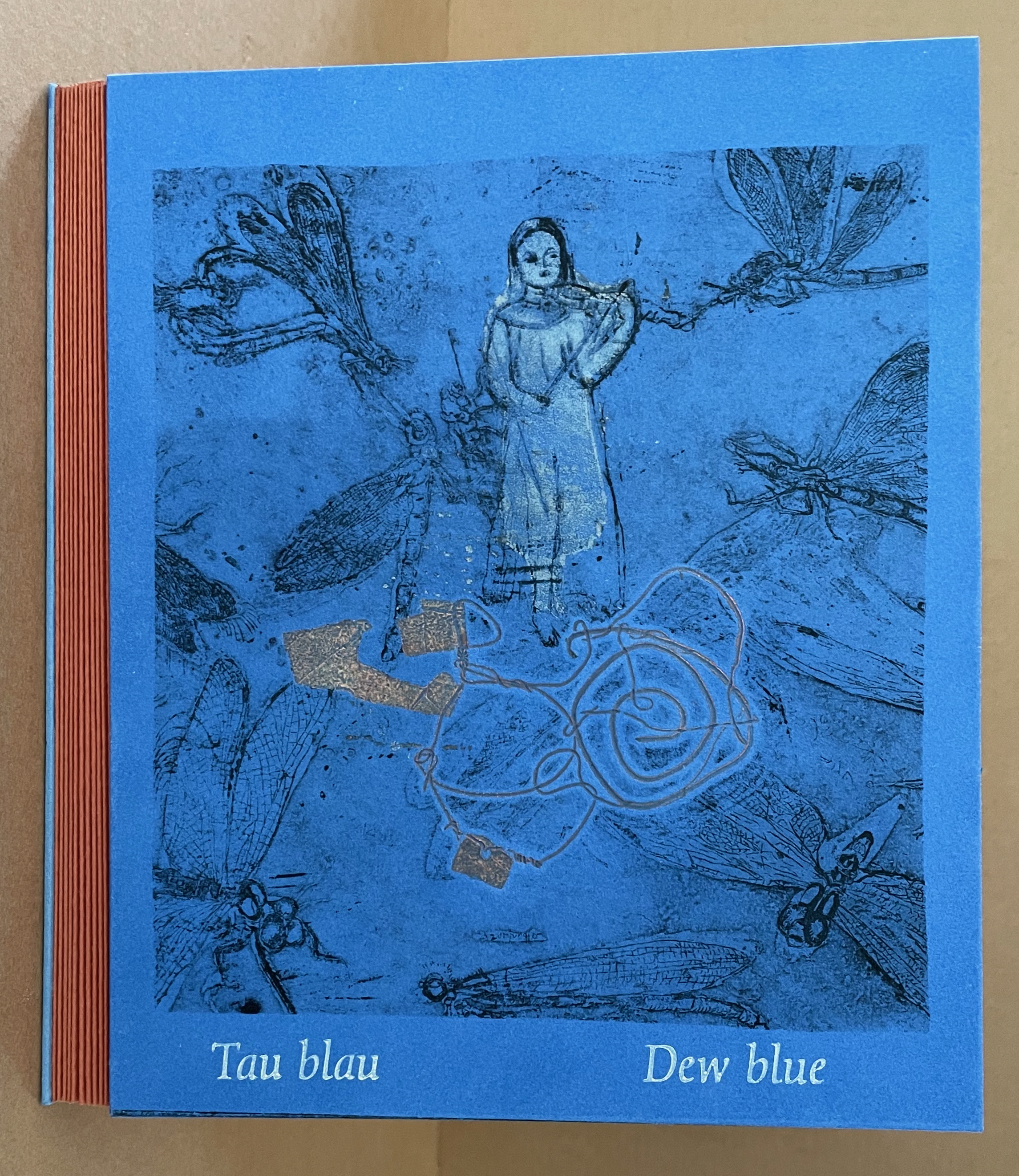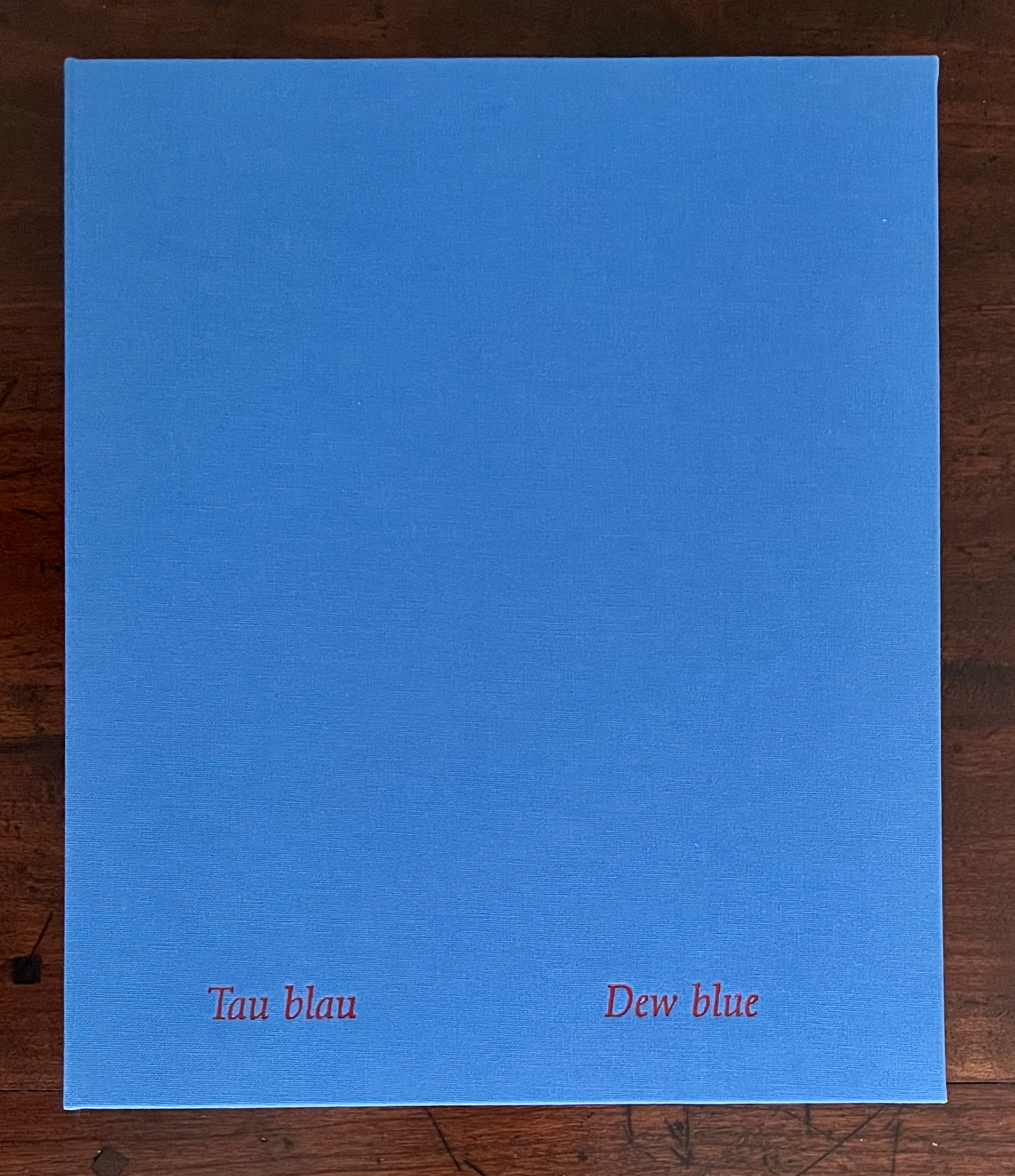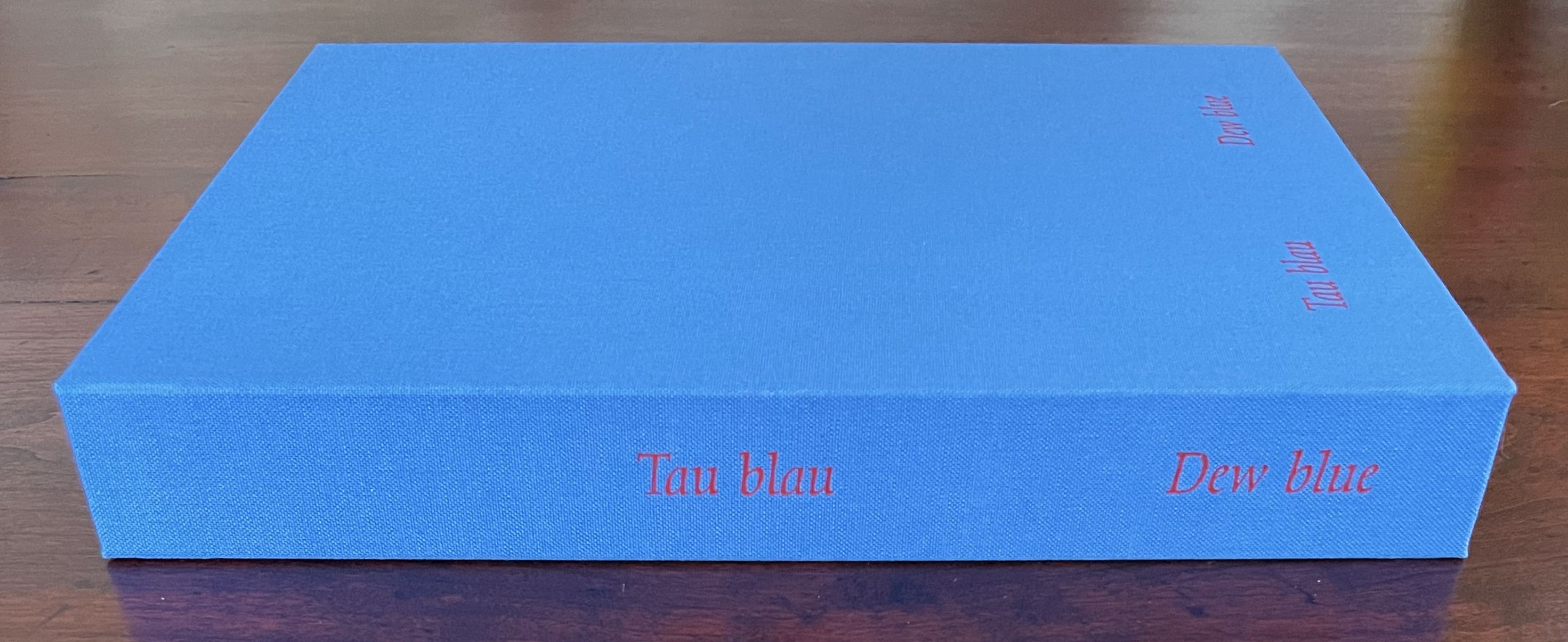 From the blue of the plant’s blossoms to the white of its change into linen and paper to the red, burnt orange and black of its sparks and ash when it is consumed by fire in the end, all of the story’s colors are replayed across Tau blau / Dew Blue from its Solander box to its covers and spine like motives in a Baroque musical piece.