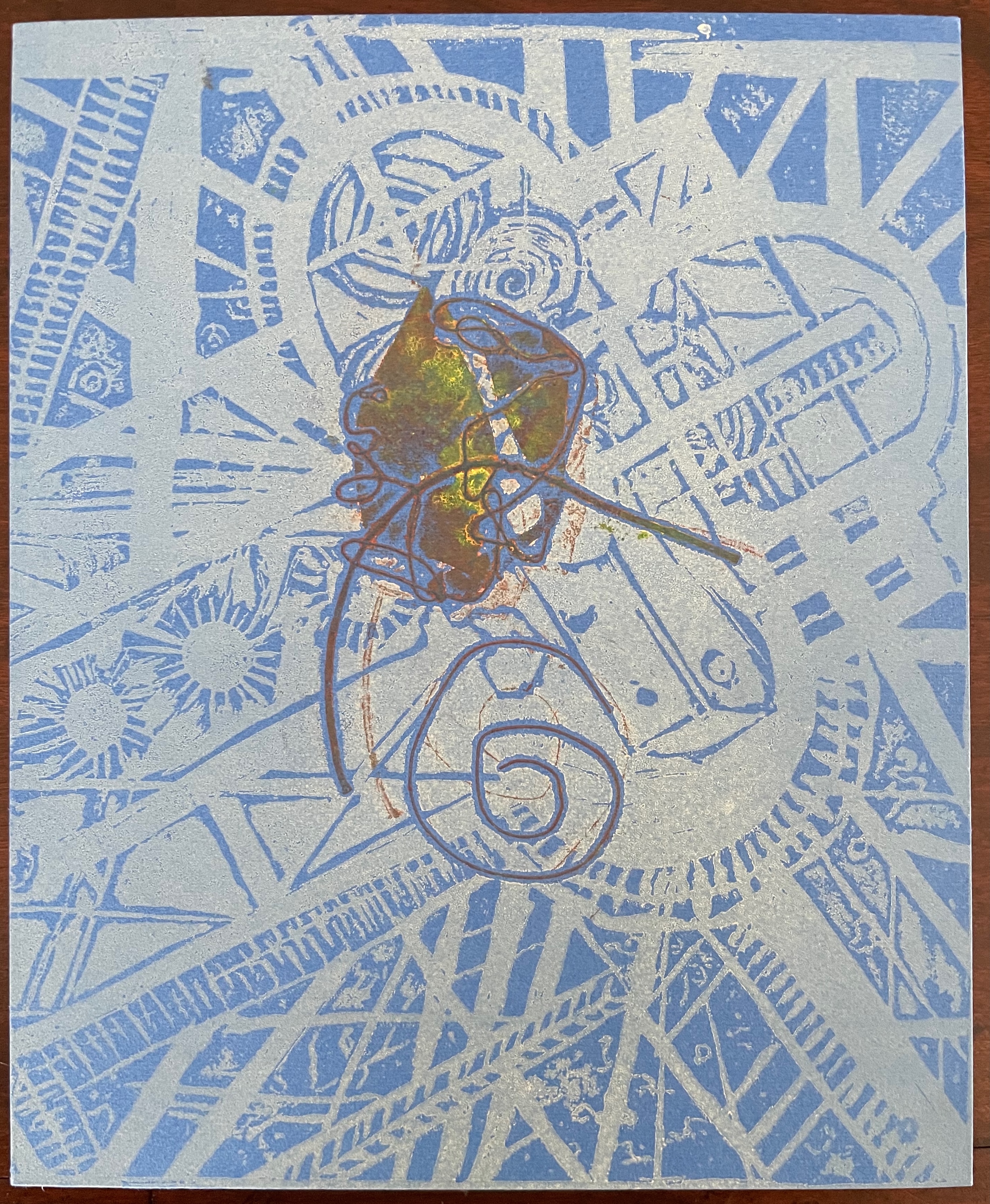 Thread drawing is a technique common to several outstanding works of book art: Jody Alexander’s Felix’s Notebook (2008), Marion Bataille’s Vues/Lues (2018), Dianna Frid’s Reversal (2009), Candace Hicks’ Composition (2009~), Helen Hiebert‘s Nebulae (2017), Shellie Holden’s Maps (2006), Lisa Kokin’s Partial History of Jewish Life in Modern Times (1997), Ines Seidel’s Changed Constitution (2015) and Mireille Vautier‘s Agenda (2001) among others. Graf’s handling of the technique and its combination with cyanotype printing and lithography in the treatment of her theme, though, make it distinctive and original.