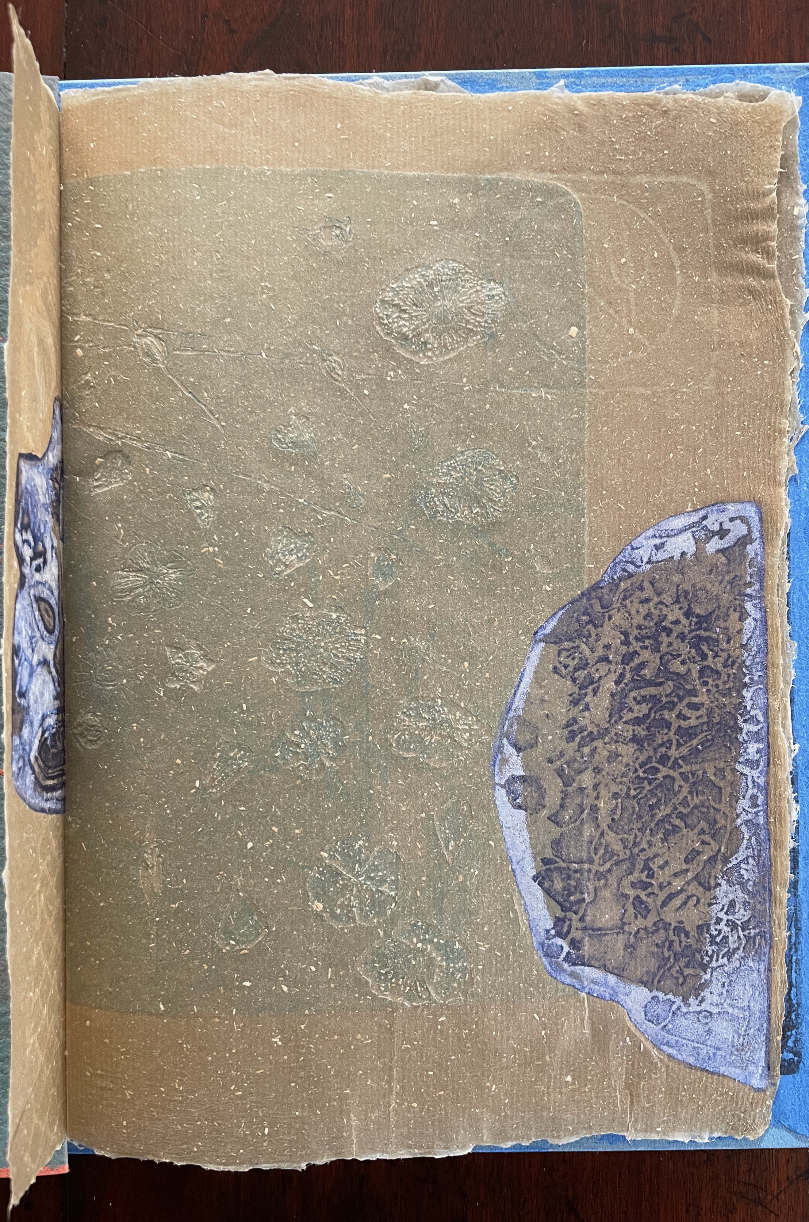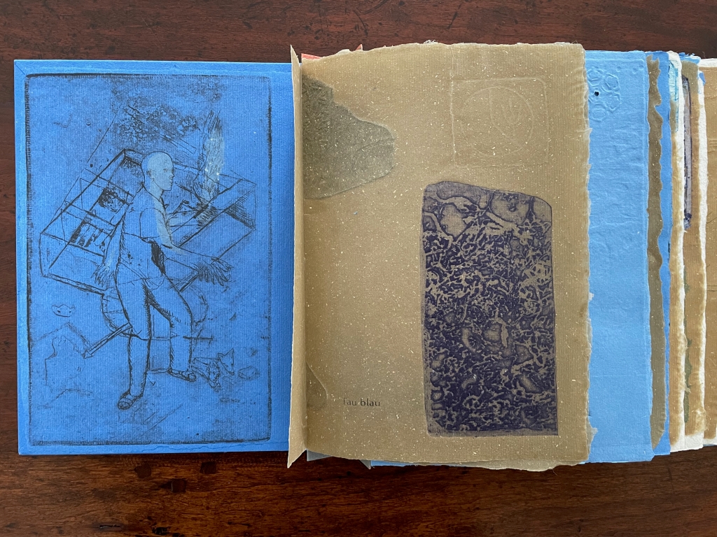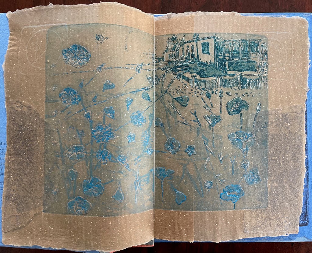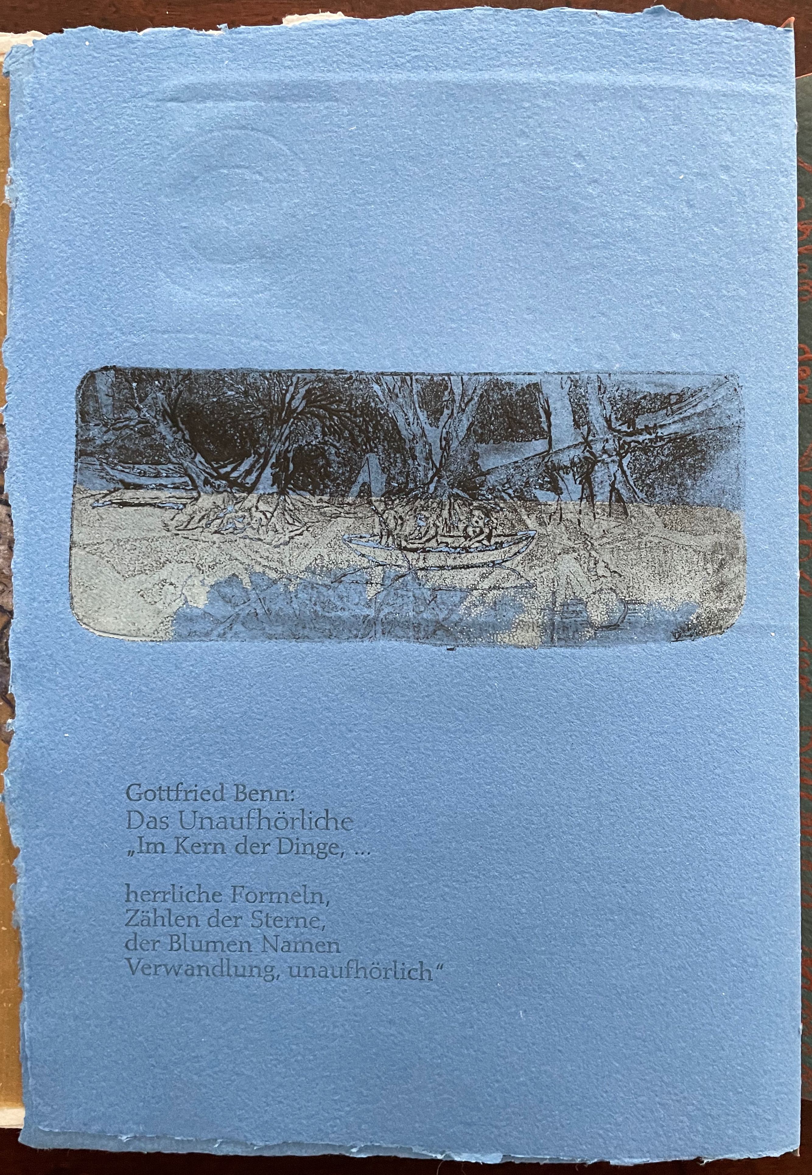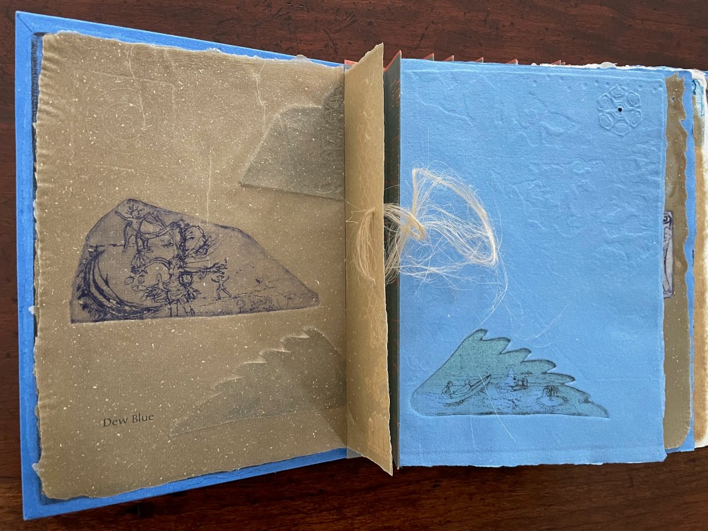 Dew Blue title page and etching, loop of flax fibers, first page of blue handmade paper folio; note its boating image repeated from the prior center spread.