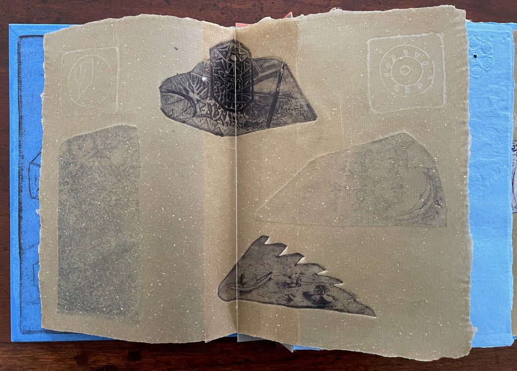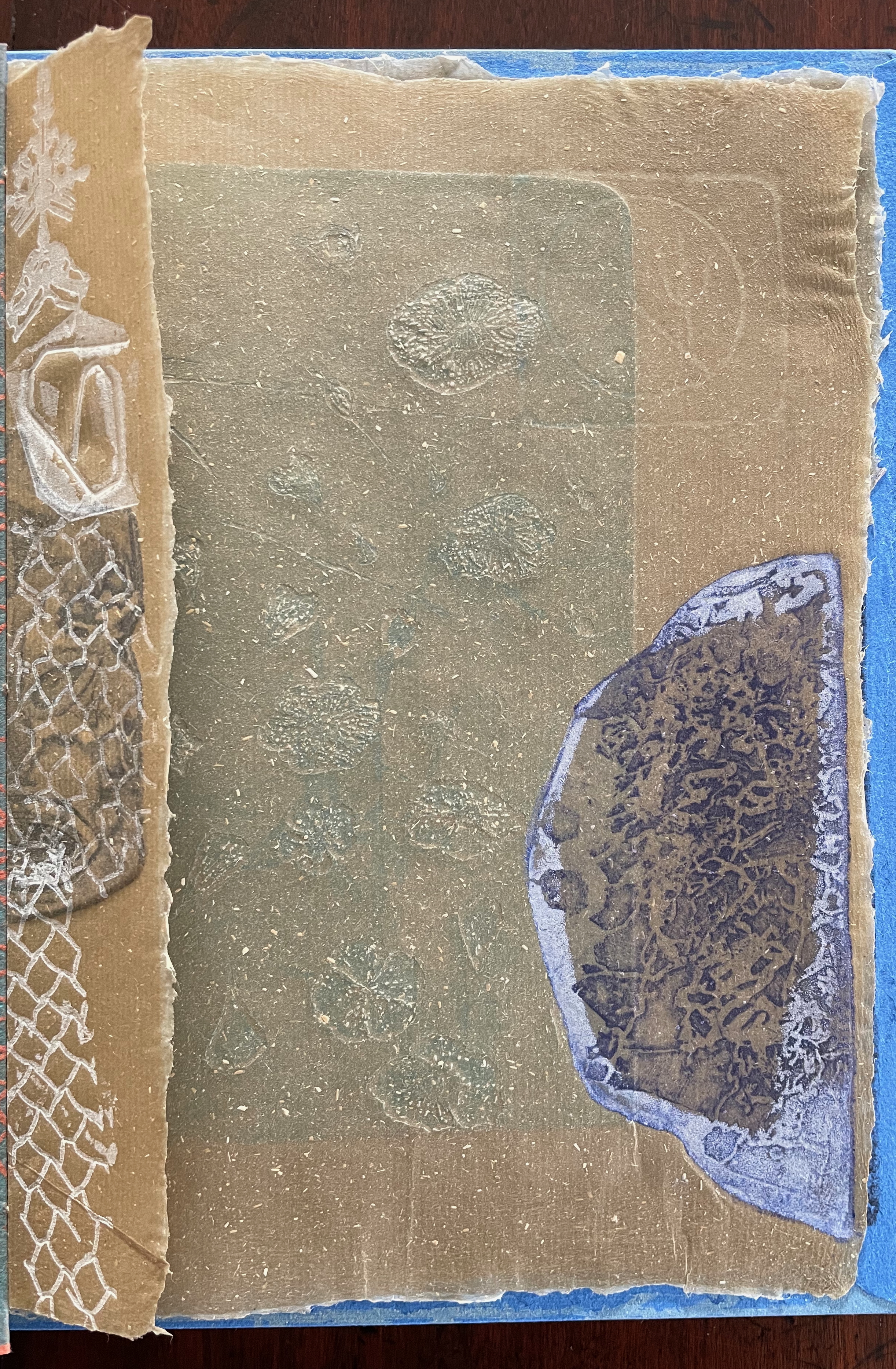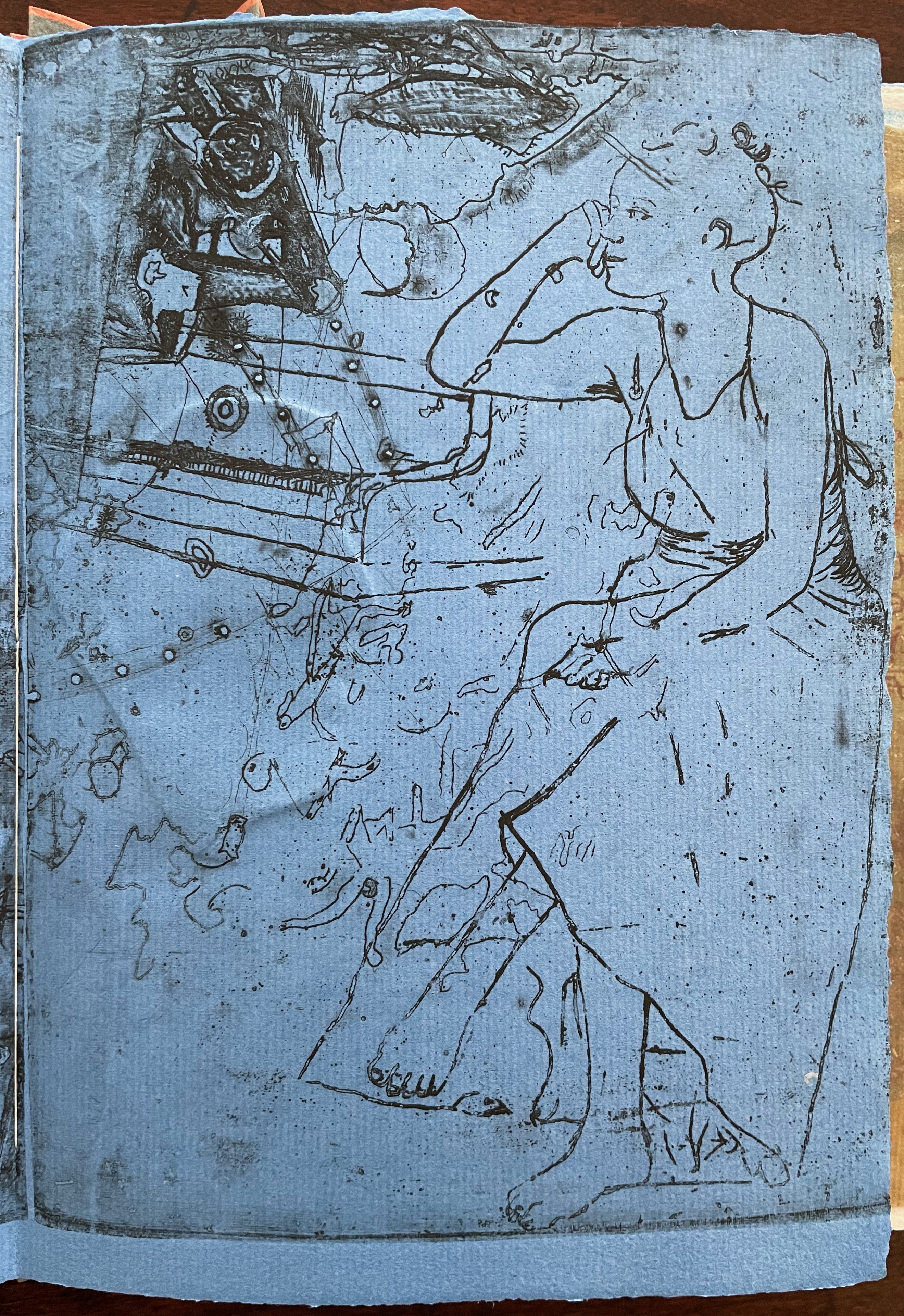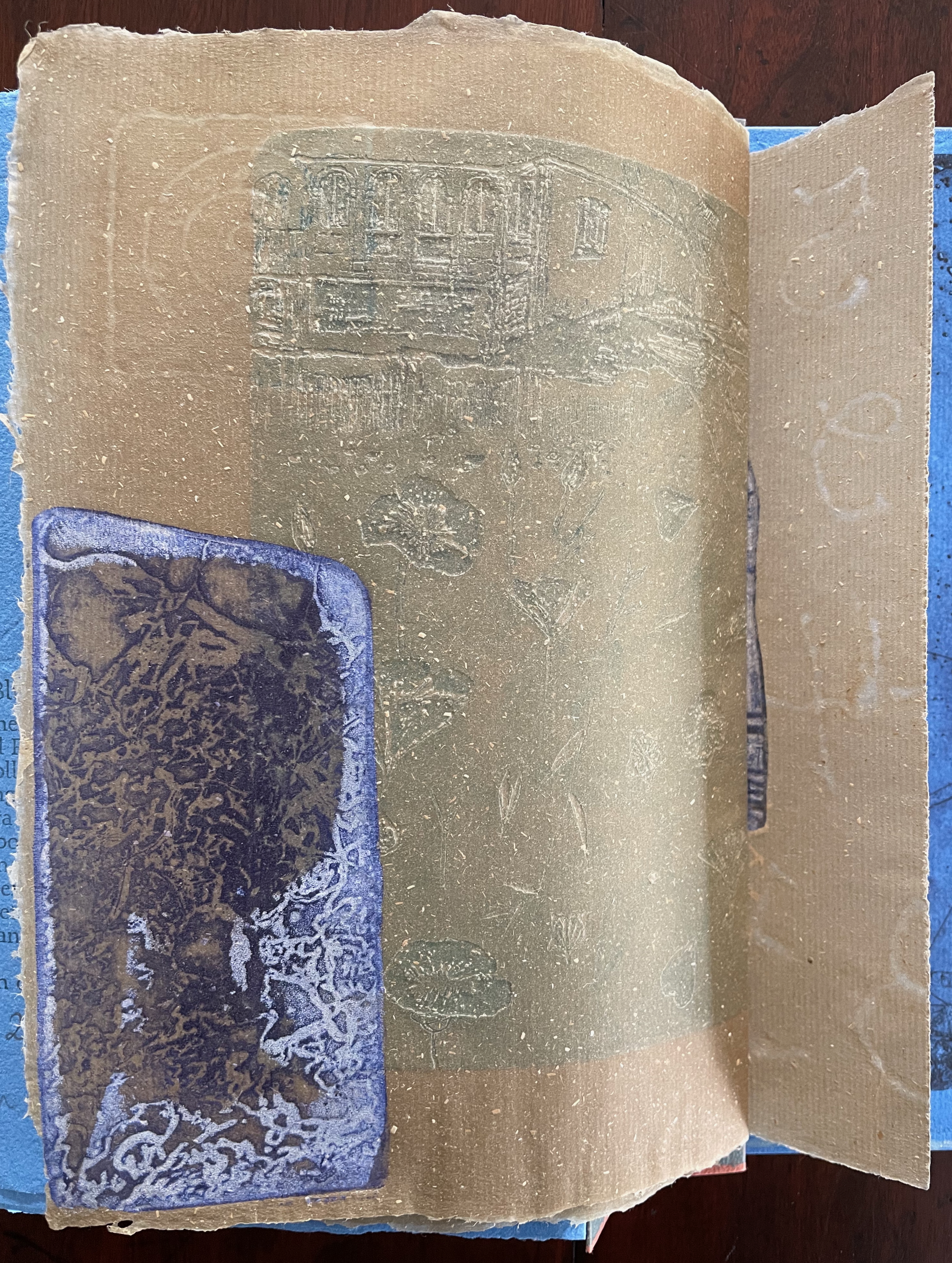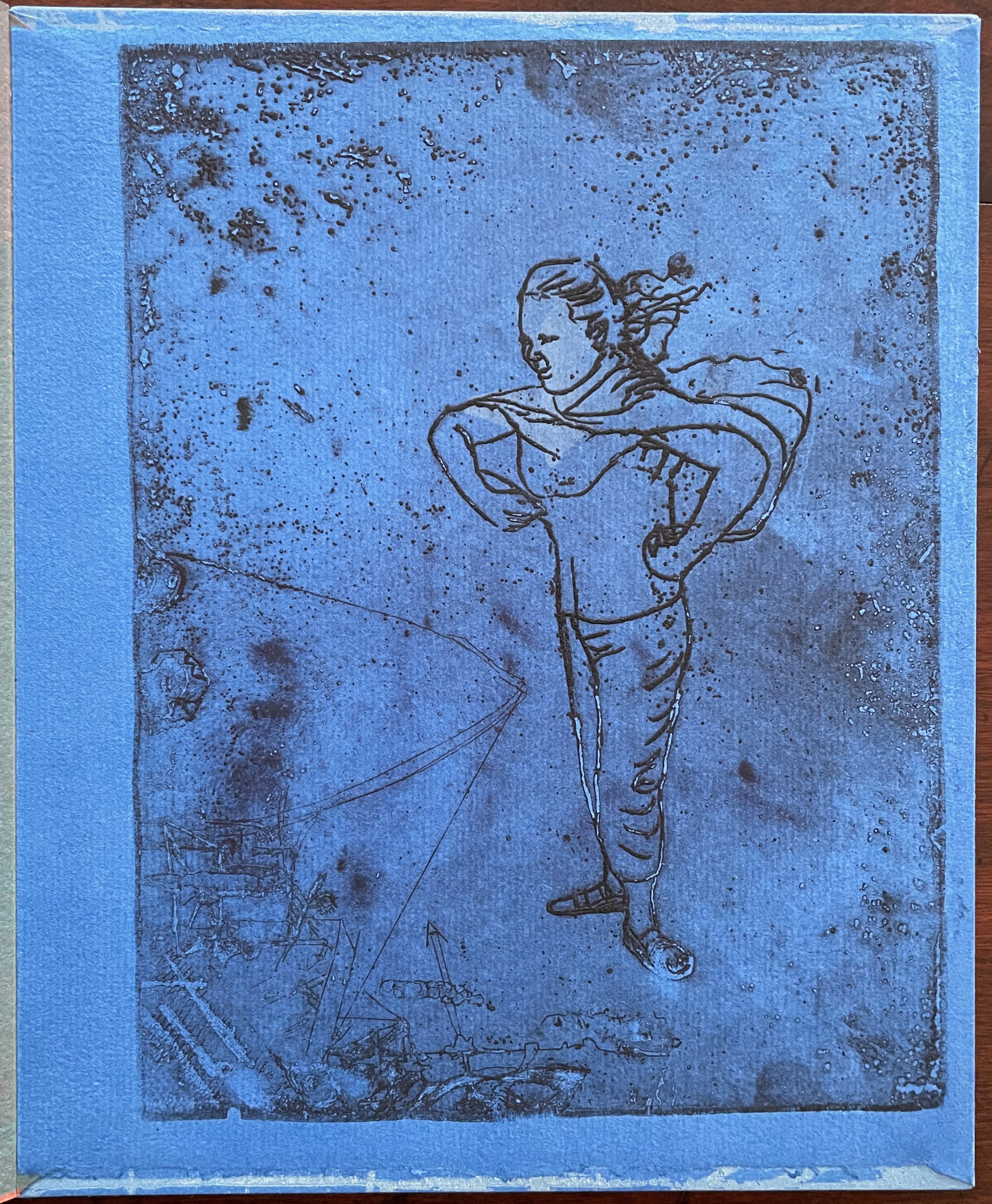 Dew Blue title page and etching, loop of flax fibers, first page of blue handmade paper folio; note its boating image repeated from the prior center spread.