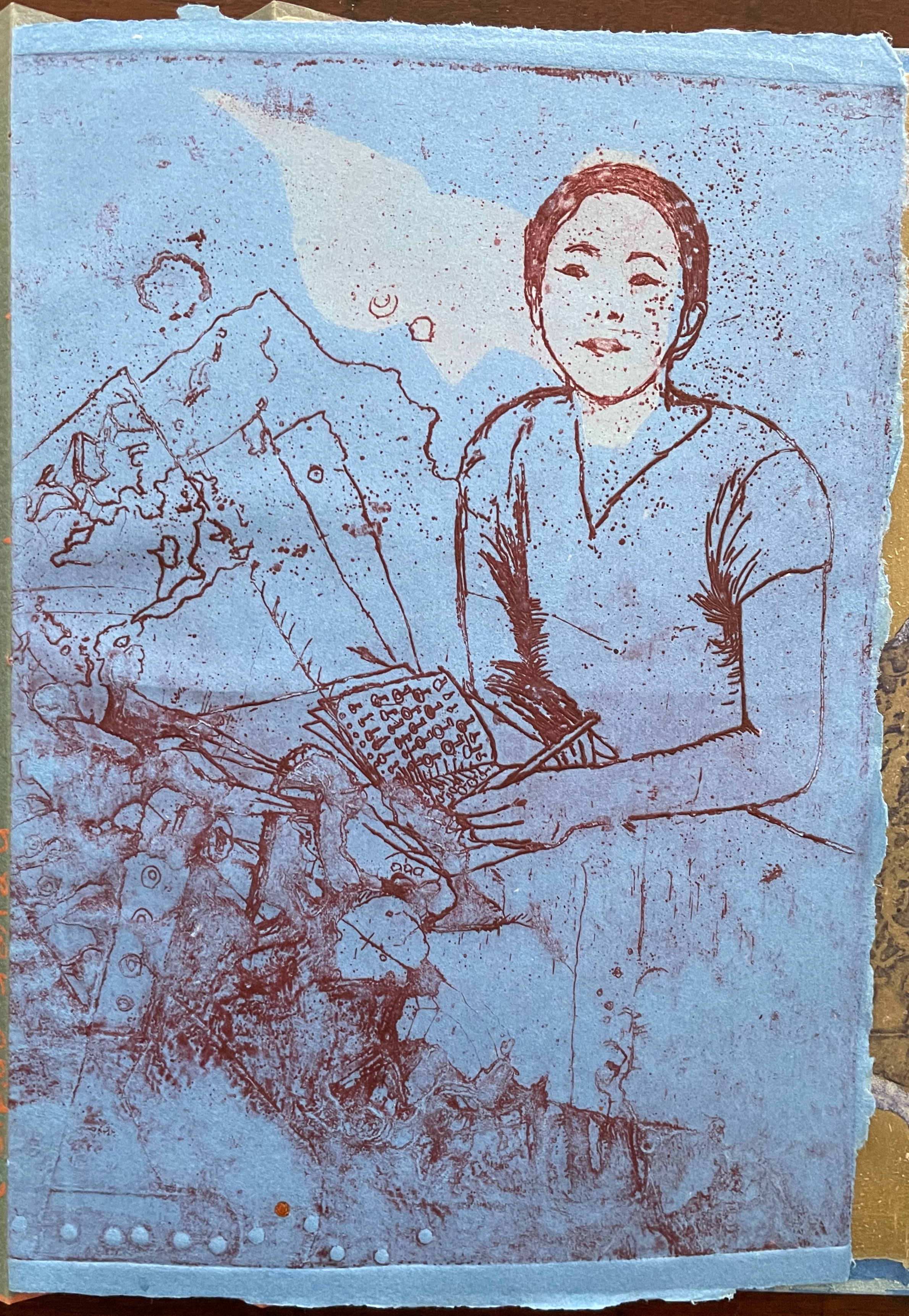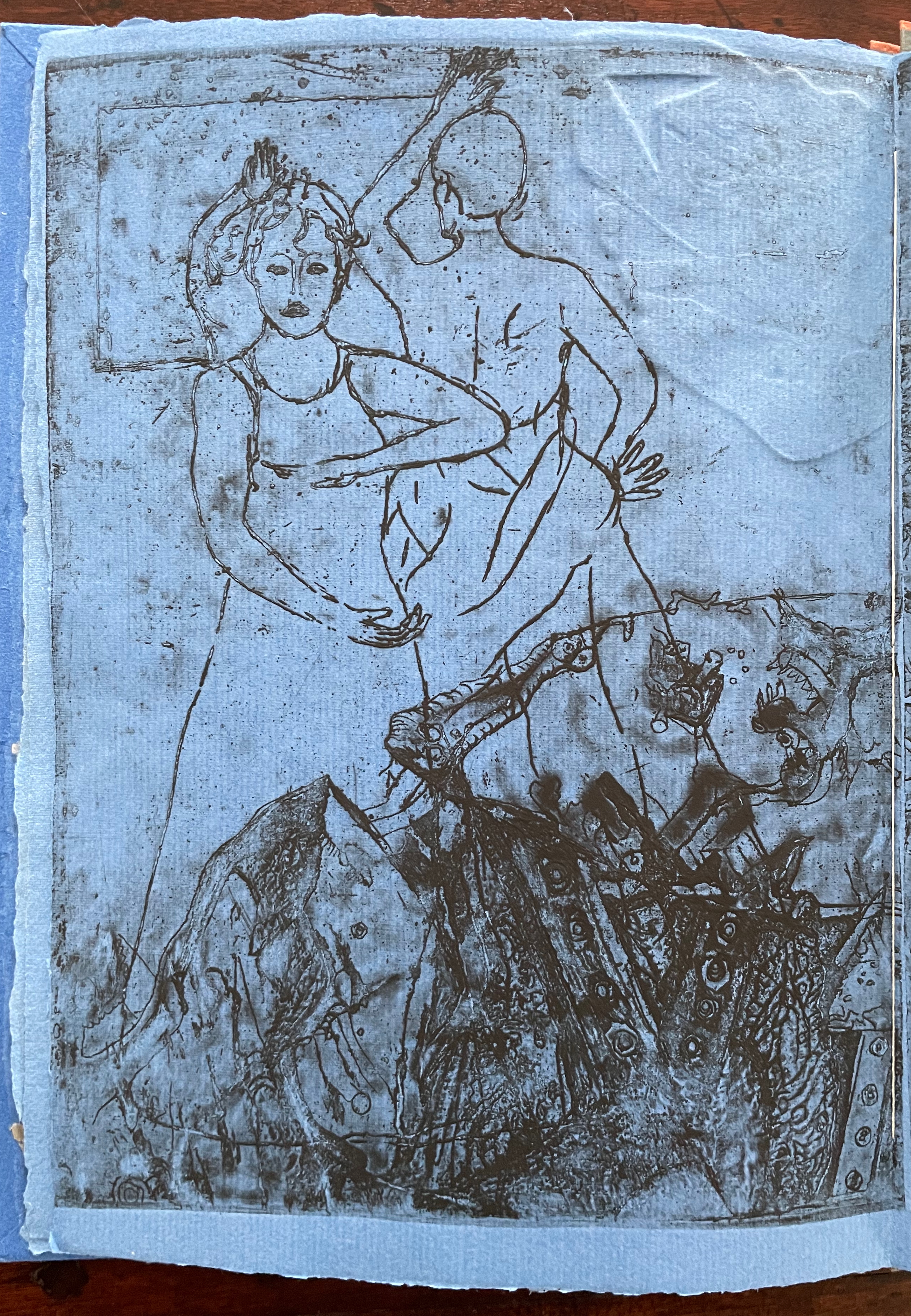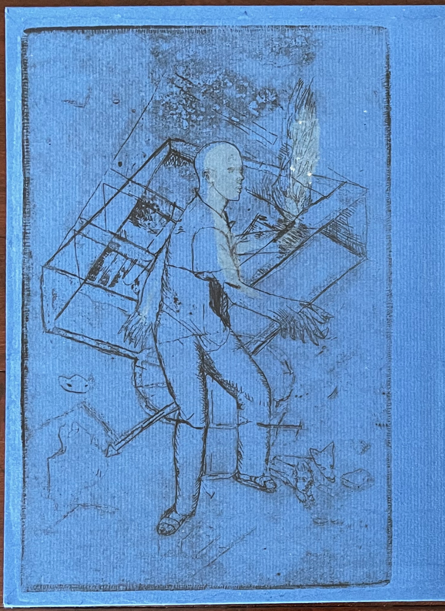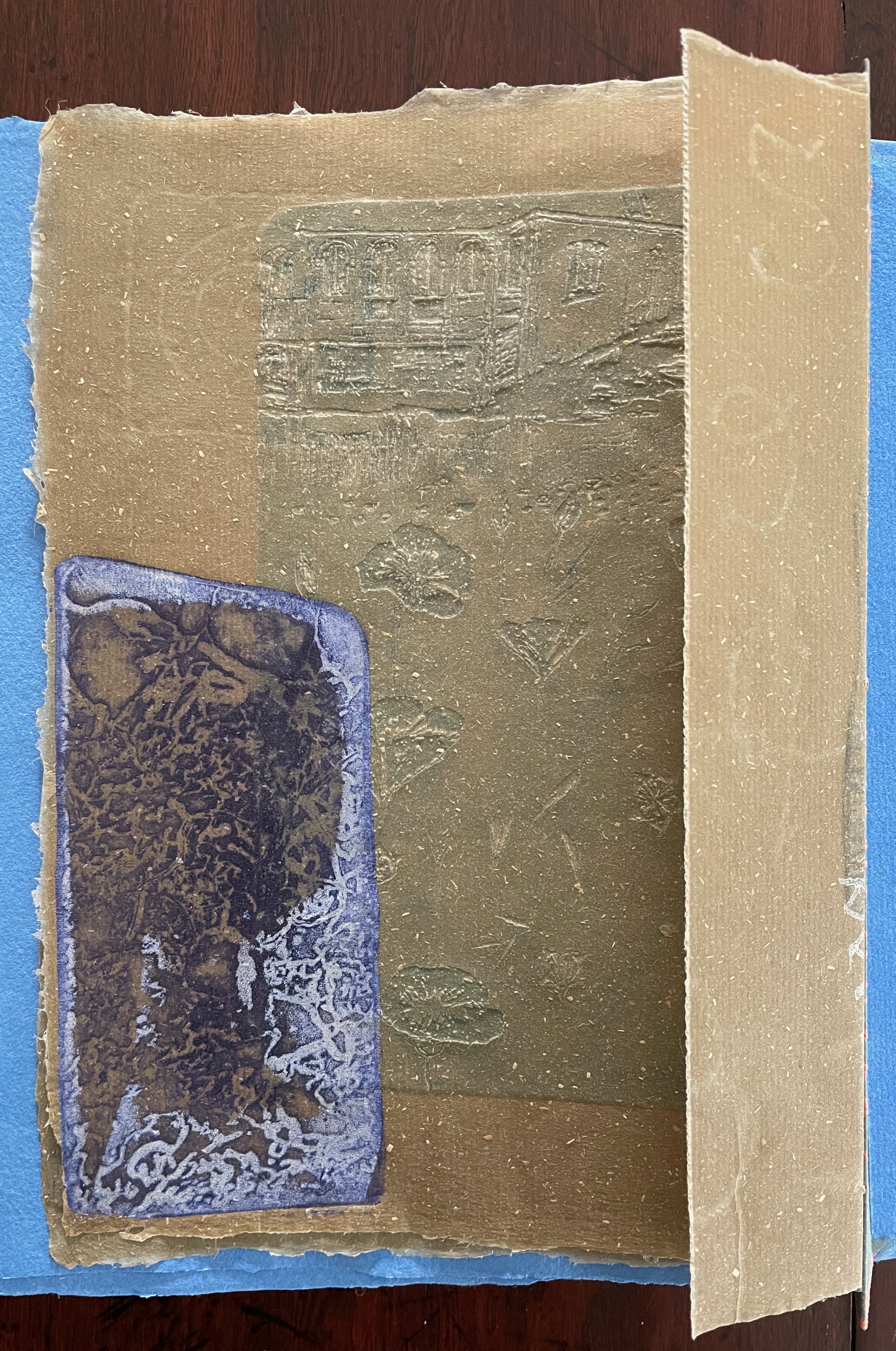 Dew Blue title page and etching, loop of flax fibers, first page of blue handmade paper folio; note its boating image repeated from the prior center spread.