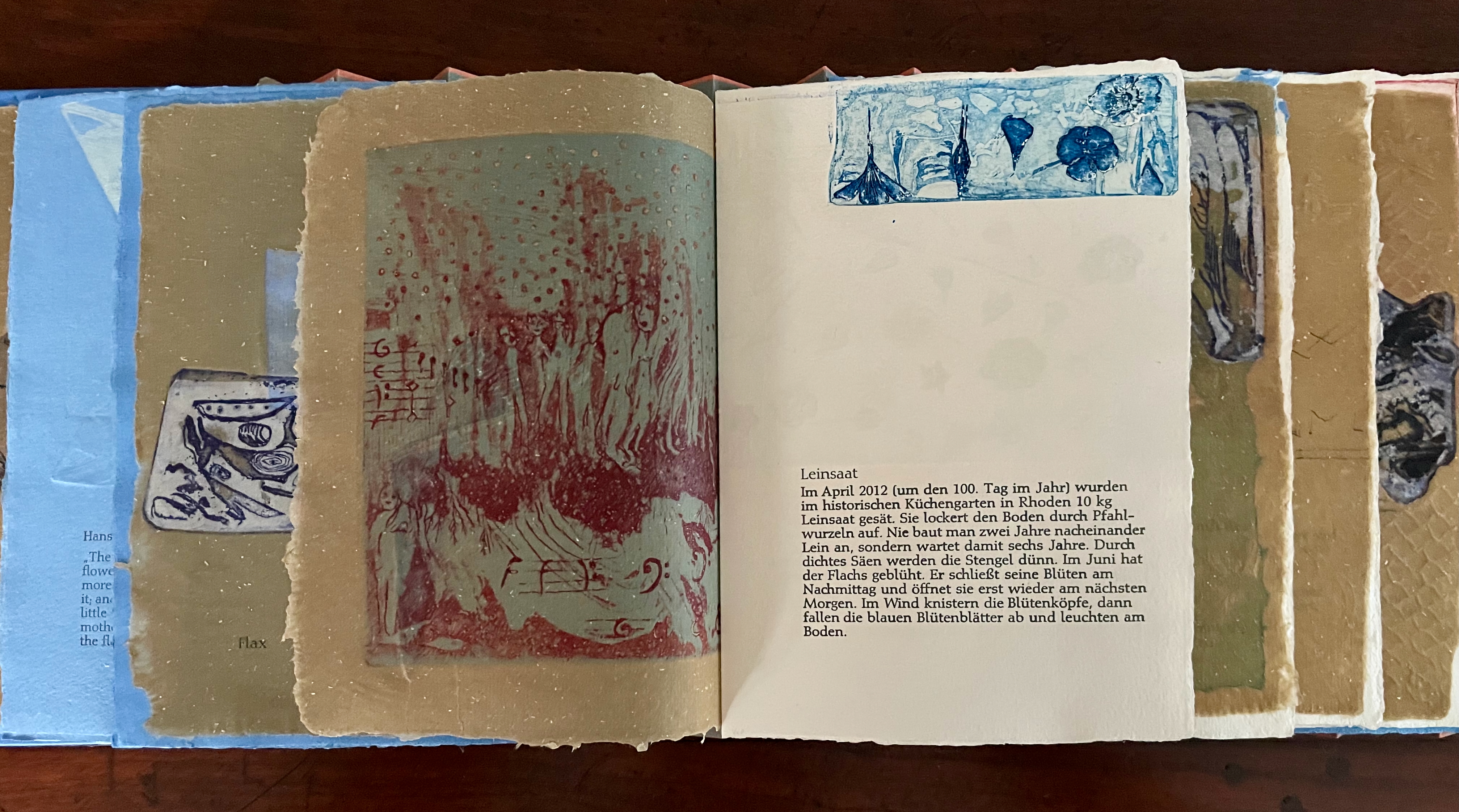 Only the opening paragraph of the story appears in Tau blau / Dew Blue, but Beisinghoff documents and illustrates the stages from her own cultivation of flax, observation of its growth and preparation of its processing. And with the etching, drawing, watermarking, handmade papers, linen cloth and thread, and binding structure, Beisinghoff suffuses the spirit of the tale’s metamorphosizing plant throughout the whole of Tau blau / Dew Blue.