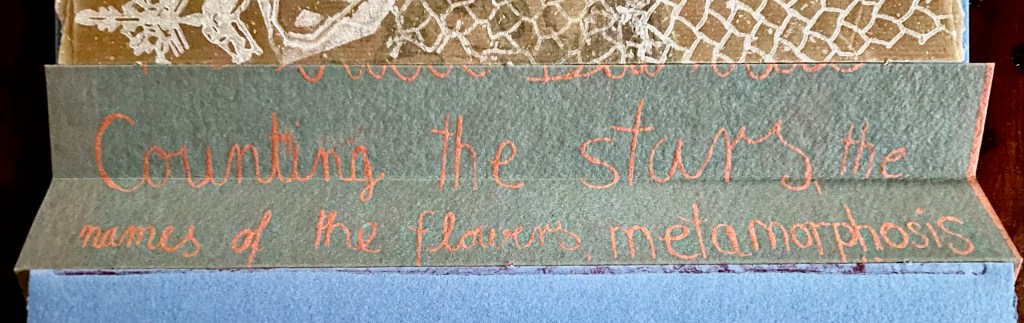 Following the pure flax folio, the first all blue folio gives us that introductory excerpt from Andersen’s fairy tale. Next comes a description of flax comes from Leonhart Fuchs’ Book of Herbs (1543), then the series of planting and harvesting observations from Beisinghoff, then the refrain from Clemens Brentano’s poem “Ich darf wohl von den Sternen singen” (1835), then philosophical observations drawing on G.W. Leibniz from D’Arcy Wentworth Thompson’s On Growth and Form (1917), a much-quoted theorem of musical composition from Bernd Alois Zimmermann’s Intervall und Zeit (1974), and finally (below) a passage of text by Gottfried Benn from the Hindemith oratorio Das Unaufhörliche / The Neverending (1936). In the valleys of the accordion spine, some of the lines from Andersen, Fuchs, Beisinghoff and Been appears handwritten in orange paint.
