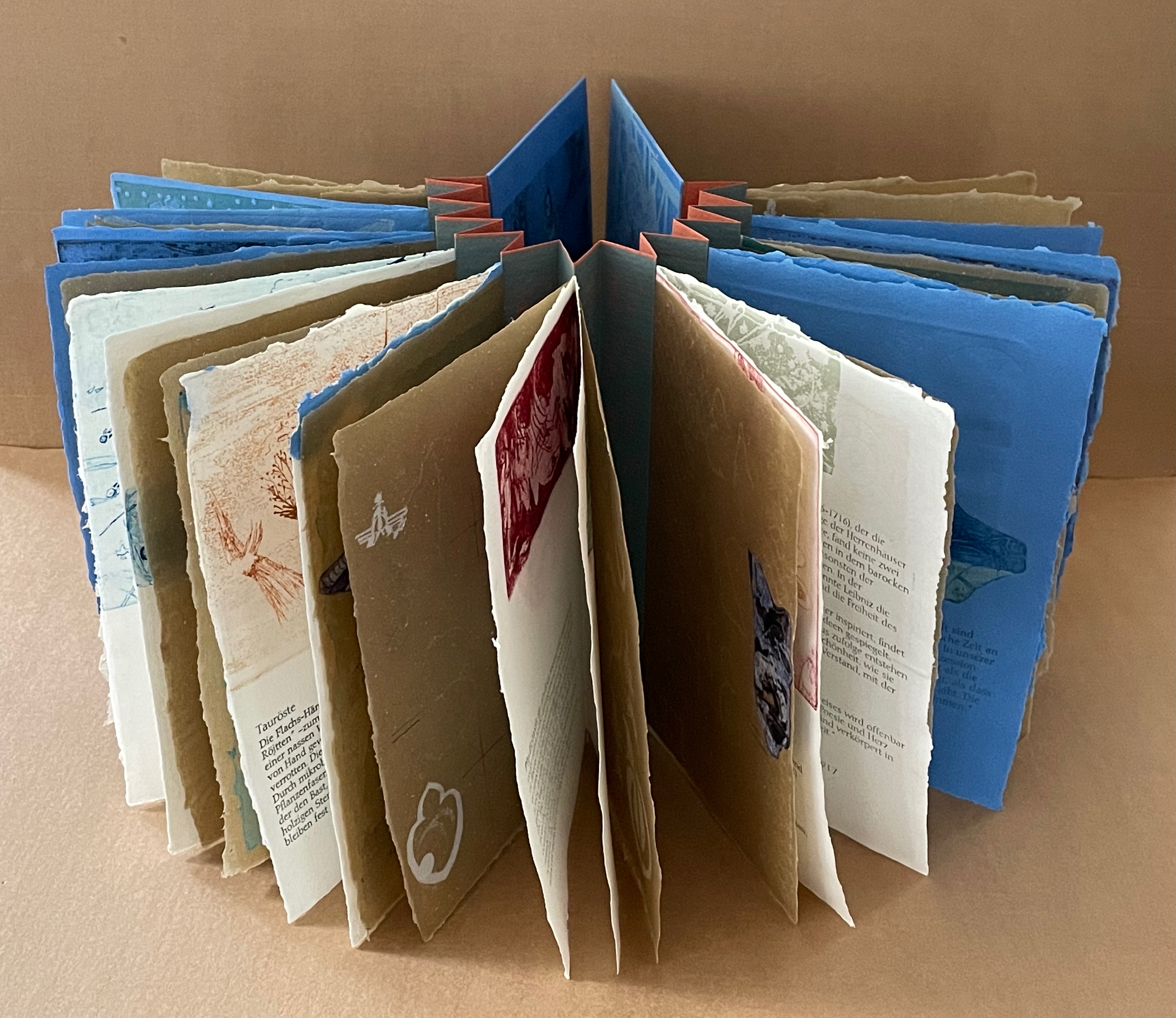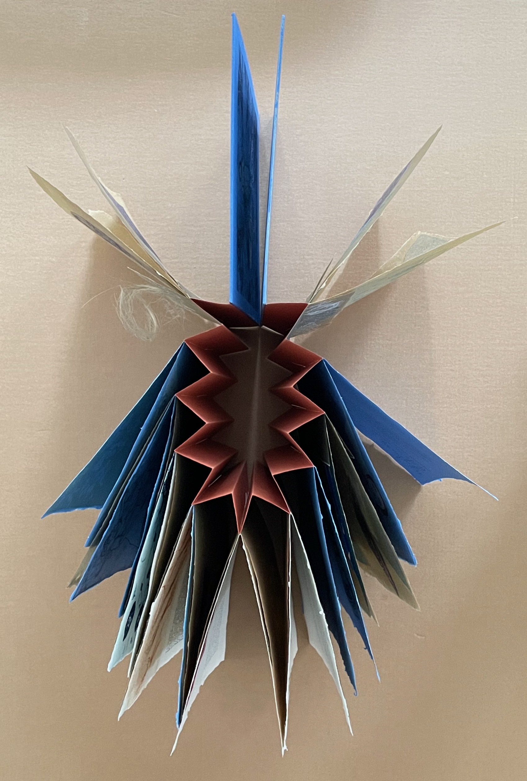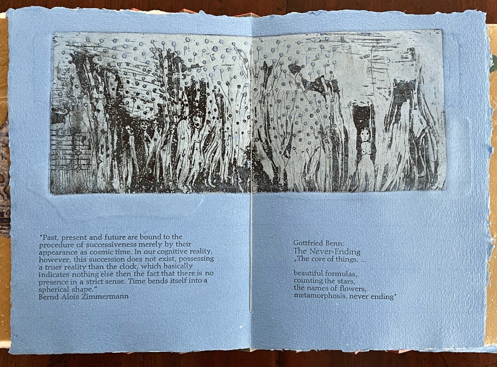 To organize and weave her motives together, Beisinghoff uses an accordion spine to whose peaks eleven sets of folios are sewn with linen thread. Three of the eleven are 4-page folios consisting of blue handmade paper. Another three 4-page folios consist of pure flax paper (handmade by John Gerard). The remaining five gatherings have 8-page folios, each consisting of a pure flax paper folio around a blue or plain one.