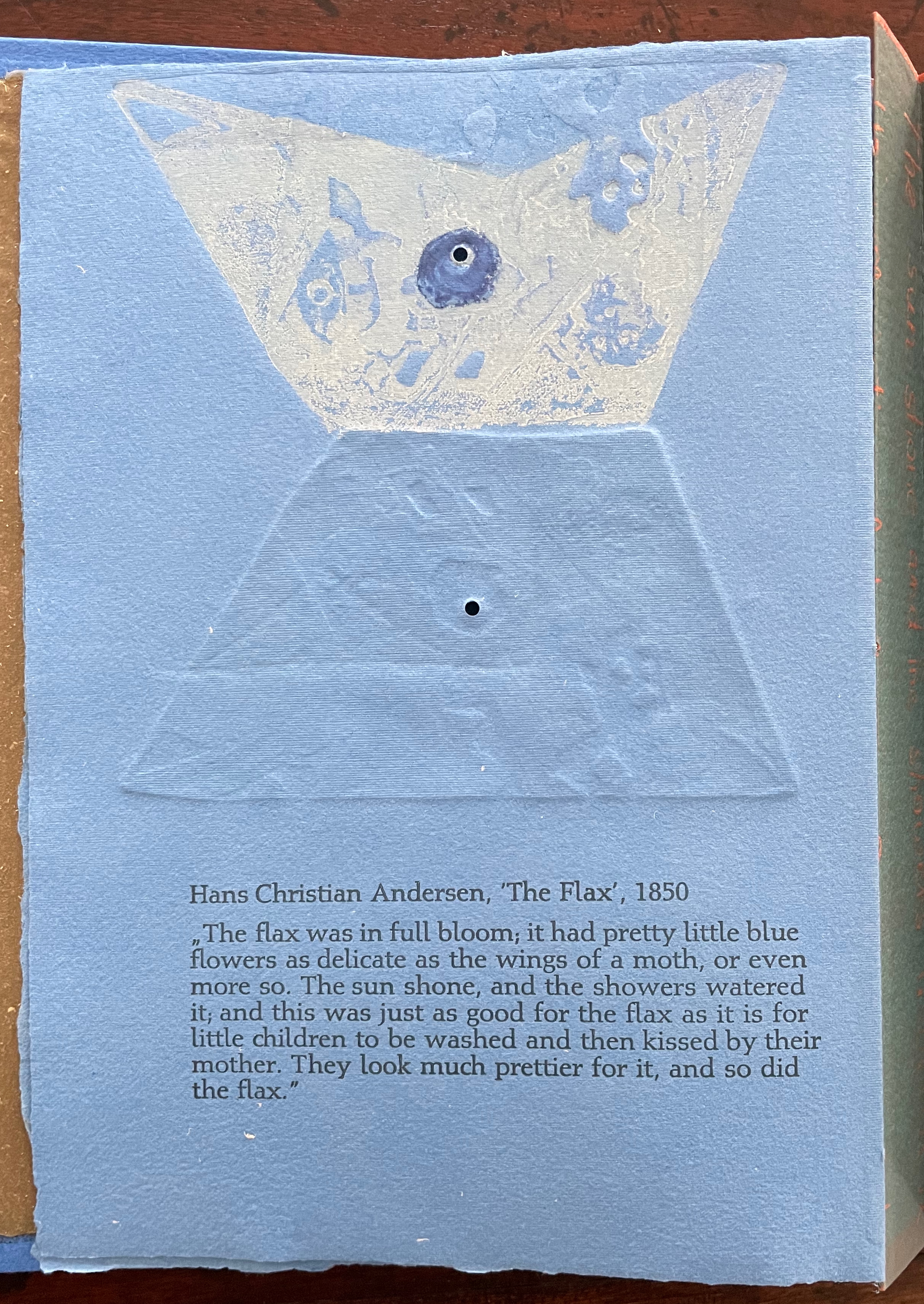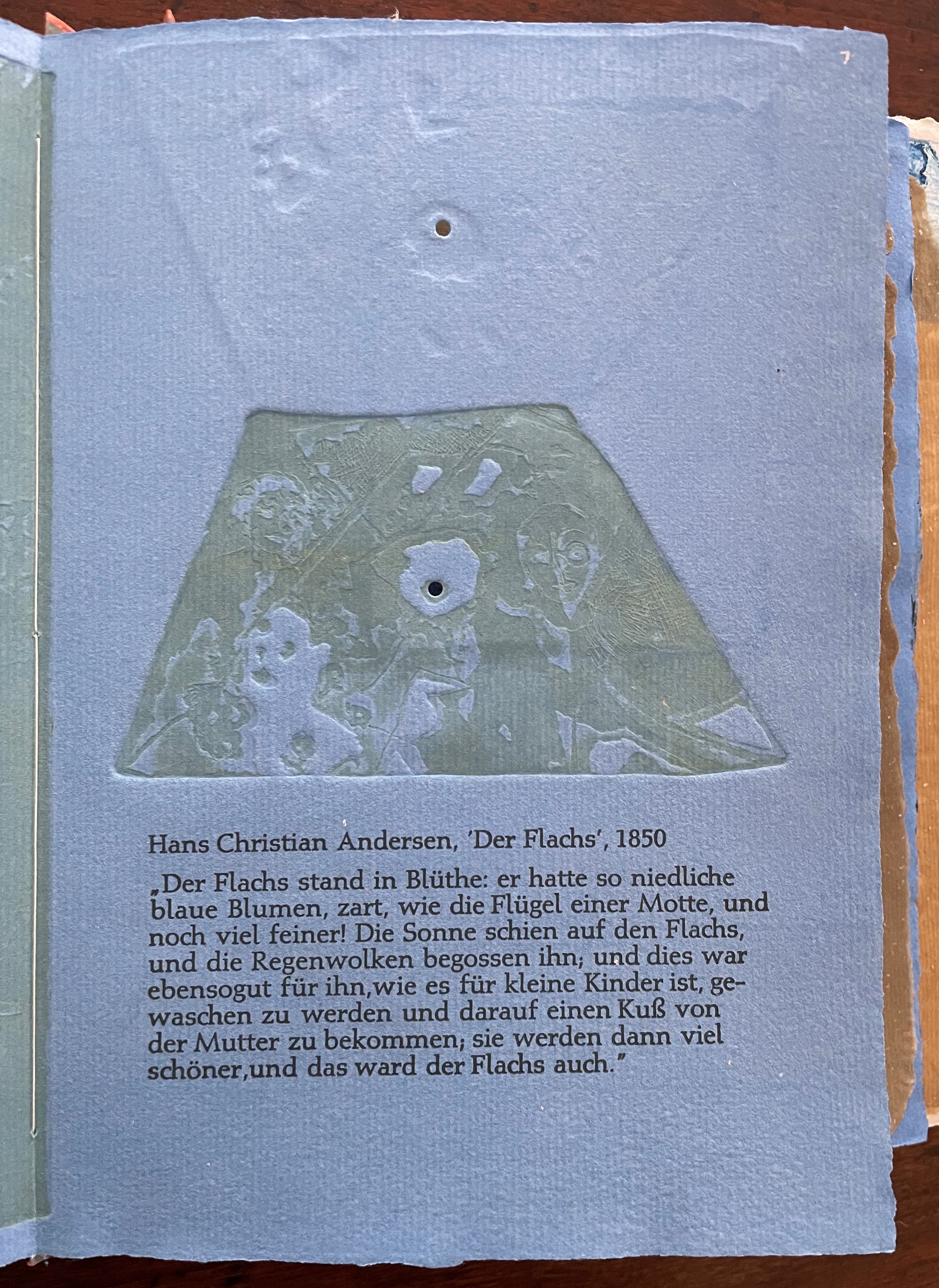 Familiarity with Hans Christian Andersen’s fairy tale Hørren /The Flax enhances appreciation of Barbara Beisinghoff’s Tau blau / Dew Blue. Andersen gives a voice to the plant that expresses its joy, pain, hope and observations at each stage of its blooming, being harvested, turned into linen and clothing then paper, and finally consigned to flames. The H.C. Andersen Centre offers Jean Hersholt’s translation of it here.