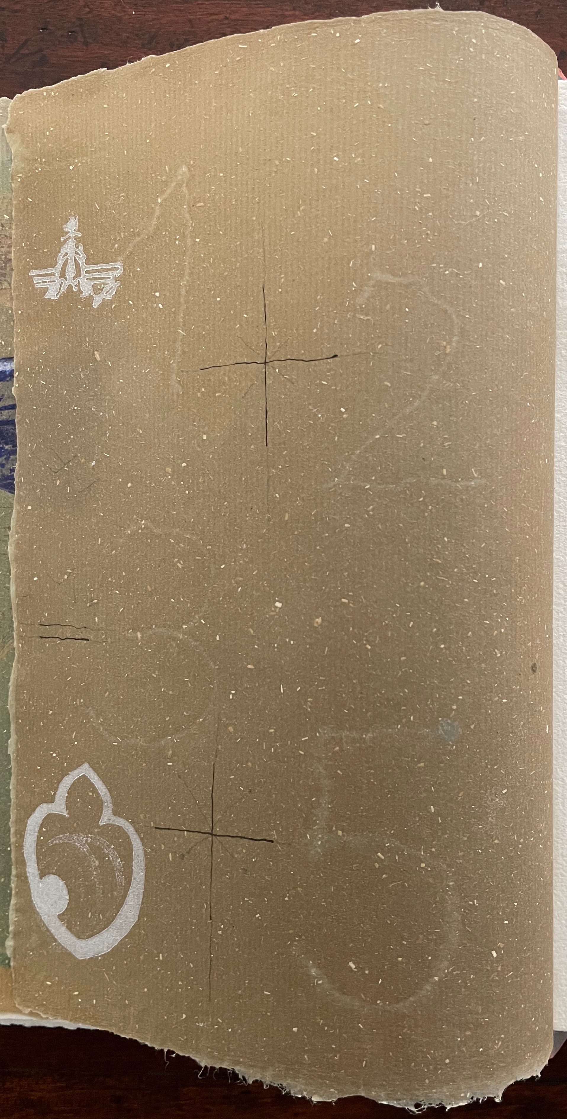 Below is the final folio of the work. Like the first, it is made completely of flax paper, but its center spread offers a fuller image: flax blossoms and stalks float in the foreground, and in the background is a sketch of Beisinghoff’s residence where she grows her flax. Like the Fibonacci spiral on the front and back covers, the first and last flax folios round out the work. But go back and listen for the hidden sound installations accompanying Dew Blue. Noticing Beisinghoff’s abstract musical notation, indulge yourself with recordings of a Swedish folk song (“Today is supposed to be the big flax harvest” here or here) to which the notation and phrases allude, and as the flax papers turn and wave on their accordion peaks, listen carefully for their musical rustle.