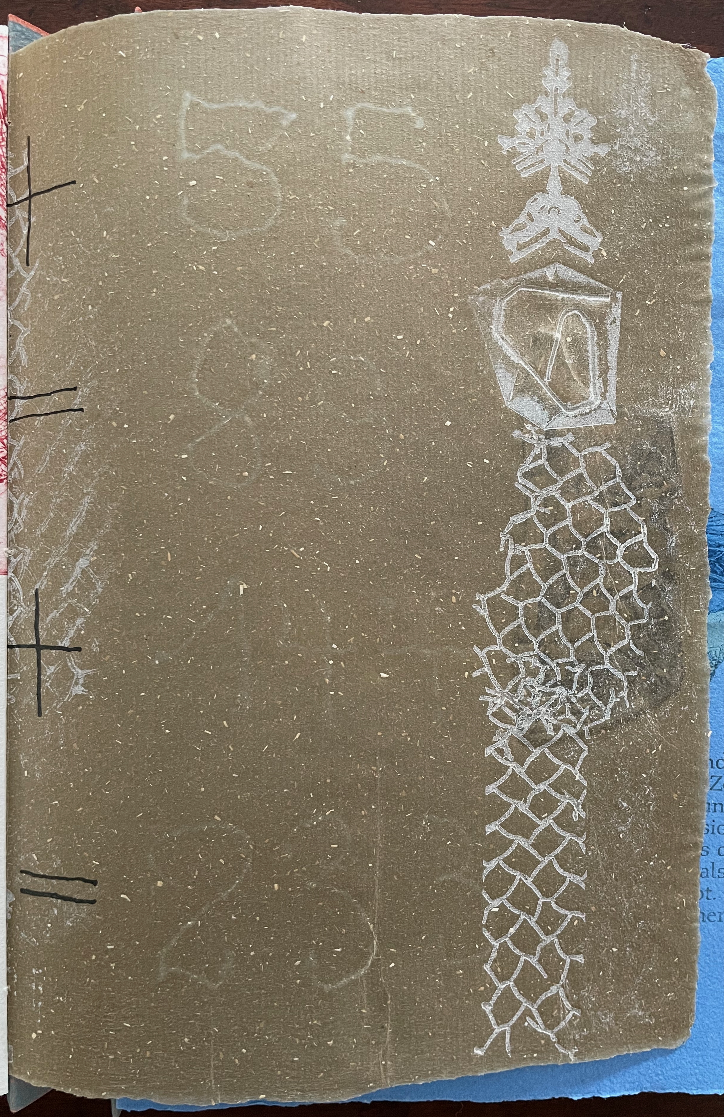 The front cover also announces another motif in those coils of thread below the young girl’s feet. Within the coils is the image of a Fibonacci spiral, which appears on the back cover and throughout the book in different ways. It can be found drawn and printed. It can be found in watermarks in the handmade paper. It can be found in the arrangement of florets in flax. Being a composite flower, flax blossoms display the spiral based on the Fibonacci sequence 1, 2, 3, 5 … 233, and so on. These numbers are waterjet-drawn on the pure flax paper below and explained in an entry printed on the adjacent plain handmade paper folio. By appearing on the book’s front and back covers, the spiral echoes the beginning and ending cycles of birth and rebirth the flax goes through in the folktale.