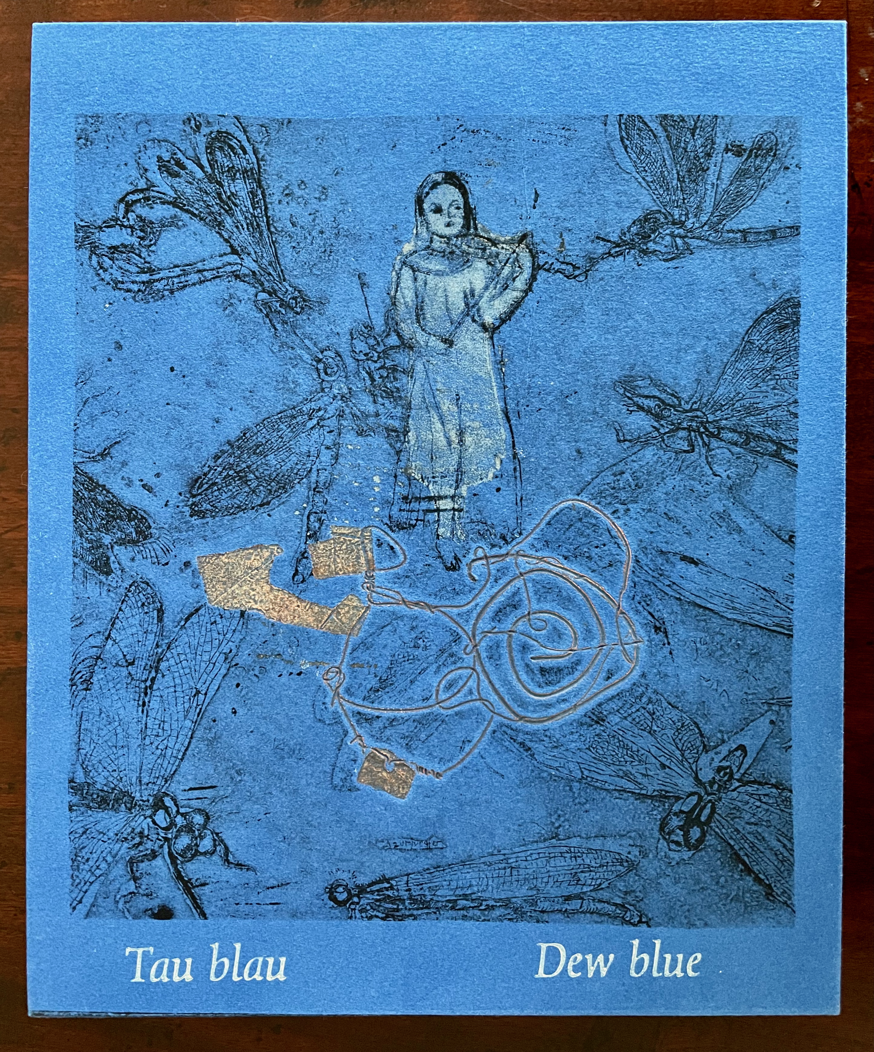 In a concerto, motives play off one another and develop. In Tau blau / Dew Blue, the motif of nature (the plant) plays off the motif of artifice and the manmade (the fairy tale, music, linen, paper, etc.). On the front cover (above), a young girl, surrounded by large damselflies, plays a fiddle or violin and seems to hover above a silver foil image of flax thread and tools for making it. In the spread above alongside the front cover, the specks rising over the staves and musical notes (a recurring motif in itself) recall the tale’s final passage in which the bundle of papers (made from linen rags) is cast into a fire: