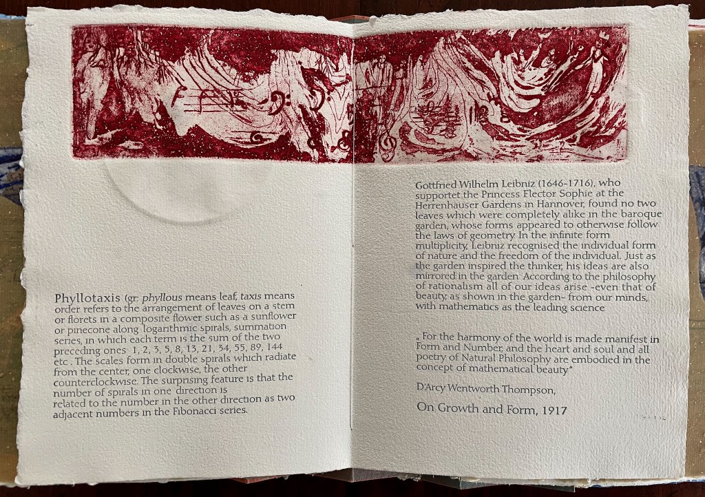 Description of the Fibonacci spiral side by side with quotation from Thompson’s On Growth and Form (1917), drawing on Leibniz’s Rationalist philosophy.