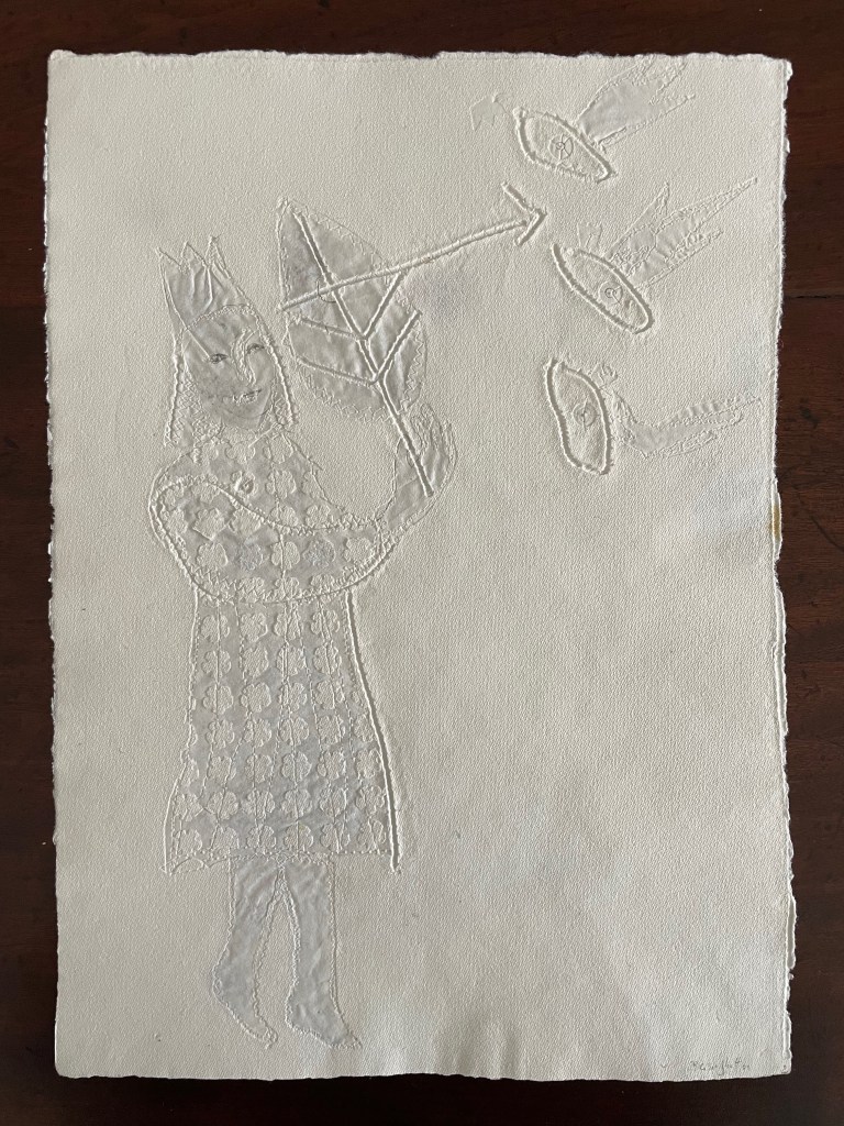 This art by watermarking recalls that of other artists in the collection: Fred Siegenthaler and Gangolf Ulbricht, in particular. The technique of pulp painting also finds other practitioners in the collection: Pat Gentenaar-Torley, John Gerard, Helen Hiebert, Tim Mosely, Maria G. Pisano, Taller Leñateros, Claire Van Vliet and Maria Welch. Beisinghoff’s blend of embroidered watermarks, waterjet marking and pulp painting, however, creates a bas relief effect that is echoed only in the collection’s works by Mosely, Taller Leñateros and Van Vliet, albeit achieved differently. These workings of the substrate — as material, color, surface, and even narrative — with the workings of book structure is one of the more magical locations of book art. It is perfect for Beisinghoff’s metamorphical interpretation of the Andersen/Grimm fairy tale.