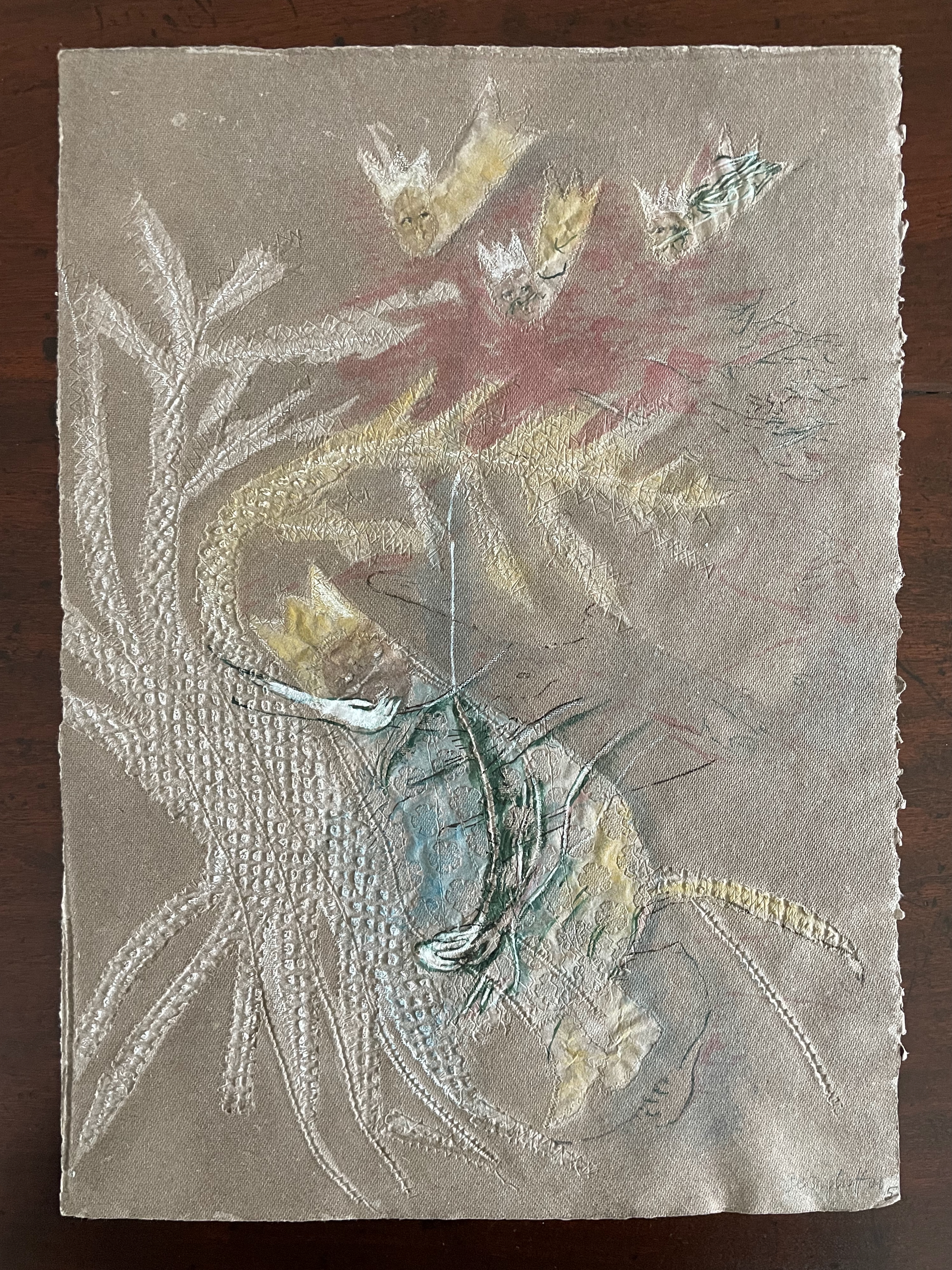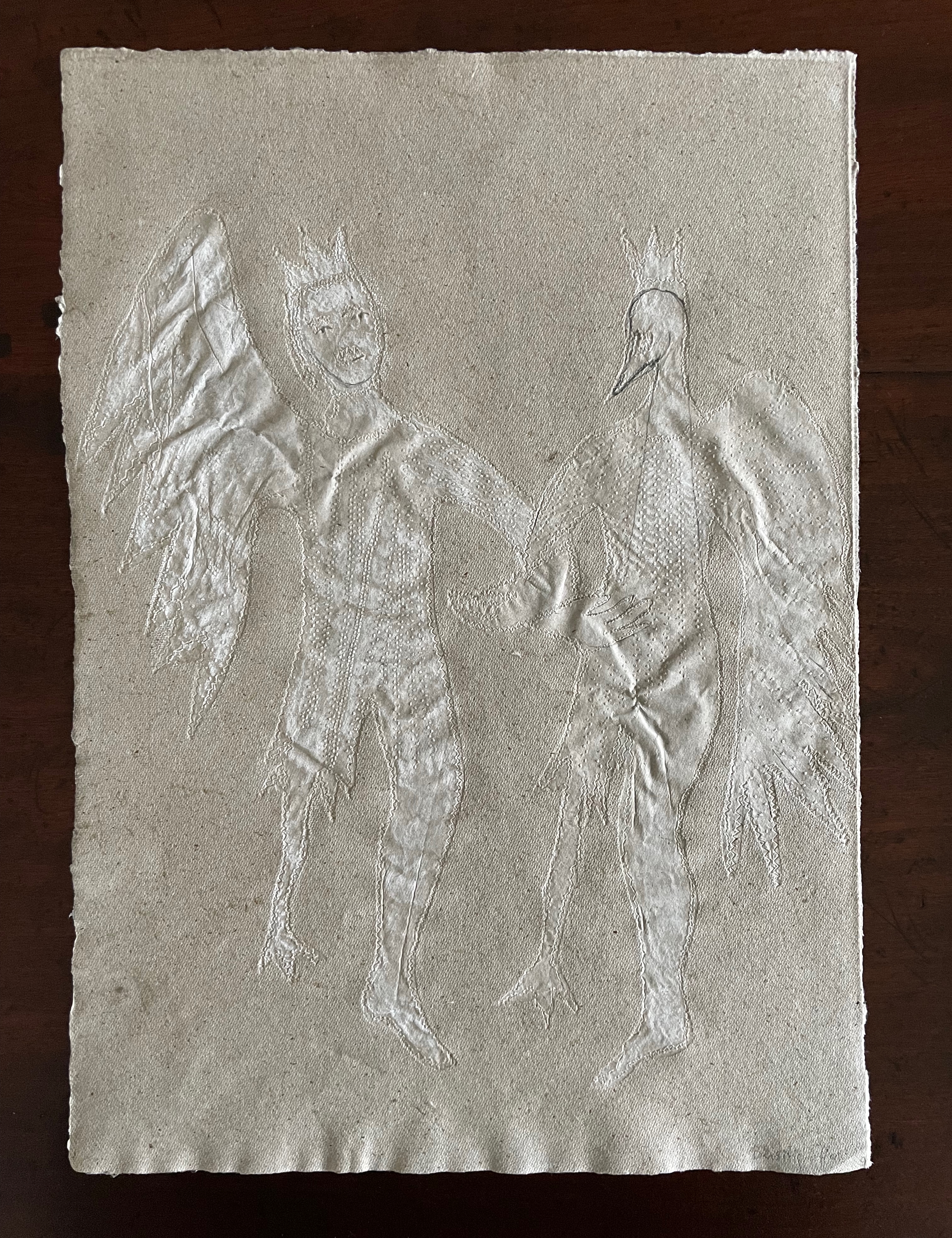 To match Elisa’s effort with stinging nettles, Beisinghoff enlisted the collaboration of Johannes Follmer, the owner of a paper mill. Together they obtained cultivated stinging nettles from the Institute for Applied Botany in Hamburg, cut the fibers, left them to rot, boiled them into a pulp, mixed that with water in a vat, scooped up layers in a sieve embroidered with illustrations, couched the sheets, then pressed and dried them into paper. Beisinghoff applied further drawings with a water jet, watercolor and pencil to the watermark-embossed sheets to illustrate aspects of the tale. To present the Andersen/Grimm “collage”, Beisinghoff had the type set and printed at the Gutenberg Museum. Andersen is printed in light green and Grimm in light red on seven numbered translucent sheets and interleaved with the nine folios of paper art (two more translucent sheets carry the cover page and colophon). To wrap the folios together, Beisinghoff made an embossed chemise or “feather dress” of pure nettle fiber, which could represent Andersen’s description of the brothers’ blowing off each other’s feathers every evening when the sun has set or one of the shirts that their sister makes to break their spell.