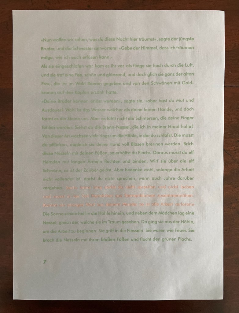 “The King’s little daughter was standing in the cottage room, playing with a green leaf, for she had no other toys. She pricked a hole right through the leaf, looked up at the sun, and there it was, she saw the clear eyes of her brothers, but every time the warm rays of the sun shone on her cheeks, she thought of all their kisses.” Translation with DeepL.