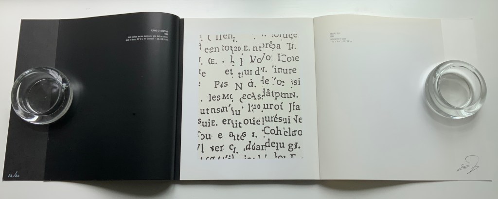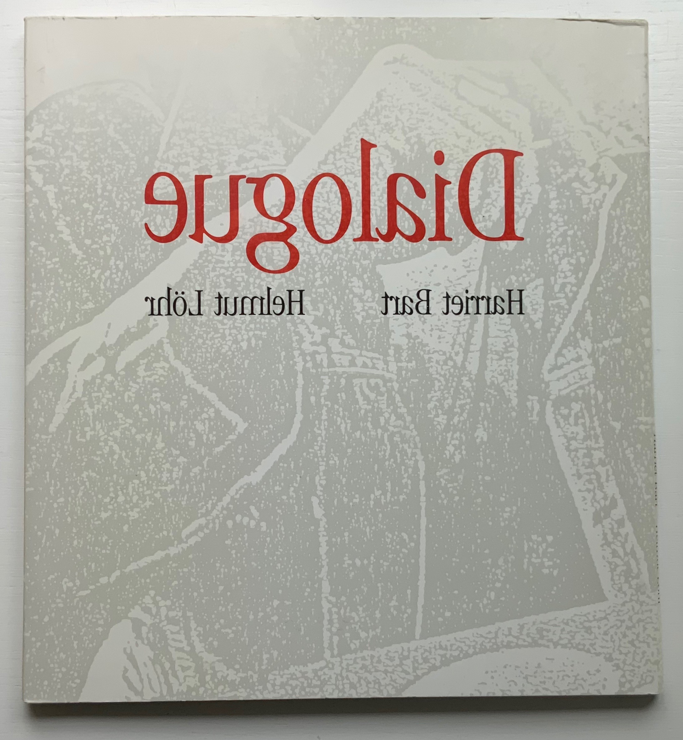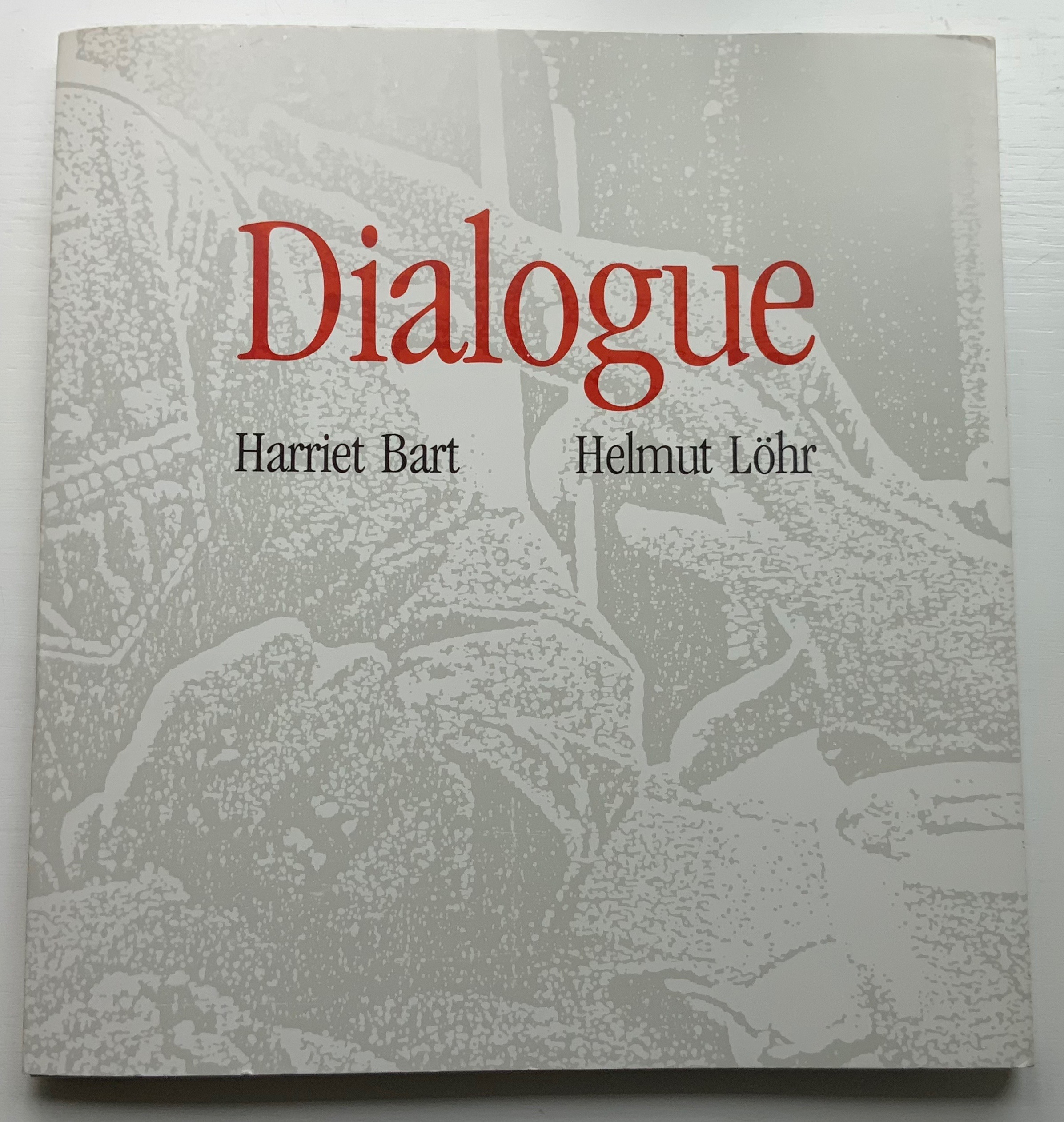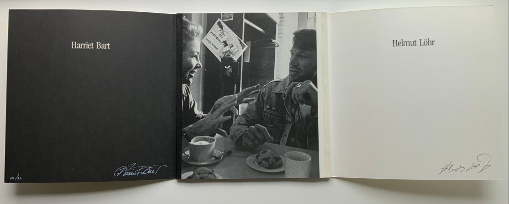Befitting this book’s title, the binding is not dos-à-dos but rather vis-à-vis or face to face. When the French fold cover parts left and right, the black binding tape on the left and white on the right appear with the photo of the two artists in discussion over coffee and pastry. The interleaving gatefold design enacts a dialogue of pictured artworks and, in doing so, becomes a work of book art itself. How appropriate for Harriet Bart and the late Helmut Löhr, both of whom count artists’ books among their multimedia output.