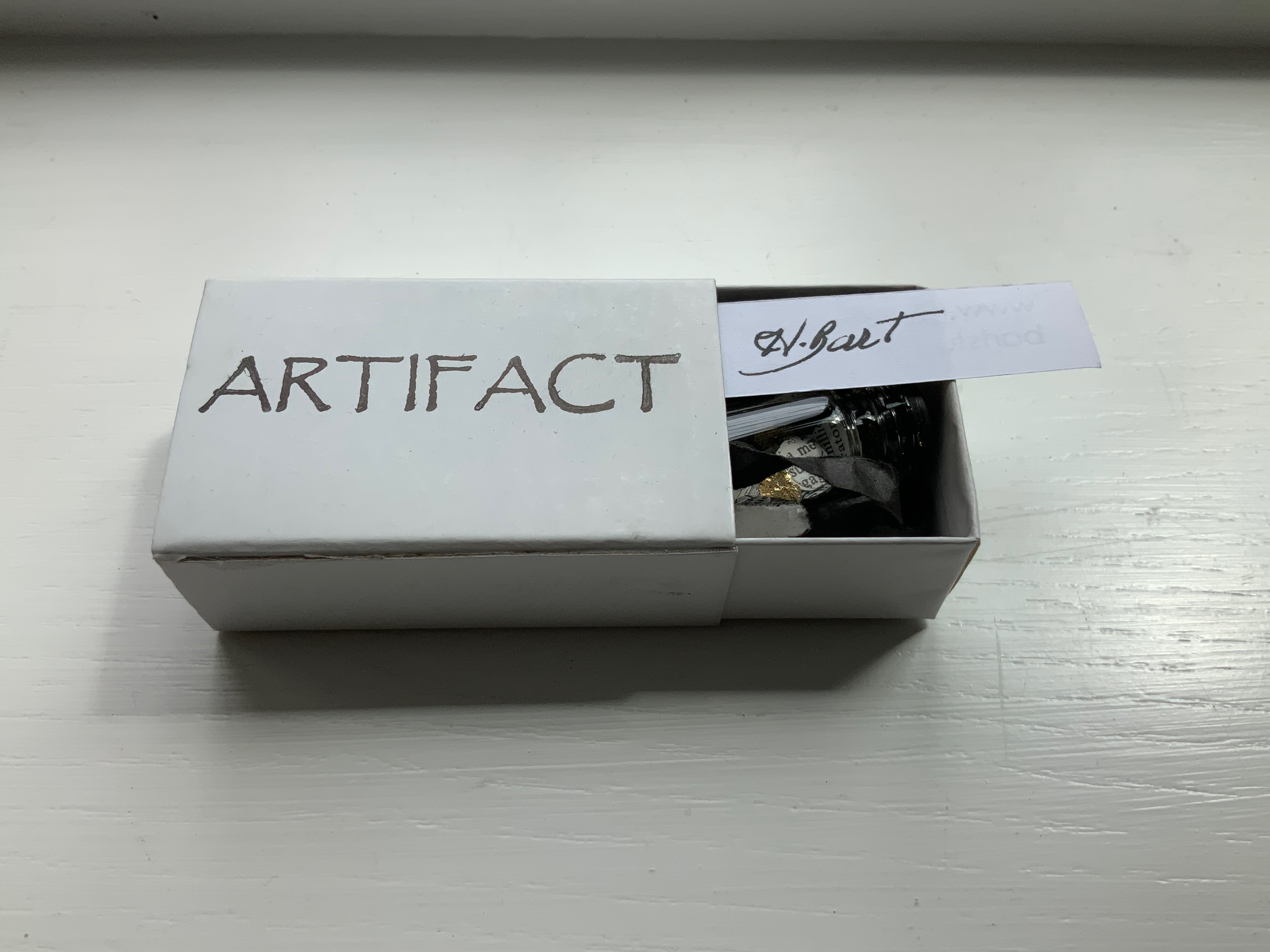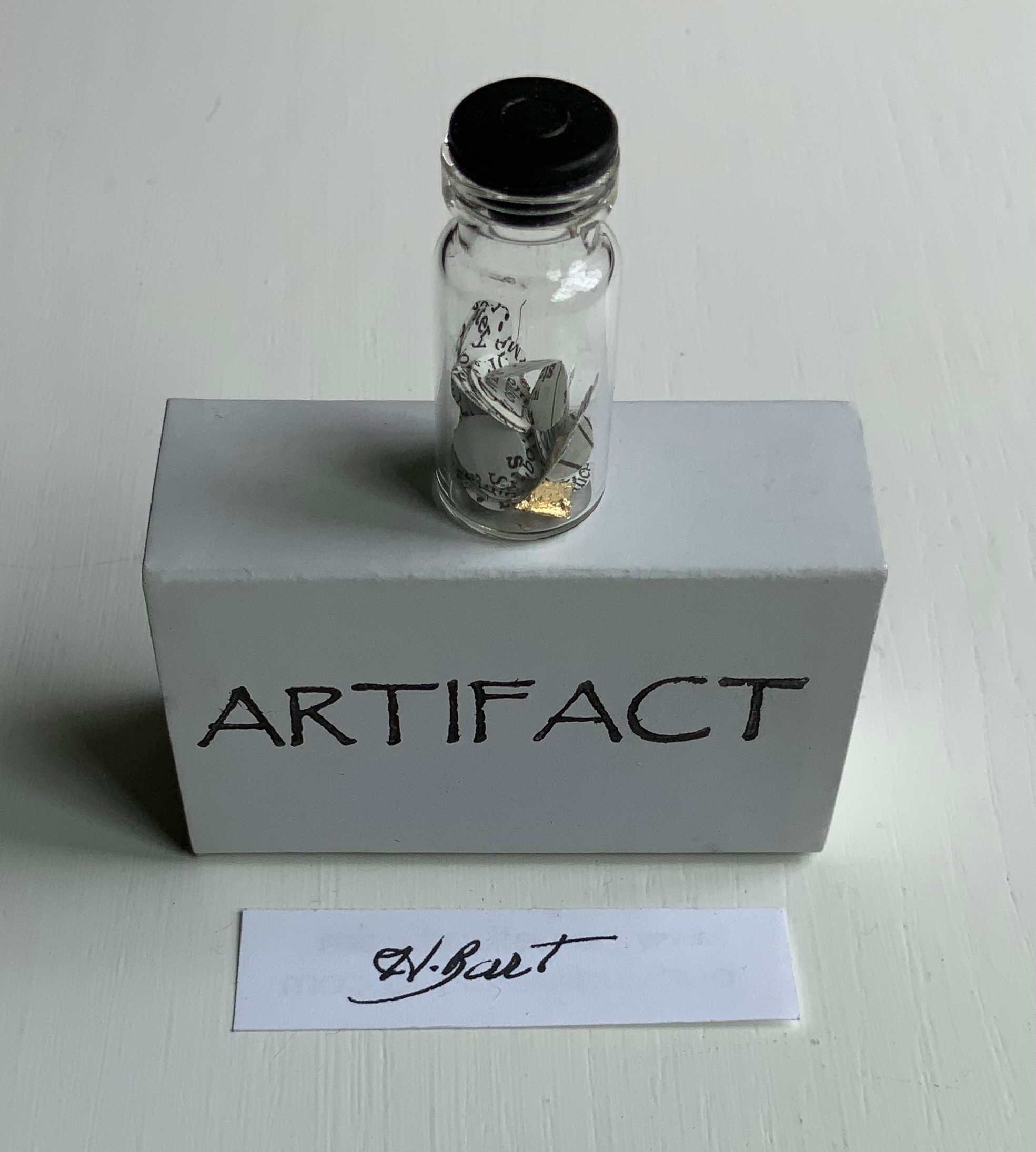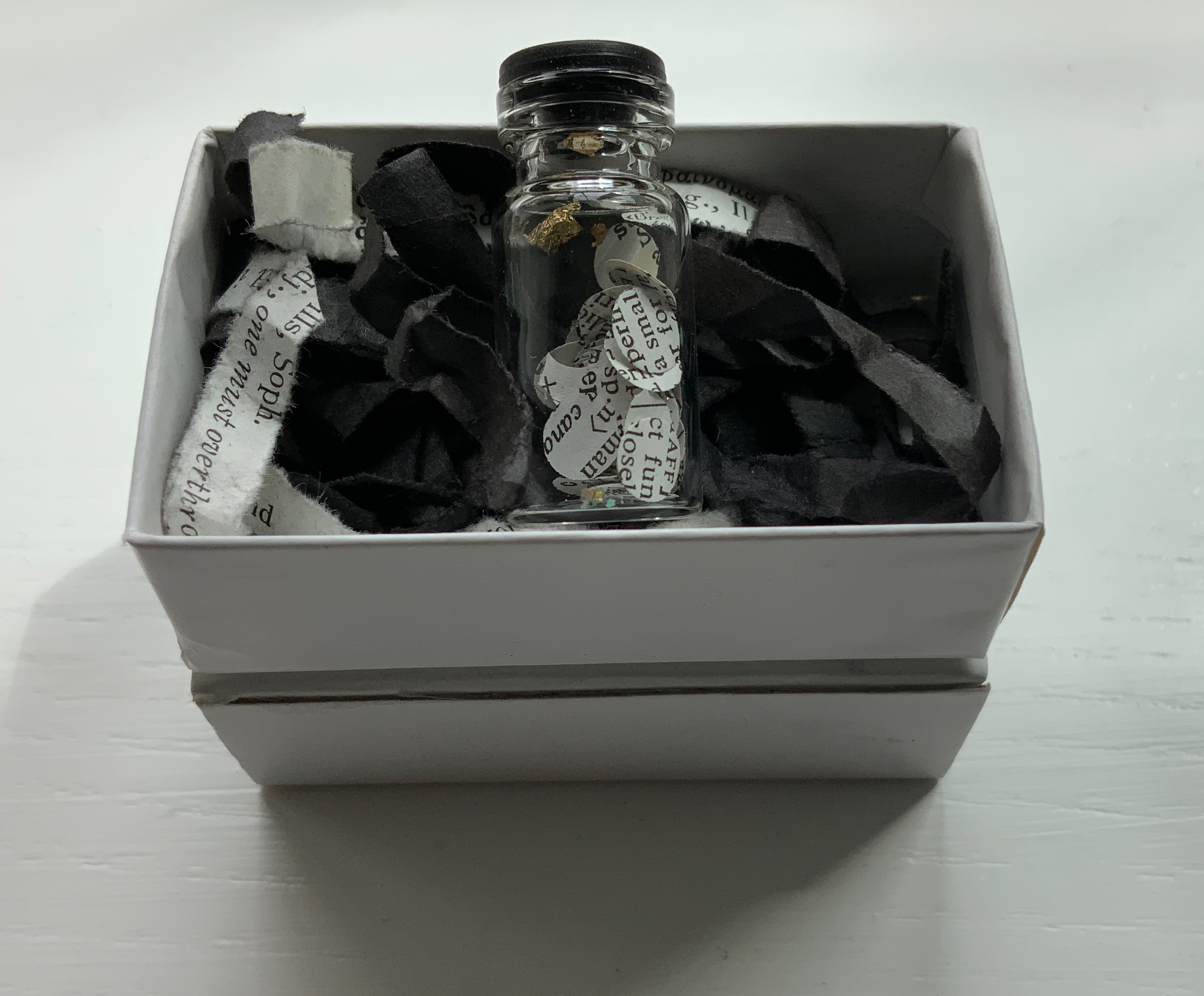 Artifact (2022) Harriet Bart Matchbox enclosing black-capped bottle of fragments of gold leaf, paper disks hole-punched from a reference work, resting on shreds from a dictionary and black tissue paper. Box: H40 x W63 x D24 mm. Bottle: H35 x D9 mm. Acquired from the artist, 12 April 2022. Photos: Books On Books Collection.