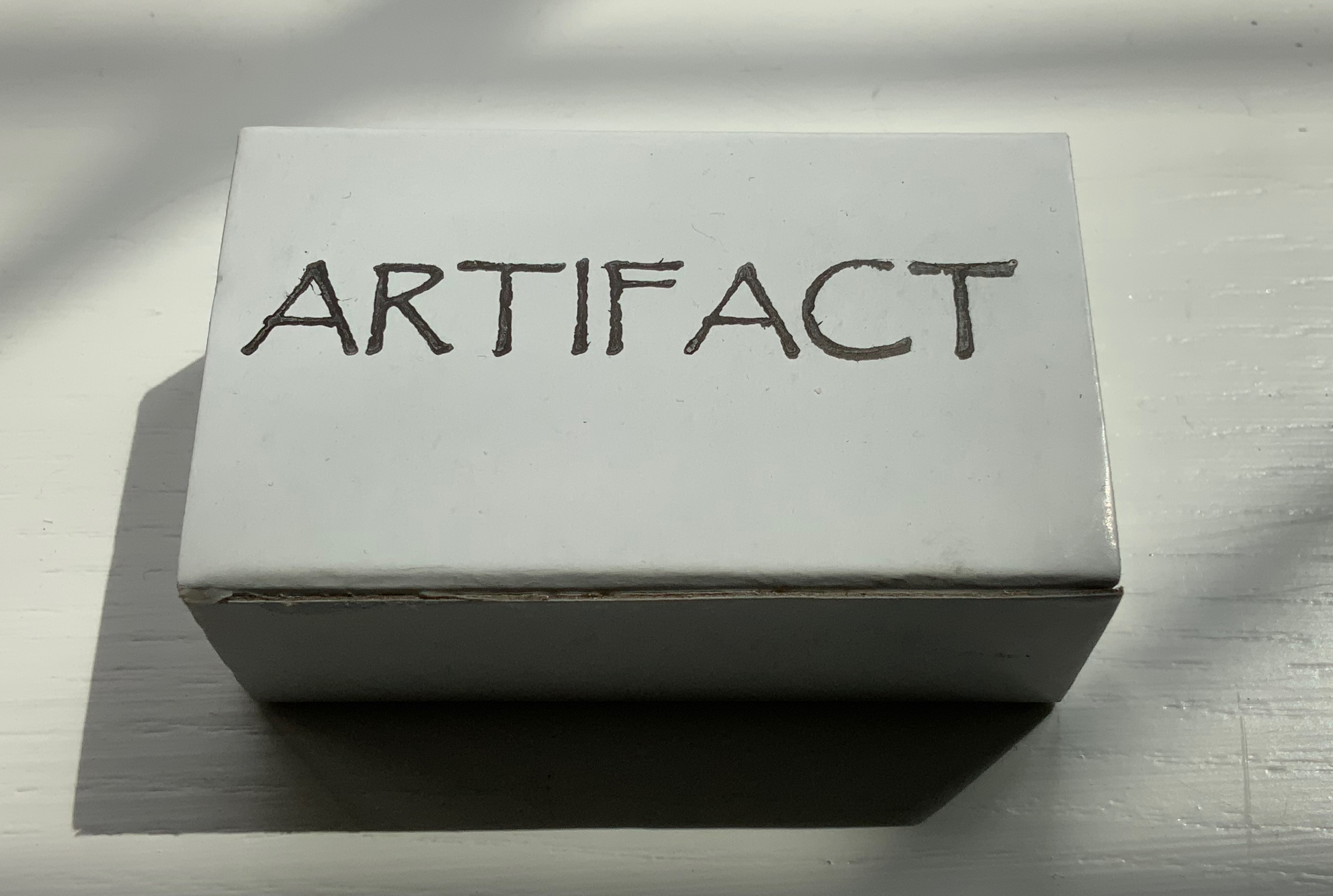 Siberell, Anne Hicks. Wotan (1984). Colored and cast plasters imbedded with found objects including photographic slide mount altered with paint, packaging labels, and ruler fragment; with wood box and cover and elastic band closure containing ink on vellum manuscript poem. Unsigned. 8” x 5 15/16” x 1 3/8”.