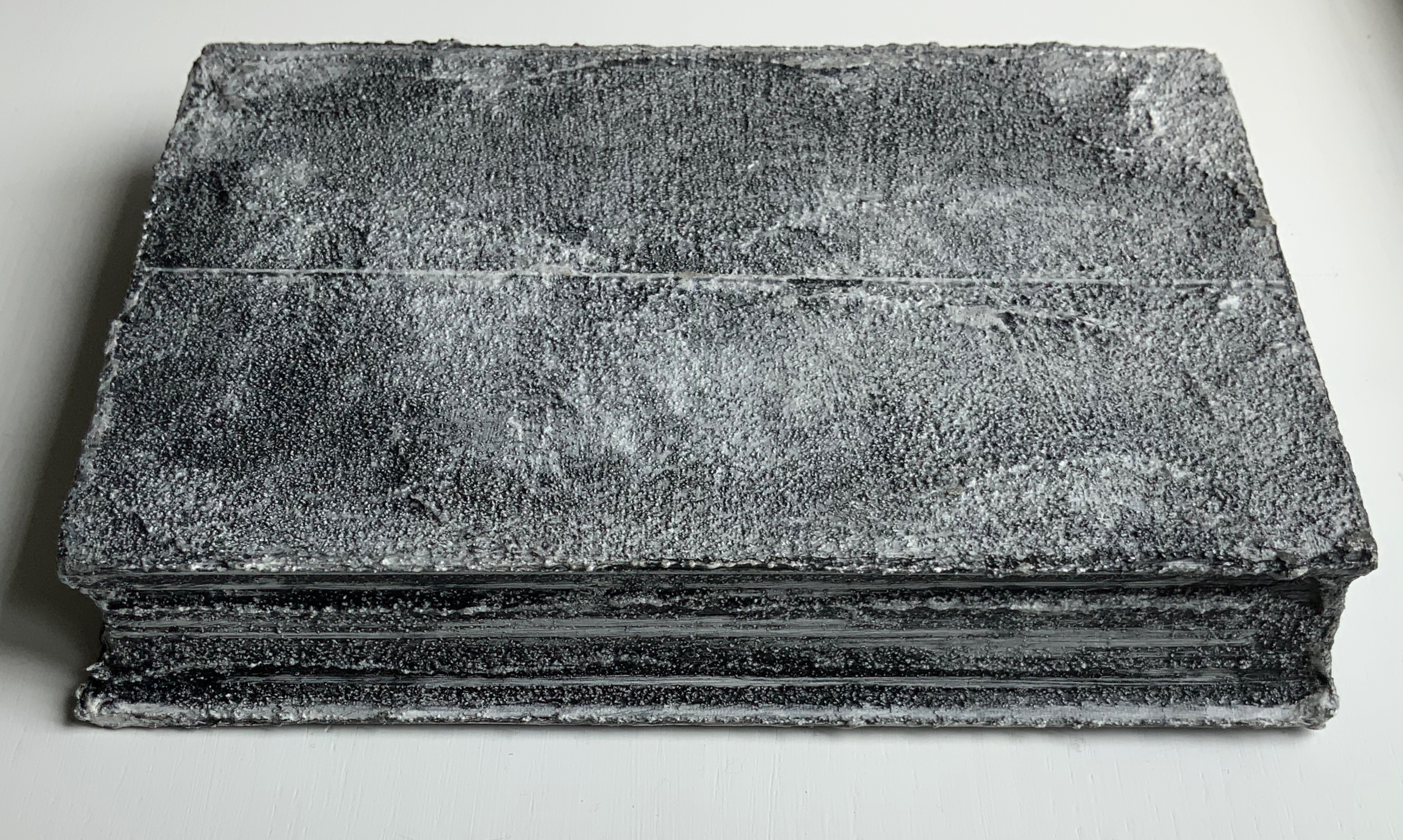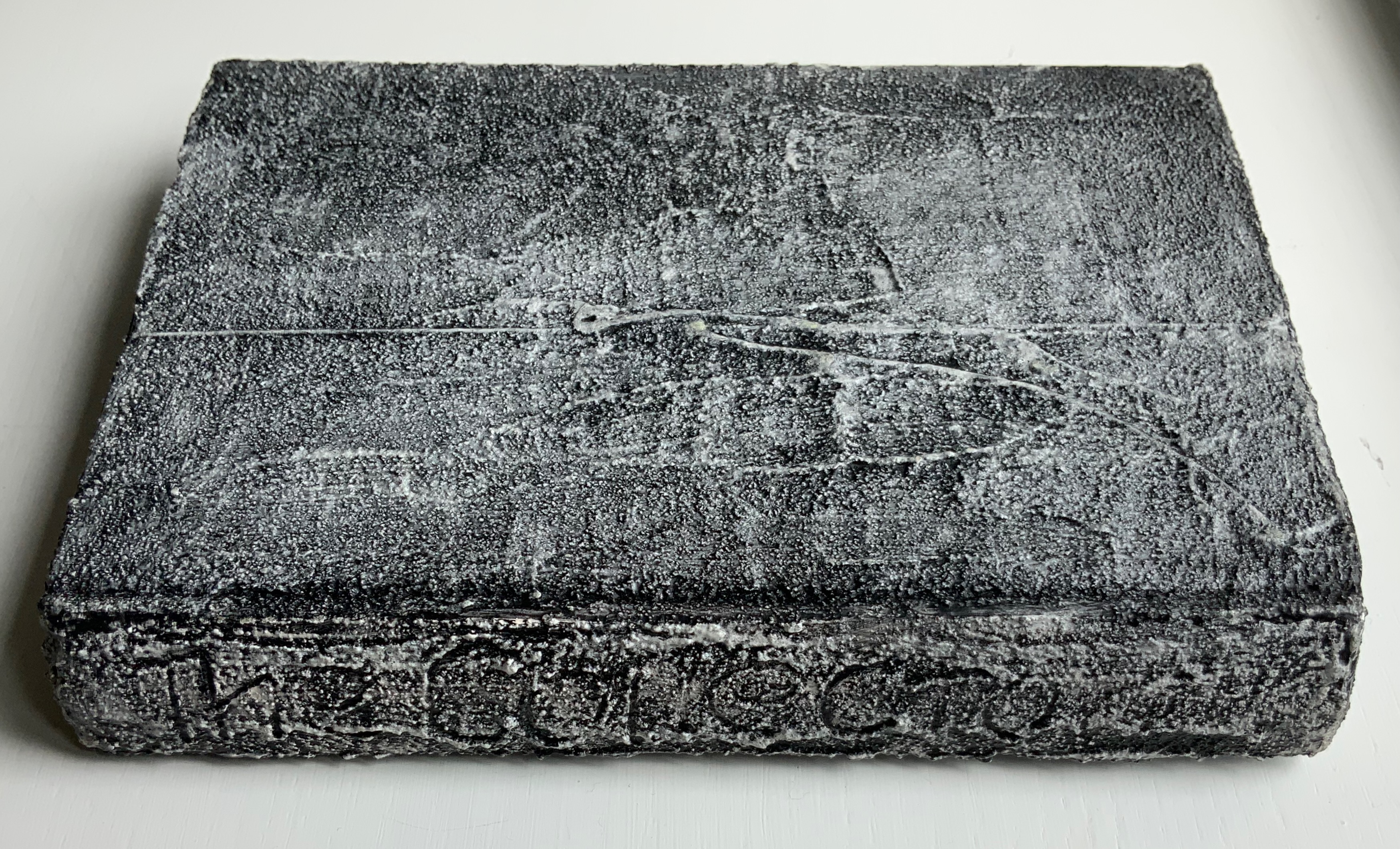 Some of Algardi’s works can be seen here and more extensively and clearly in the online version of Ubeir Peeters’ book Alessandro Algardi (2006), pages 112-20 in particular. As a maquette, L’Immagine della scrittura (“The image of writing”) would have required the viewer to project in the mind the executed work. Algardi’s work ranges widely in materials: acrylic, oils, cementite, titanium, vinyl tempera, emulsified canvas and from large paintings to oversized and lesser books constructed of overpainted card and even plexiglas in various bindings, including the accordion. His constant subject (the written word) and use of impasto make Algardi’s work distinctive.