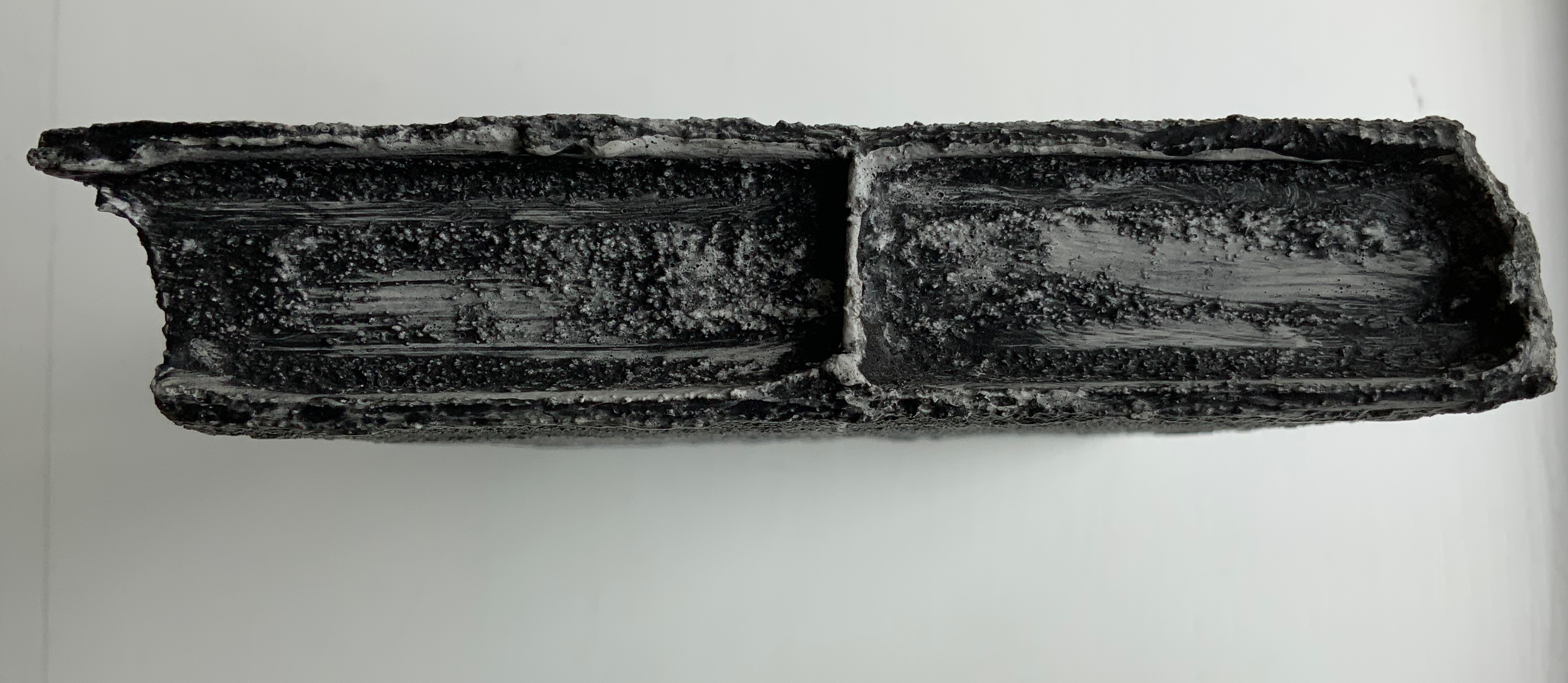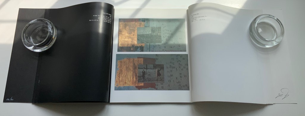 No online image seems available, and the one in the catalogue is black and white. Framed on the back wall of the page, it hangs there like a religious diptych. This work became the second in the M.A.D. trilogy (matches, ashes, dust), and full-color images of Ashes and the trilogy have been provided here by the artist. These can also be seen in full color and context in Beube’s Breaking the Codex (New York: Etc. Etc. The Iconoclastic Press, 2011), p. 186.