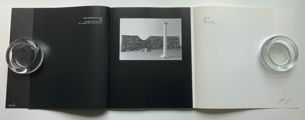 Published in conjunction with Bart’s book exhibition at the Driscoll Babcock Gallery in New York, this booklet, printed full color on high gloss paper, divides into three parts: commissions, installations and objects/books. It presents detailed views and spreads of each, but as they are not captioned or dated, this is more a photobook than catalogue. It demonstrates the artist’s breadth from the large-scale to the delicate from Double Ode (1995), a work commissioned by Doubleday Book & Music Clubs, Inc., to Tear Vials (2012), which look like containers for the tears of Elizabeth Bishop’s “Man-Moth“, who, if carefully watched, will hand over his only possession, a tear “cool as from underground springs and pure enough to drink”.