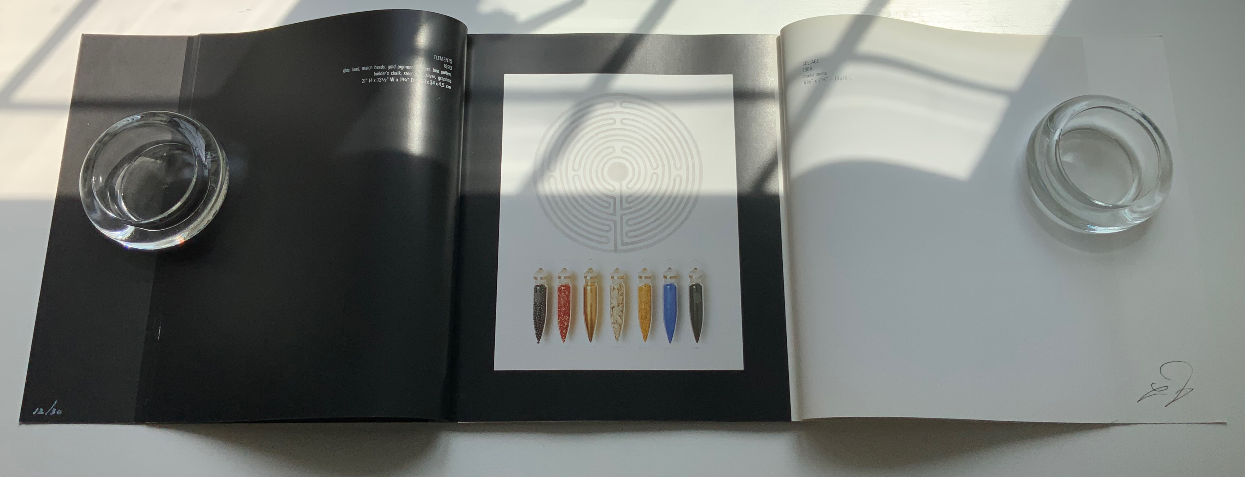 Every December for the past twenty years, the artist Harriet Bart, creator of the winter projects, has been making and sending multiples. These multiples echo her larger unfinished works. There are similarities, particularly in her use of repurposed materials, felt, shells, gold leaf, texts on paper, cords, and small boxes. These multiples serve as a holiday greeting for sixty or more friends and colleagues … The artist calls these multiples Visual Objects/Poems.