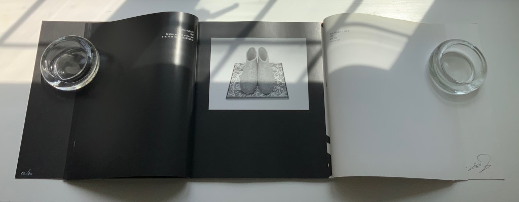 With its flag-stuffed gloves punning on its title, The Diplomat’s Handbook hands us the catalogue’s first “book-alluding object“. The use of gloves finds later echoes in the work of Jules Allen (below):